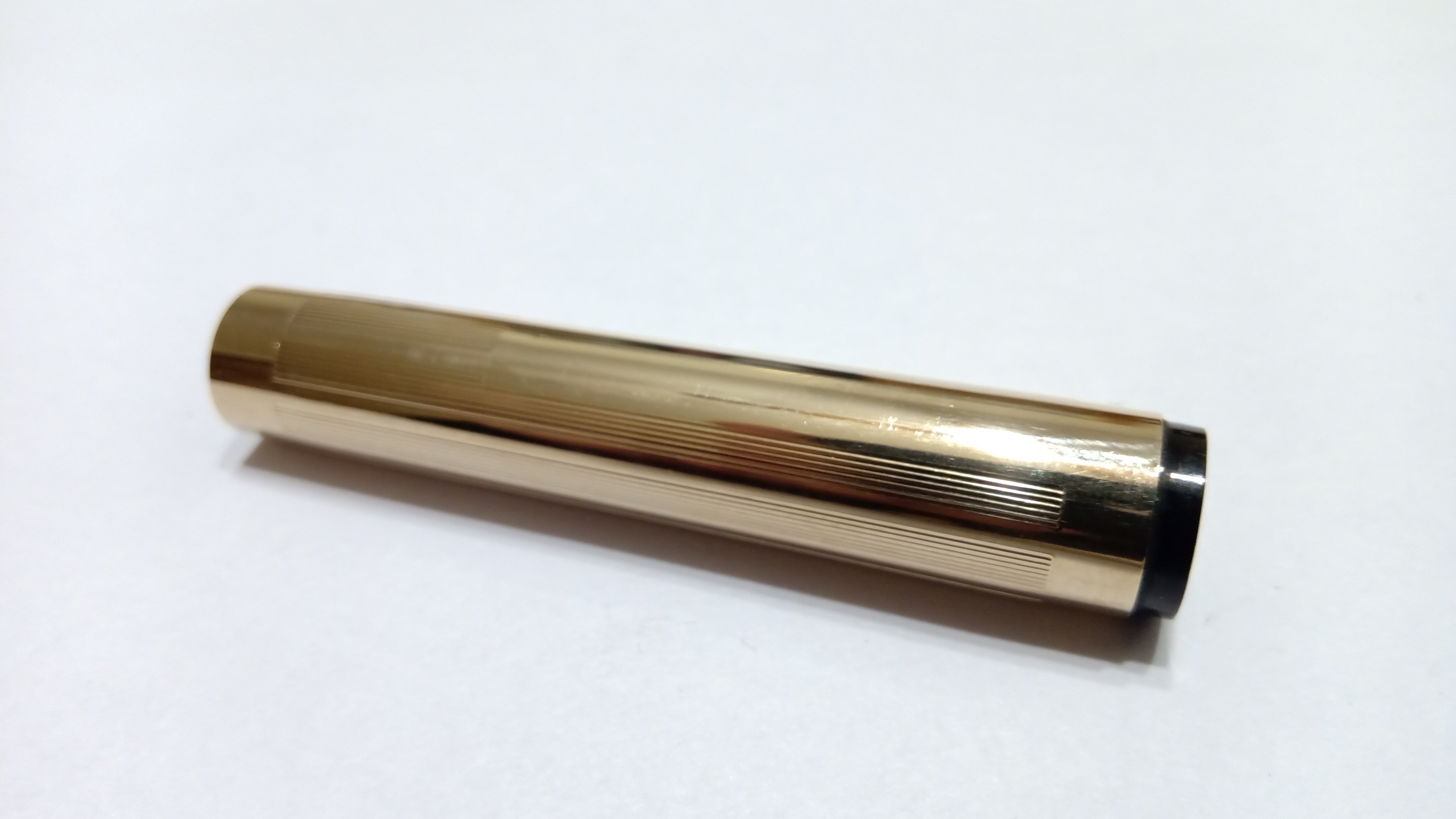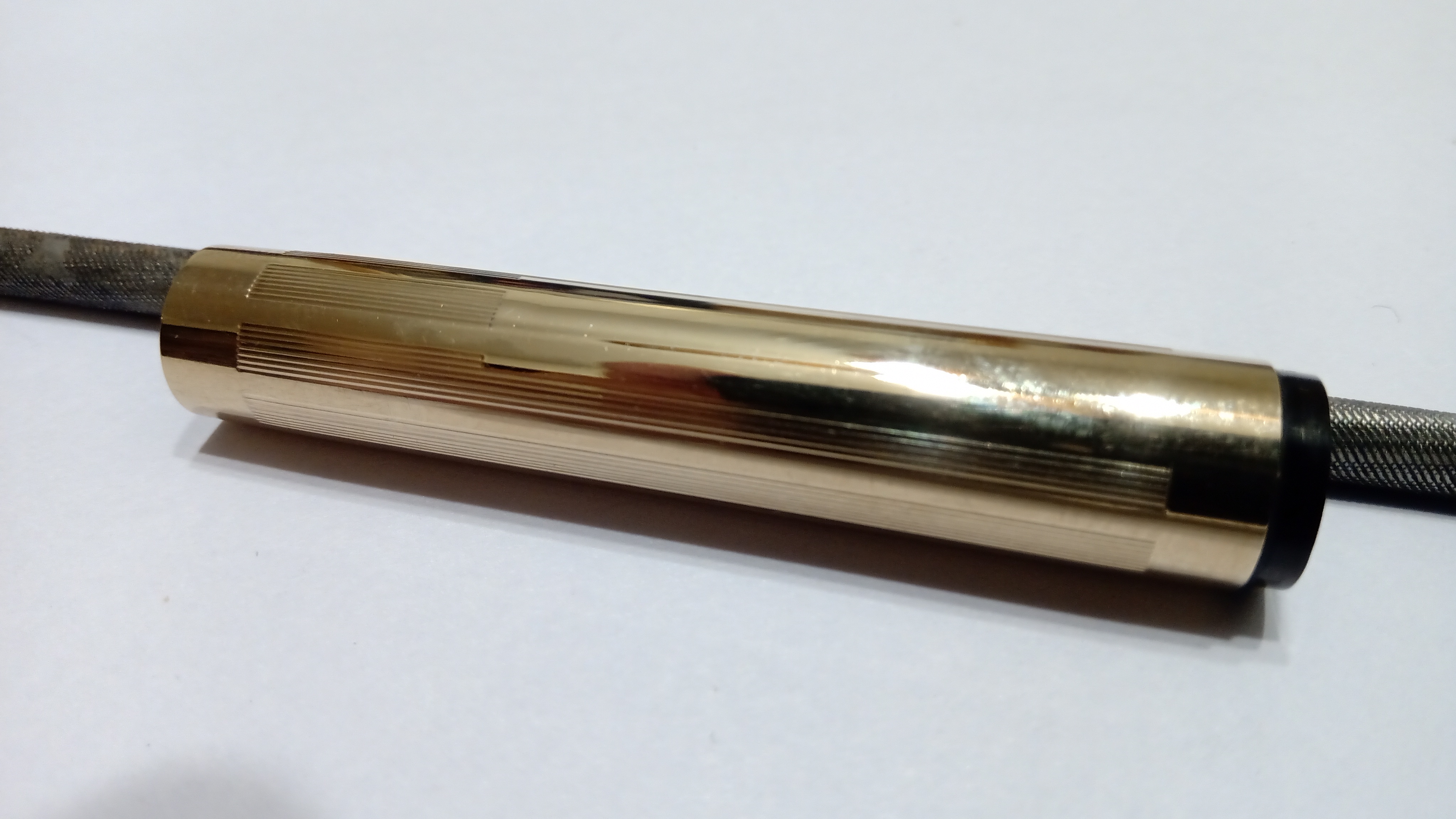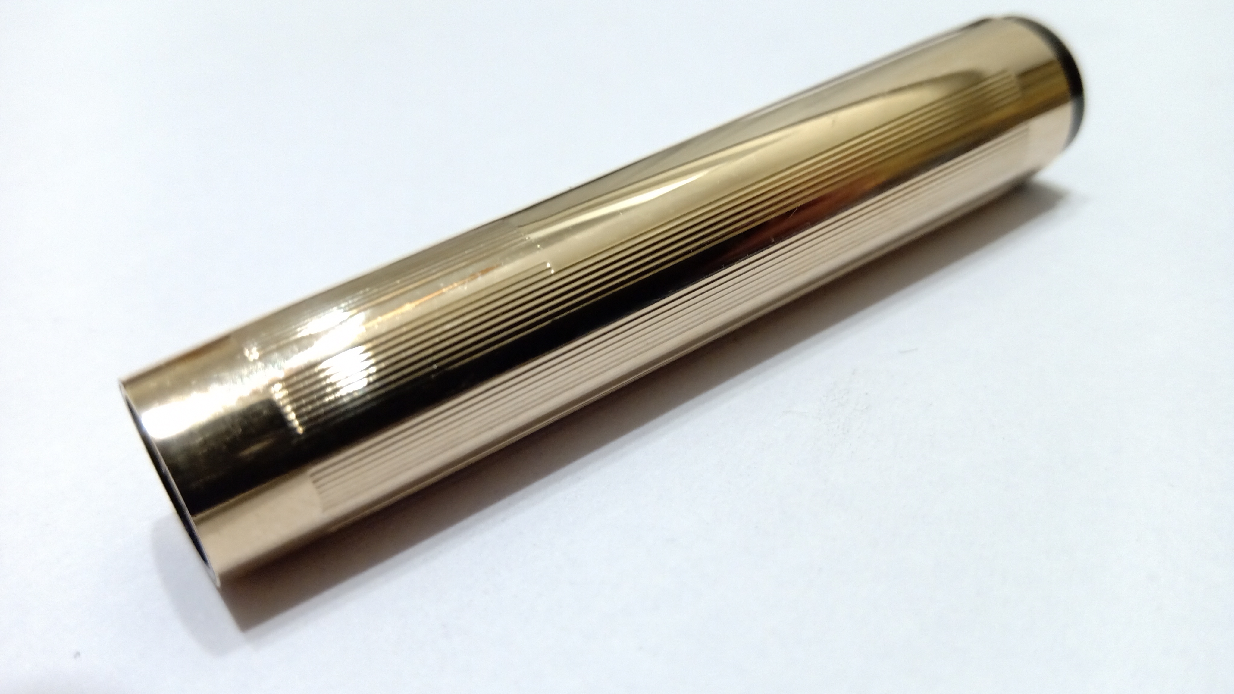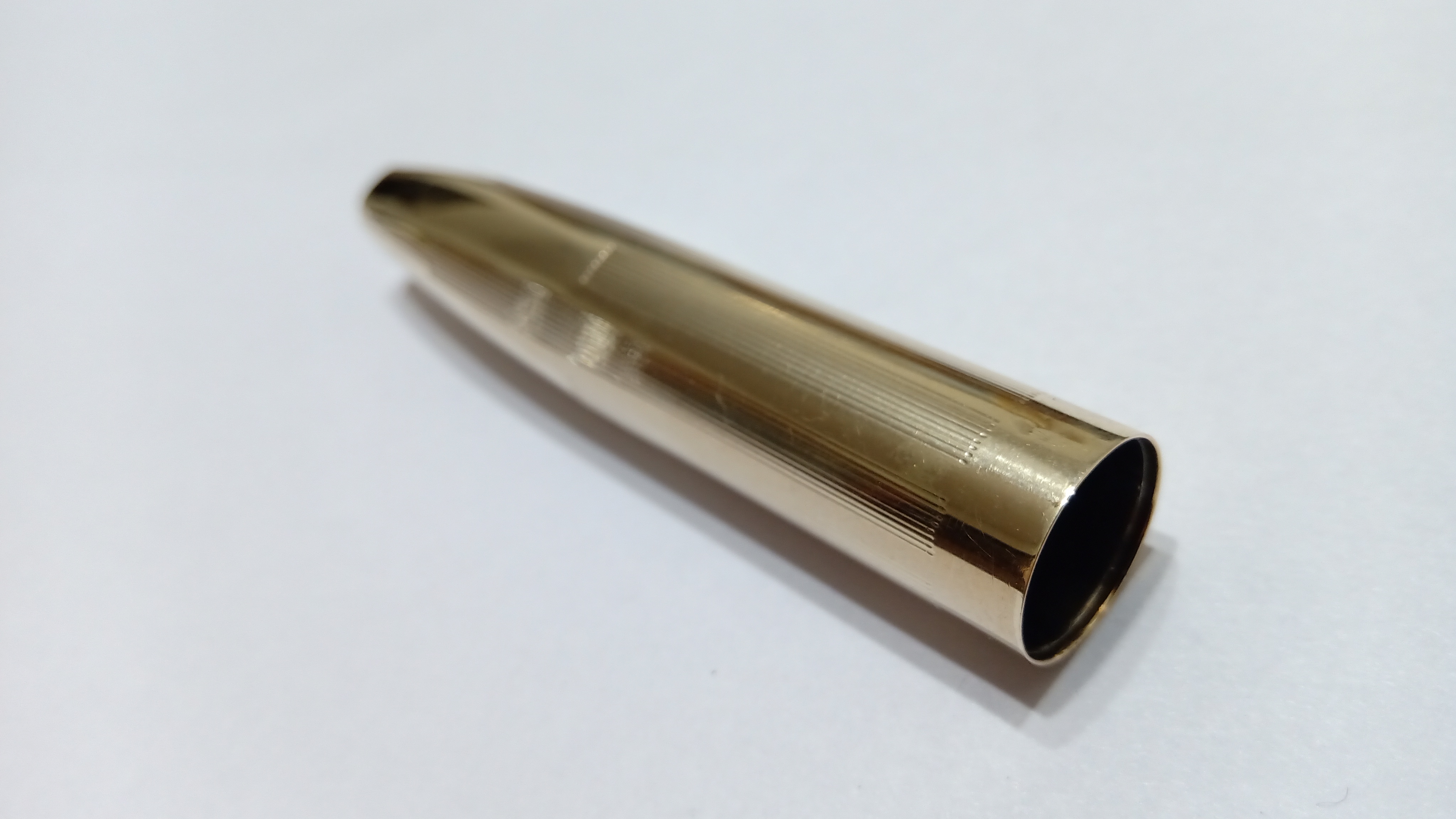 Pueden verse las arandelas de asiento en el capuchón, el grip con su plumín inlaid, y la entrada al grip con un pequeño canal de ebonita que conducirá la tinta desde el saco al alimentador.