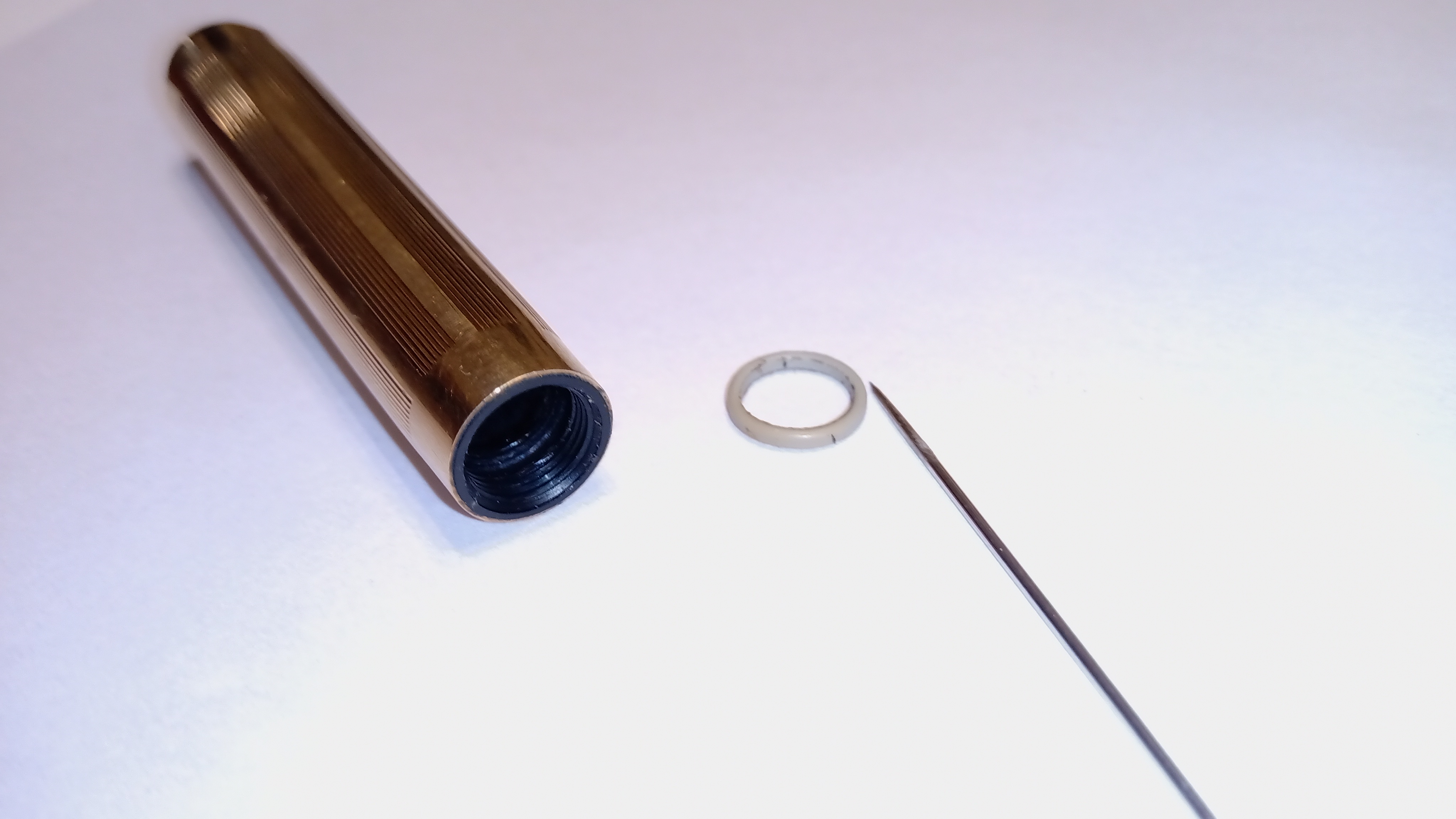 Quindi, con un piccolo ago, abbiamo rimosso l'O-ring che garantisce l'ermeticità tra il fusto e il pistone di compressione, che, come si può vedere, era in ottime condizioni...