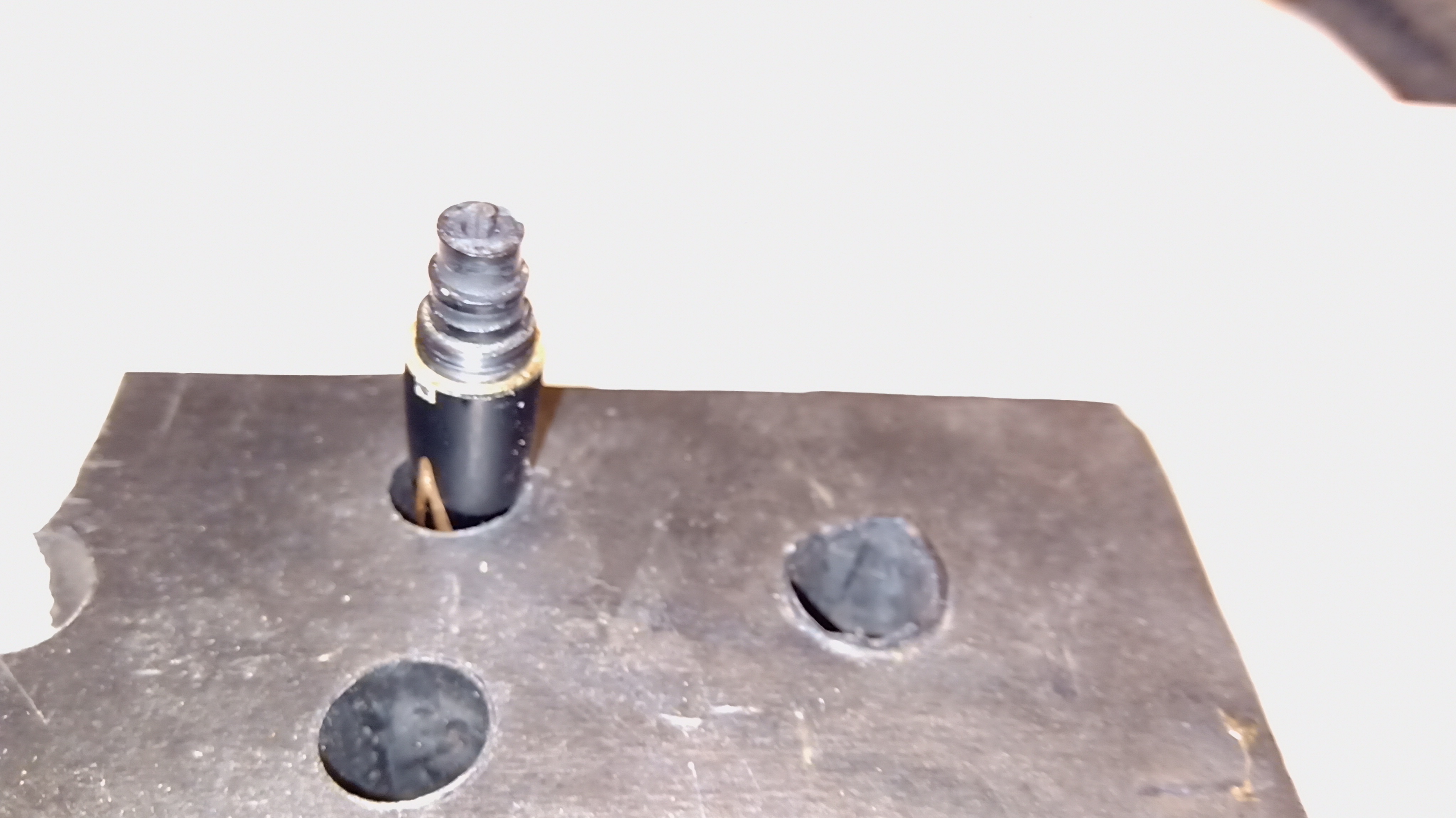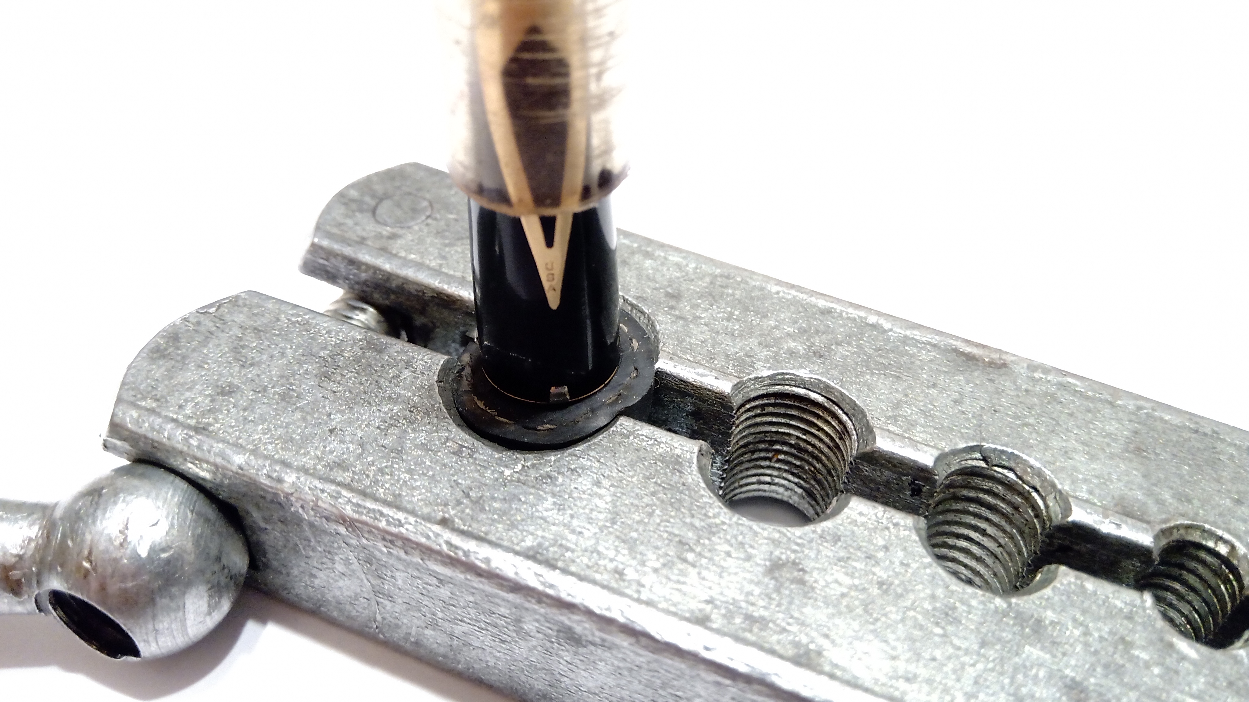 Per questo lavoro ho utilizzato una barra di acciaio con una punta smussata a forma di gancio con la quale ho smussato facendo attenzione a non danneggiare il corpo in plastica e la sua filettatura, e inoltre una barra di arresto, inserita dal lato opposto, per limitare e determinare esattamente la posizione dell'area da smussare...