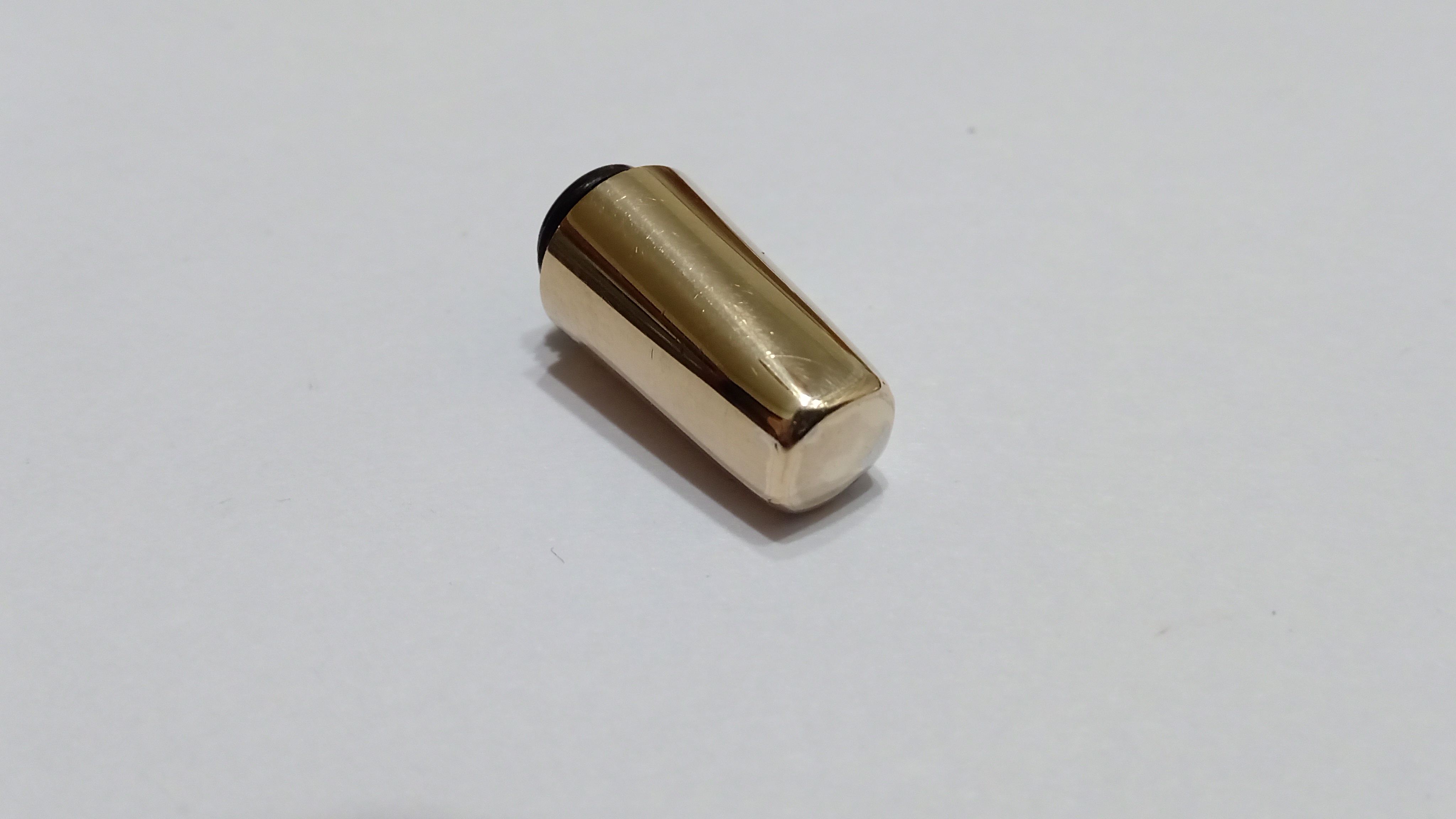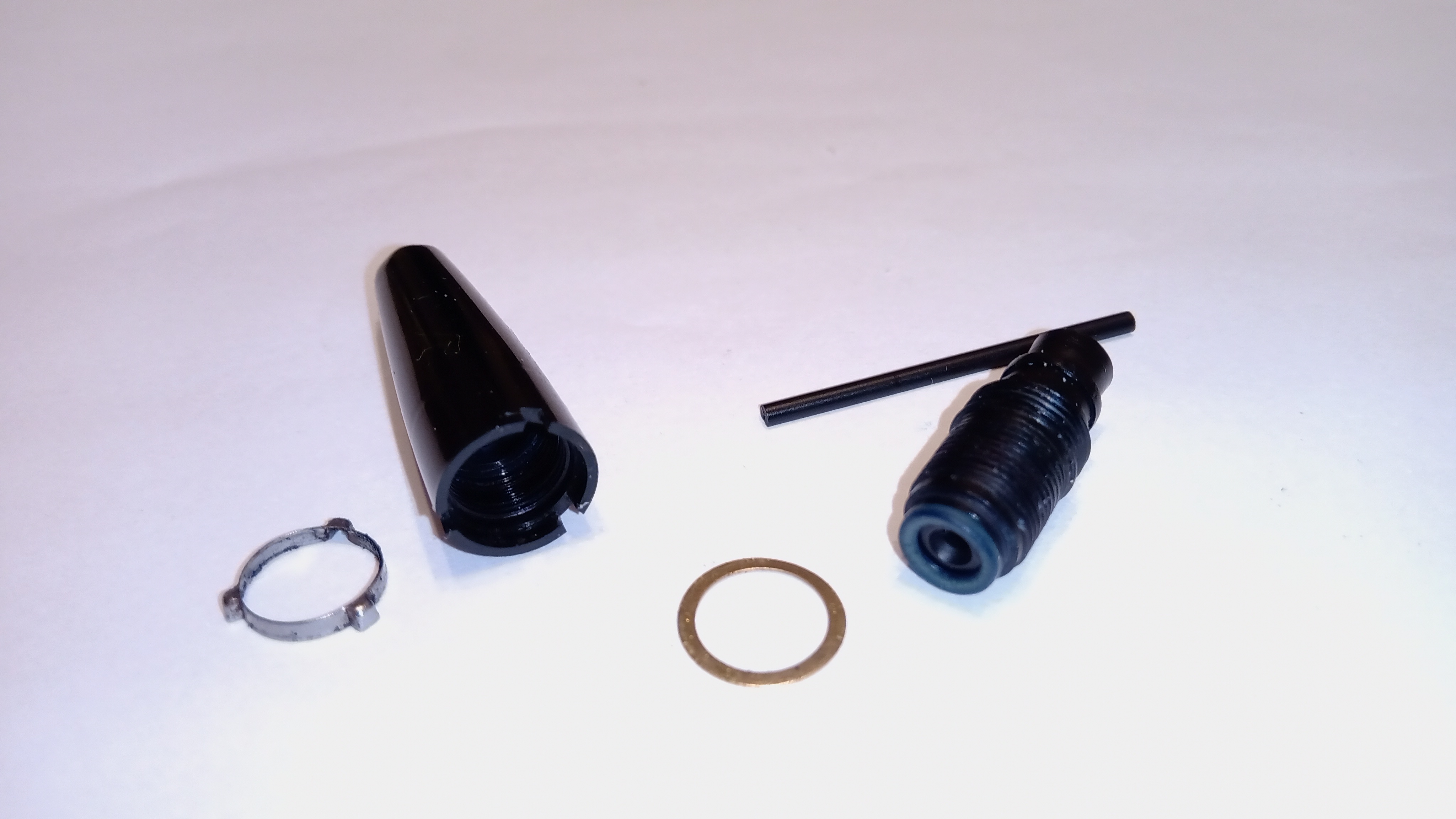 A questo punto abbiamo tutti i pezzi per assemblare completamente il cappuccio. La clip, la linguetta di sicurezza, una placchetta di ottone bombata per simulare il nuovo doppio fondo dell'inner-cap e una sede tubolare in PVC che andrà all'interno del cappuccio per garantire l'ancoraggio e la chiusura nell'impugnatura...
