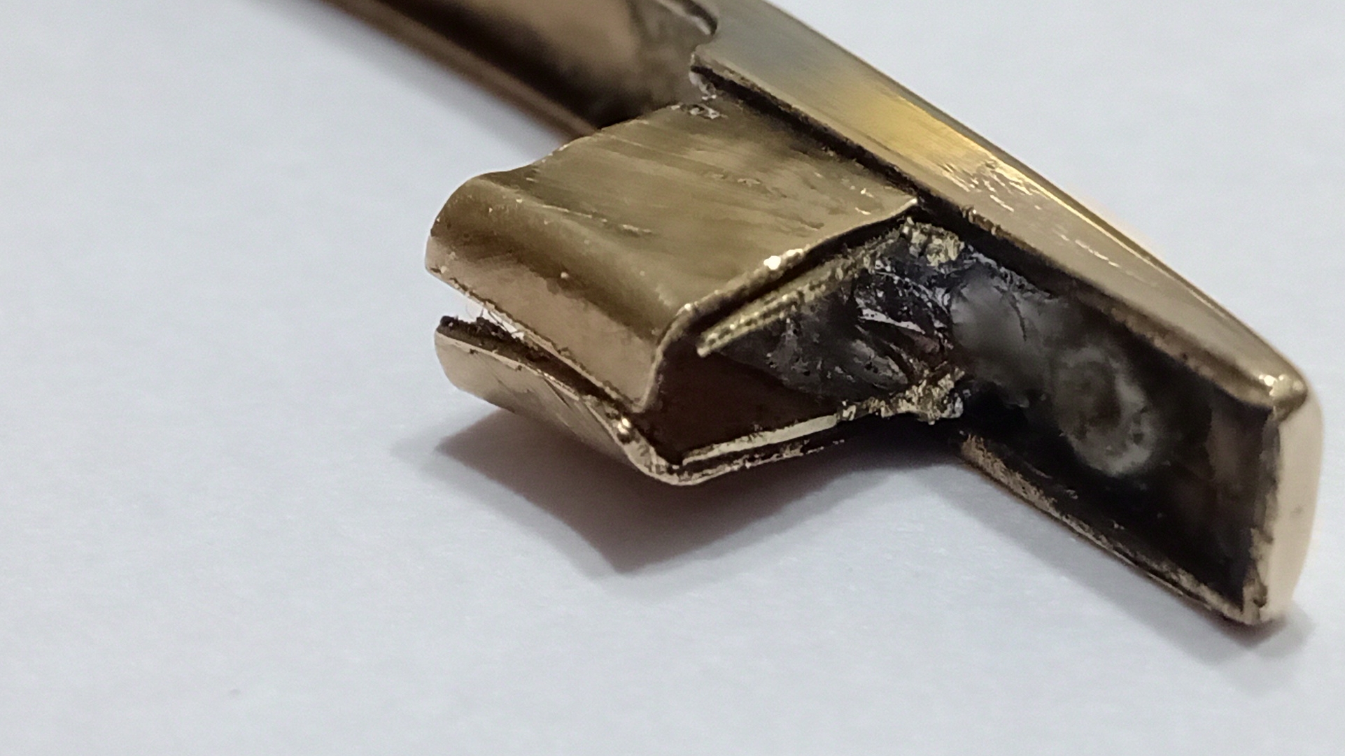 En el caso del clip, una de las solapas se encontraba quebrada, de modo que hubo que soldar una pequeña solapa interna de refuerzo con estaño...