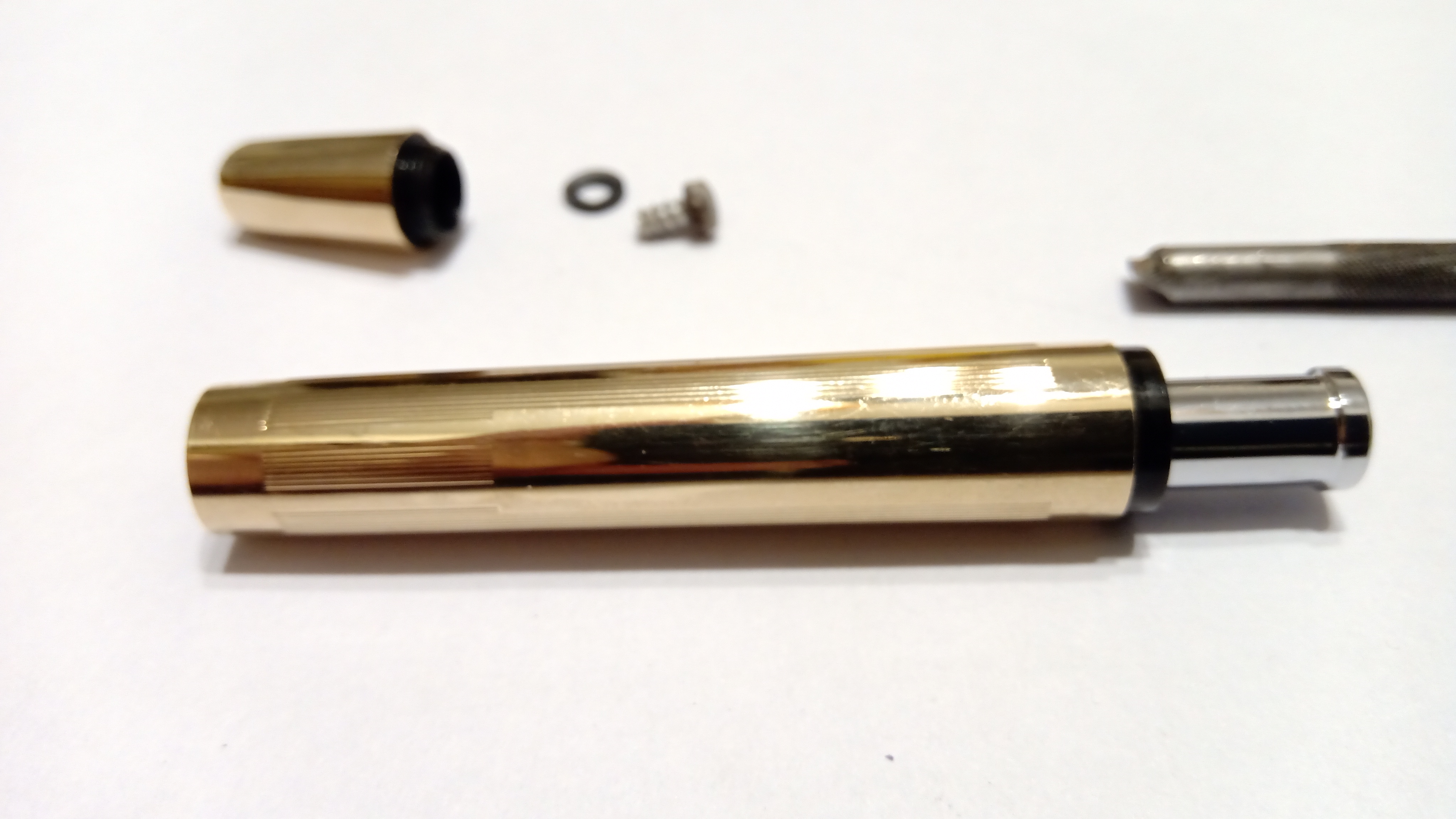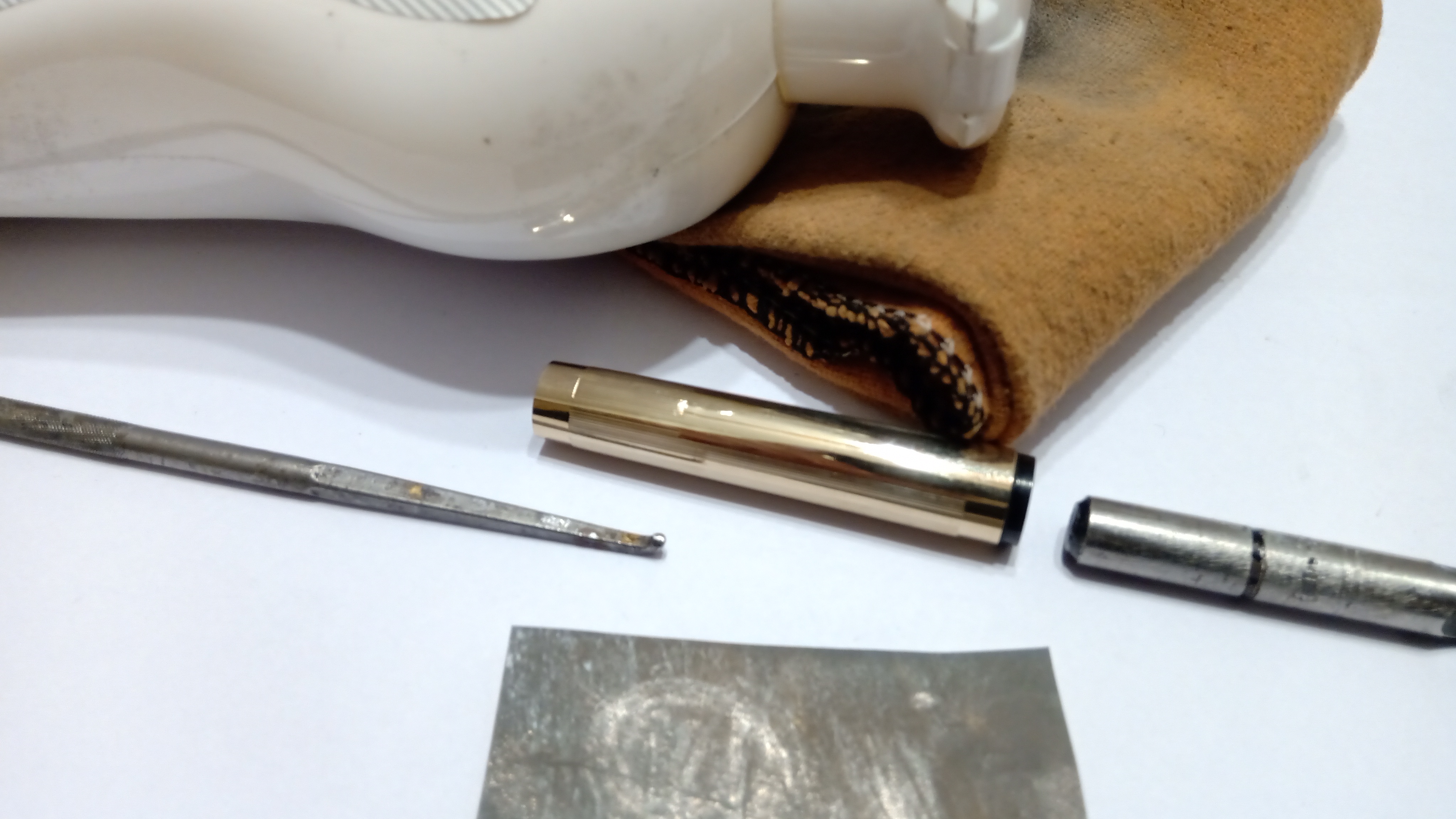 Ora iniziamo ad assemblare l'impugnatura con il suo sistema di alimentazione e deposito dell'inchiostro. Puliamo accuratamente l'alimentatore interno e il canale e lucidiamo con cura il pennino insieme all'impugnatura e alle rondelle usando una pasta per lucidare le carrozzerie...