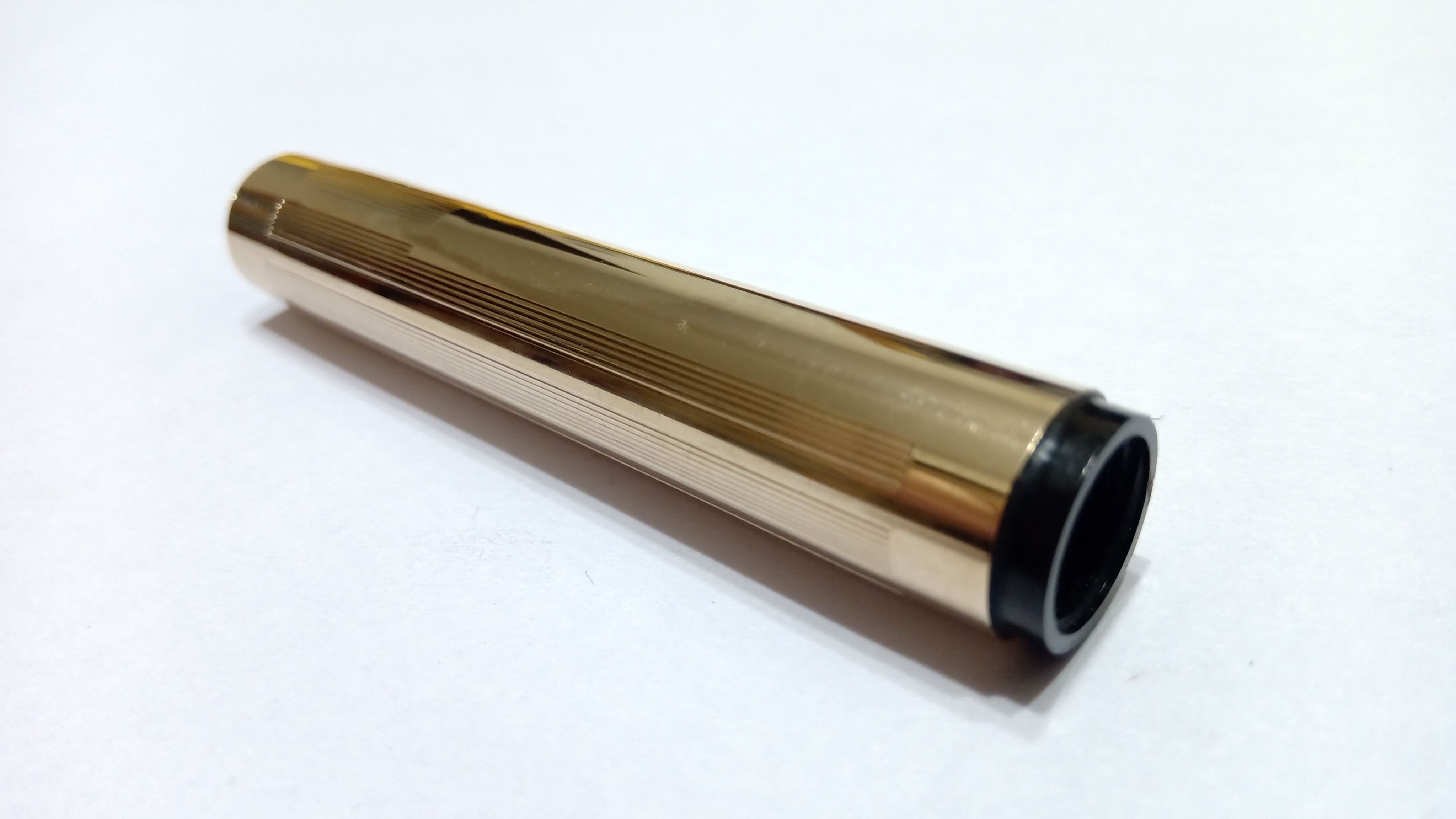 Ya así tenemos todas las piezas para armar completamente el capuchón. El clip, el seguro, una plaquita de latón abovedado para simular el nuevo falso fondo del inner-cap y un asiento tubular de PVC que irá dentro del capuchón para asegurar el anclaje y cierre en el grip...