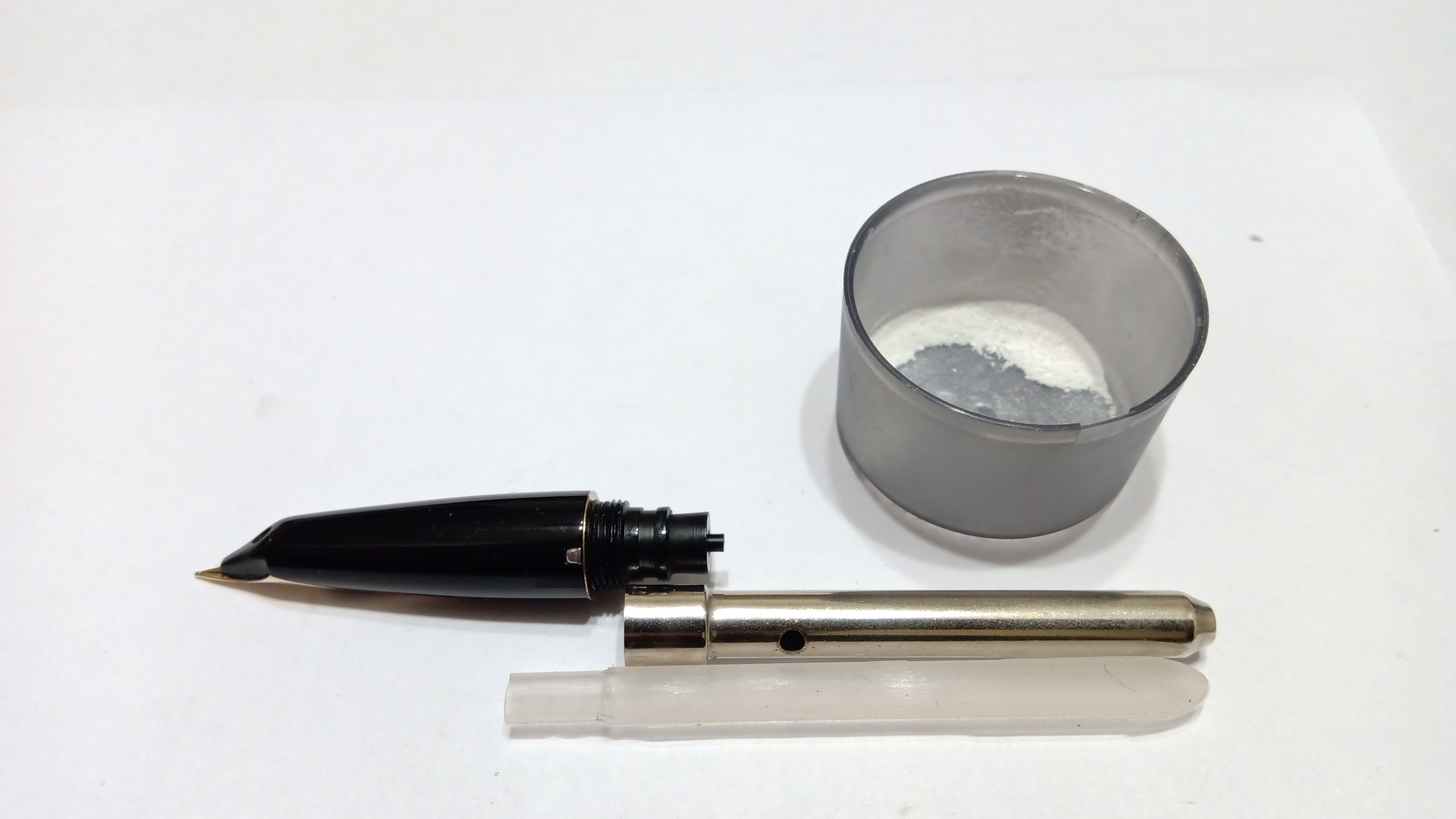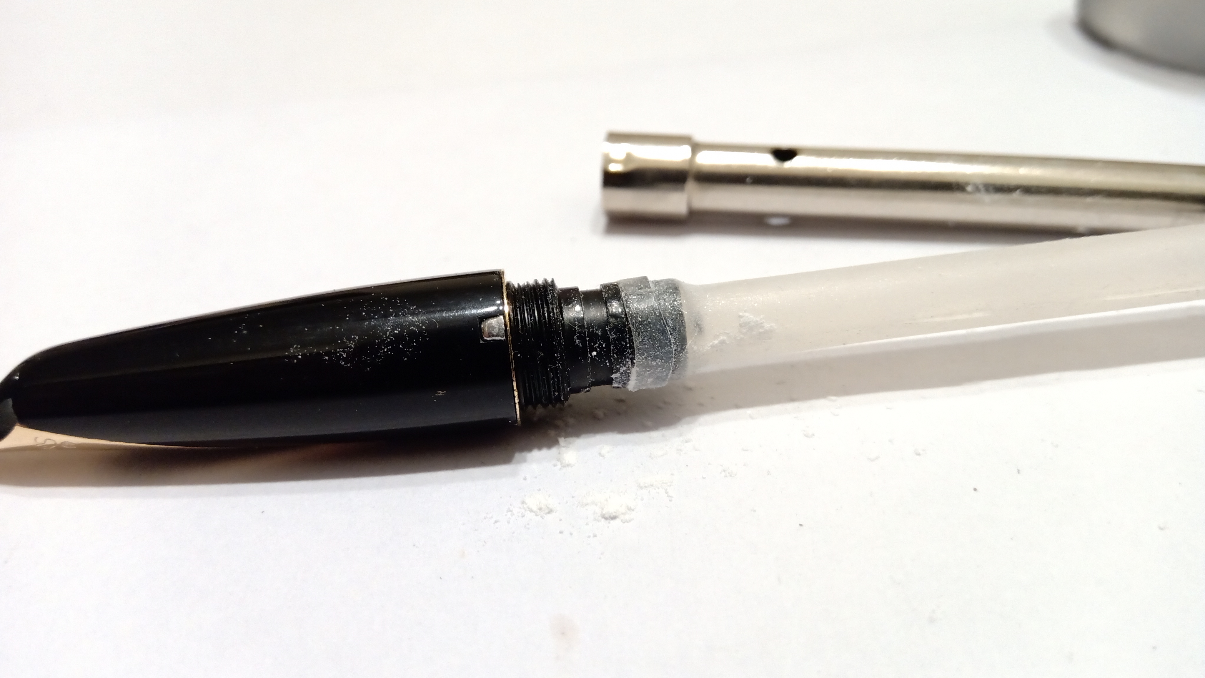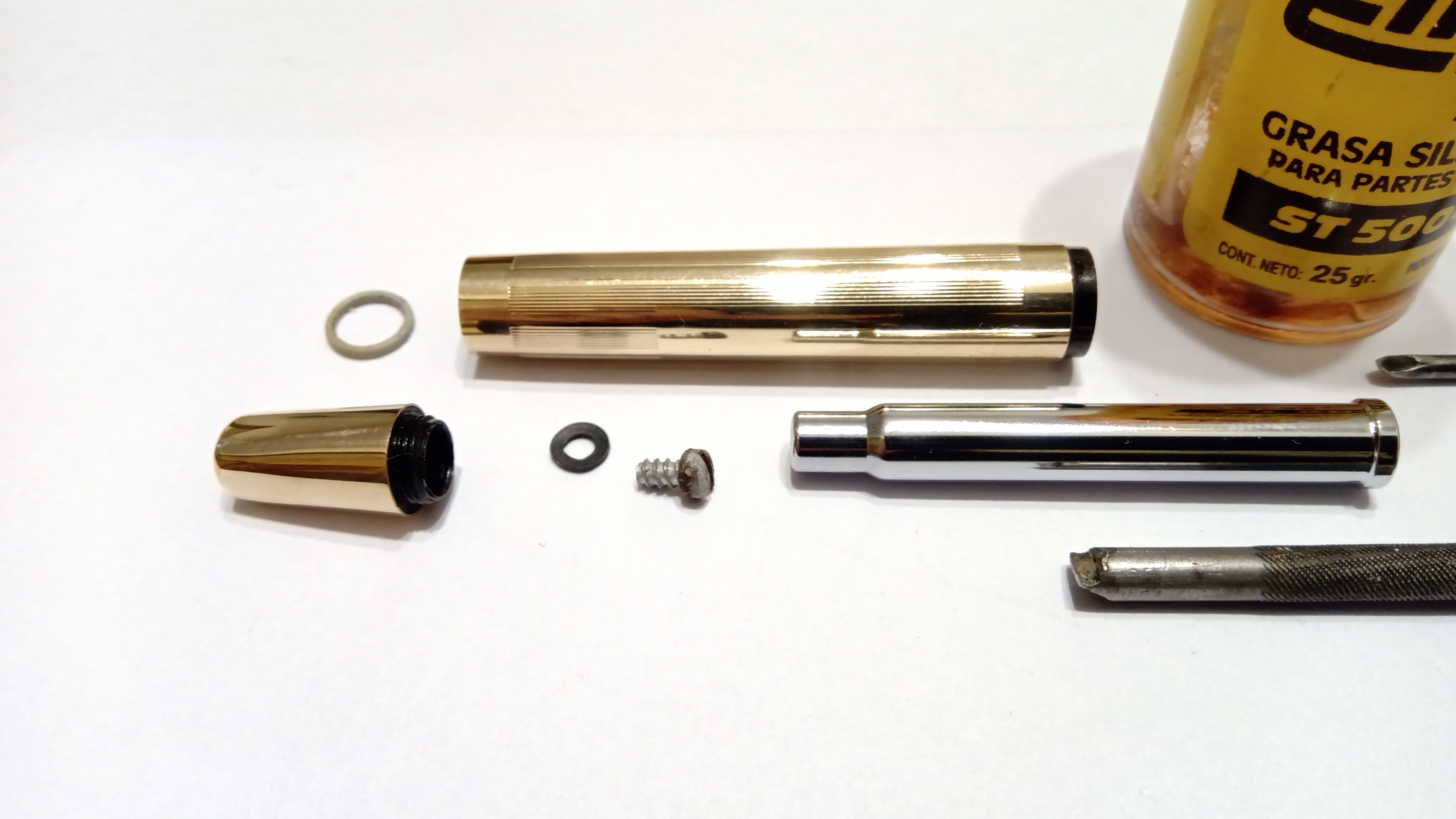 Comenzamos ahora a armar el grip con su sistema de alimentación y almacenaje de tinta. Limpiamos cuidadosamente el alimentador interno y el canal, y pulimos con esmero el plumín junto con el grip y las arandelas usando pasta para pulir carrocerías...