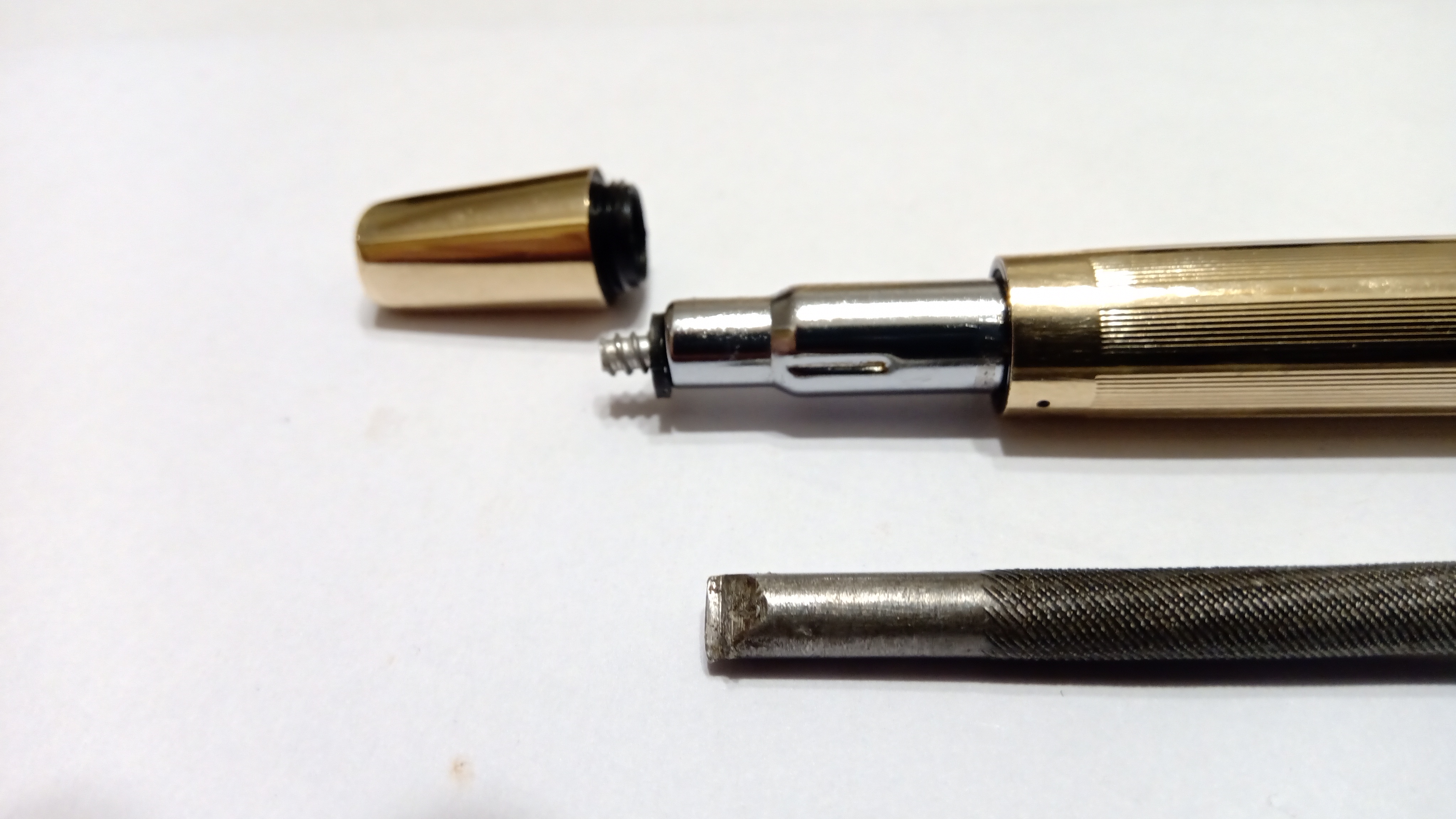 pero también había sufrido dos puntazos en la virola del capuchón, quizá para lograr el anclaje en el cierre que por diversas razones ya no tenía...