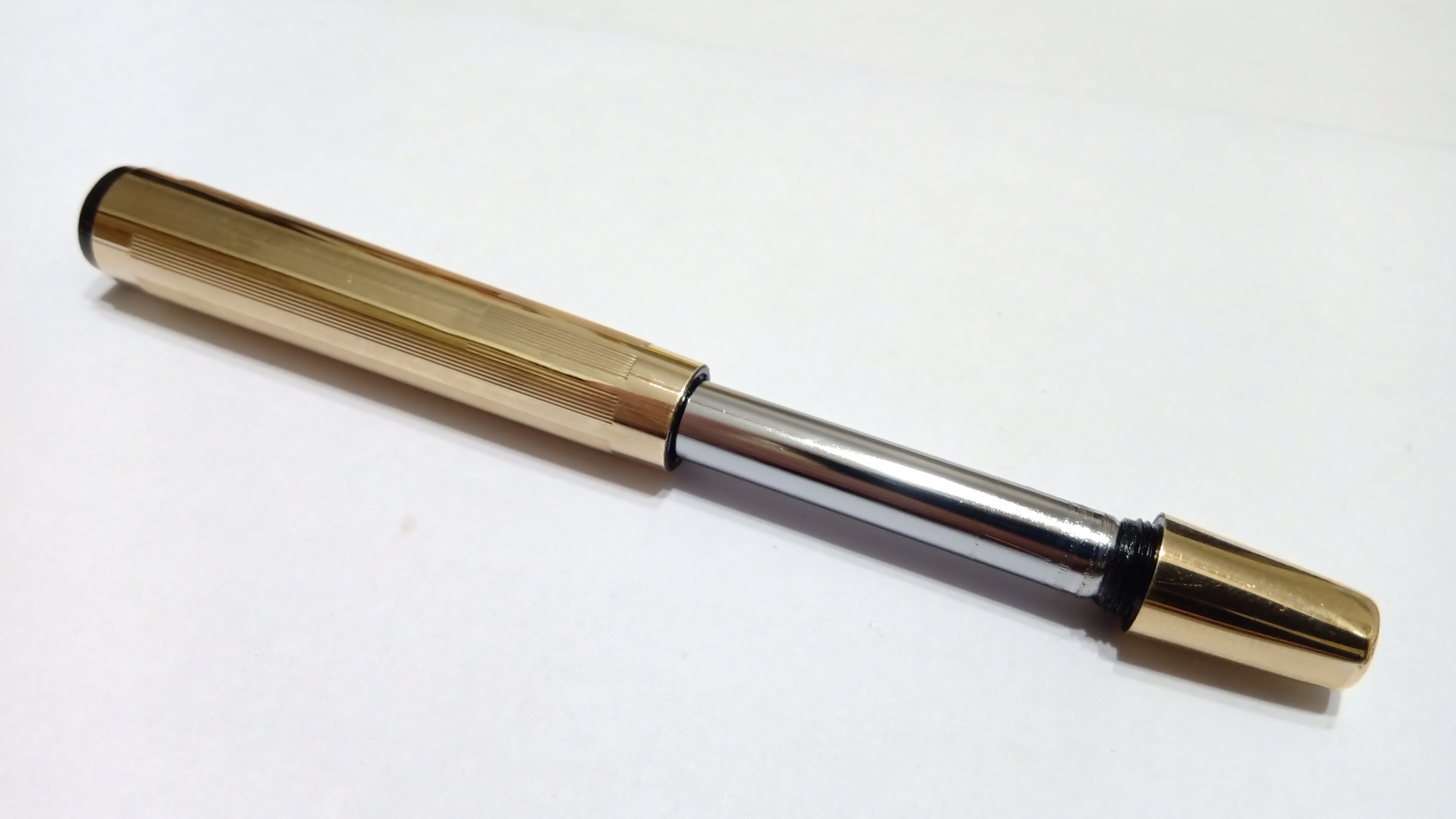 Si possono vedere le rondelle di sede nel cappuccio, l'impugnatura con il pennino intarsiato e l'ingresso dell'impugnatura con un piccolo canale in ebanite che convoglierà l'inchiostro dal serbatoio all'alimentatore.