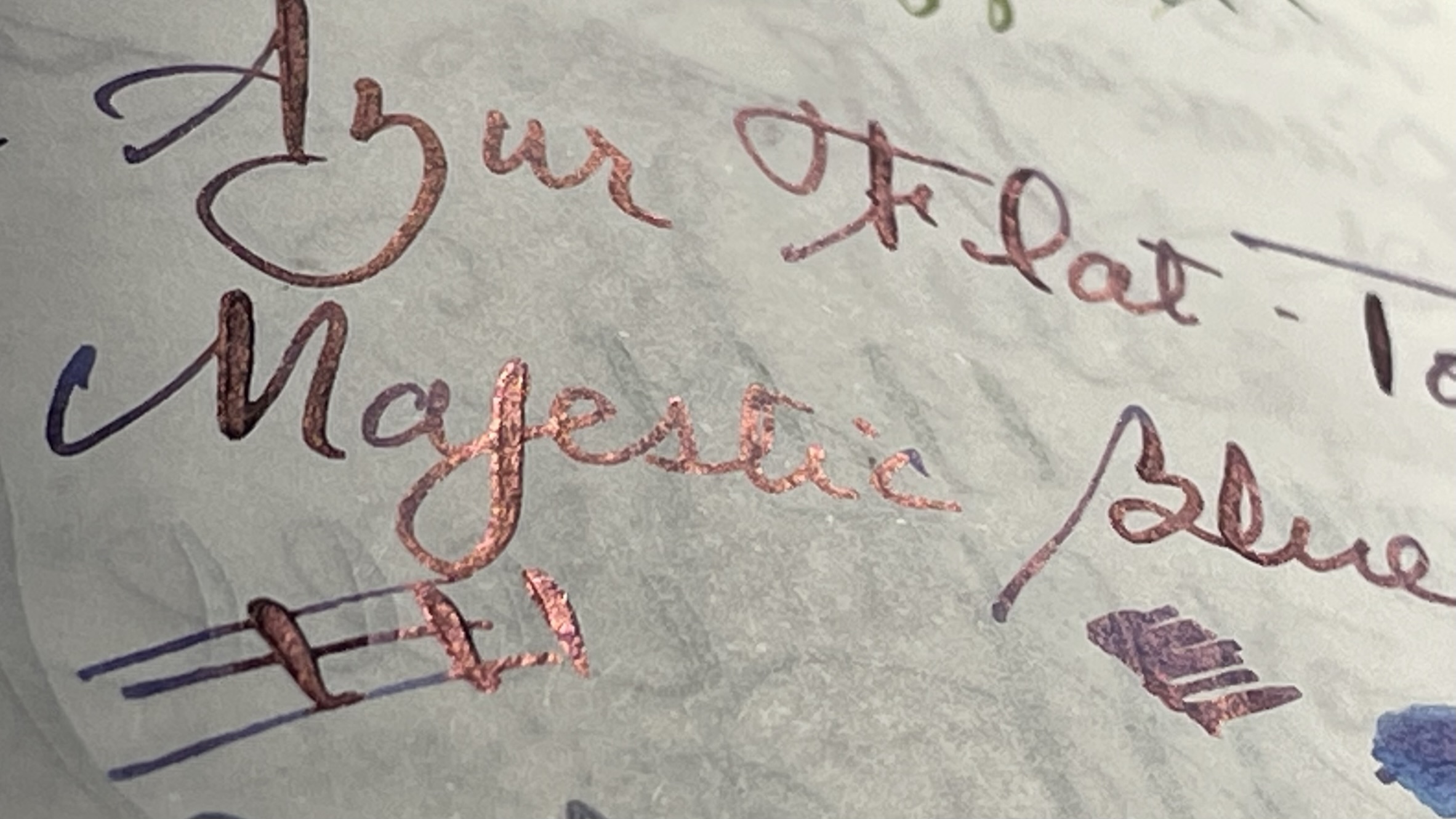 il Majestic Blue è uno dei miei preferiti, funziona benissimo con i pennini a rebbi molto stretti che non lascian passare niente ed è molto untuoso. Colla mia boccetta non noto tendenze verdi, anzi, blu molto dichiarato.