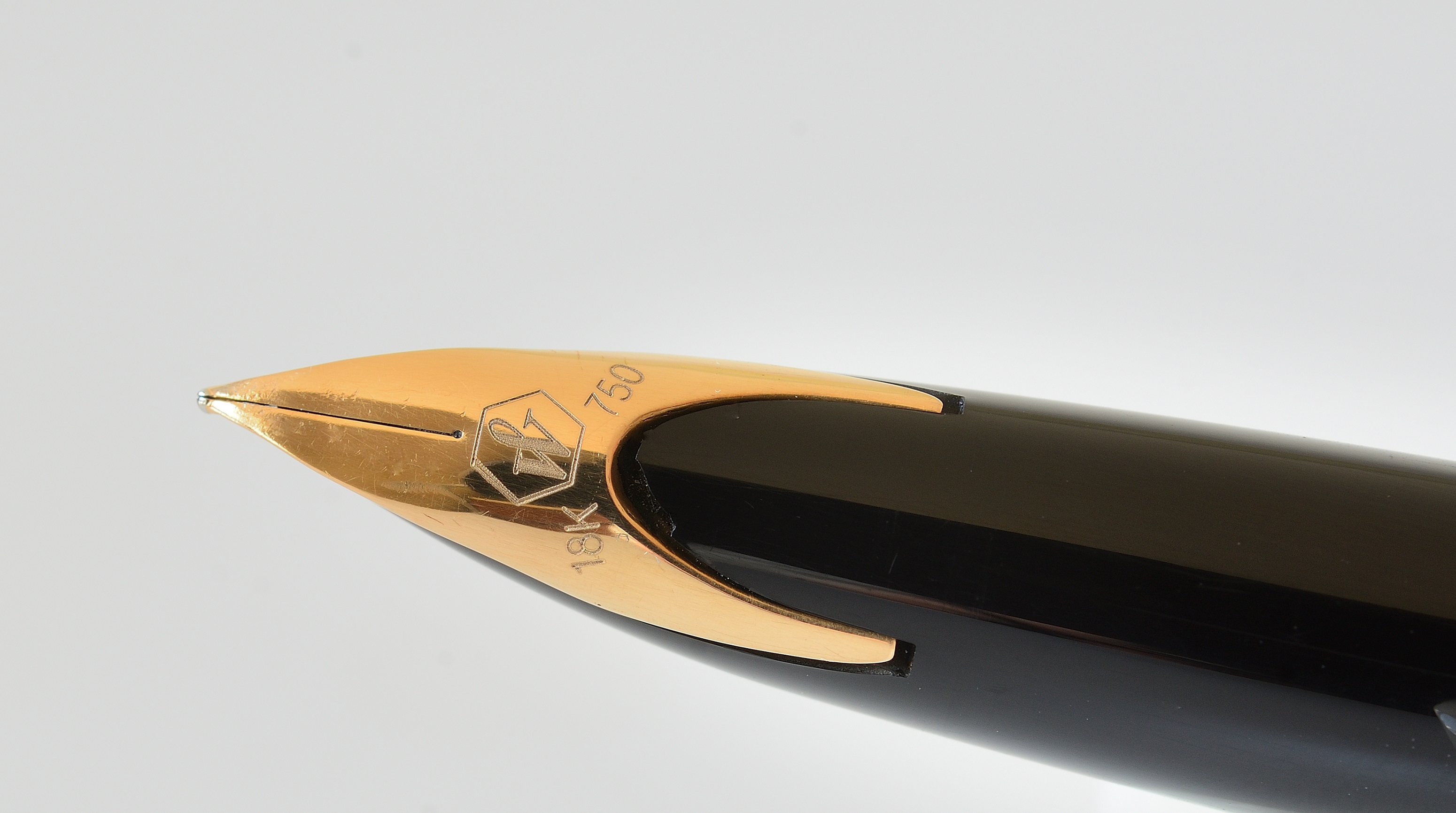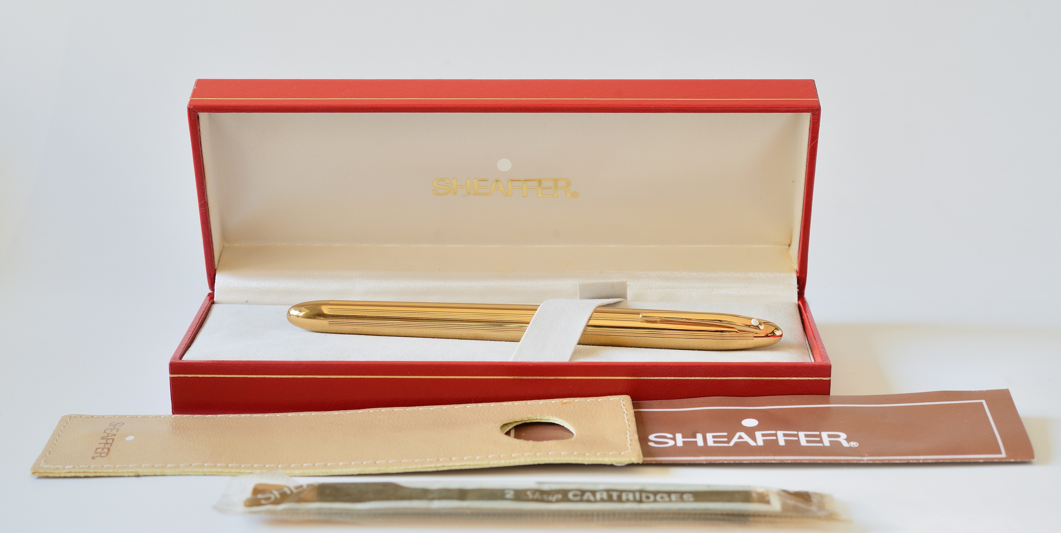 La prima è una Sheaffer Crest 590 prodotta, credo, agli inizi degli anni '90, senza la fascia larga al cappuccio, completa di scatola, controscatola in cartoncino e dotazione composta da due cartucce di cortesia, una custodia in pelle e foglietto di istruzioni e garanzia. Porta in dotazione, montato, un converte Sheaffer di tipo aerometric. Pennino tubolare in oro 18K di tipo Triumph, NOS, mai inchiostrata. Il primo anno di produzione non viene riportato neanche dal ben noto sito: https://www.sheaffertarga.com/Crest/cre ... 0list.html e non so perché.