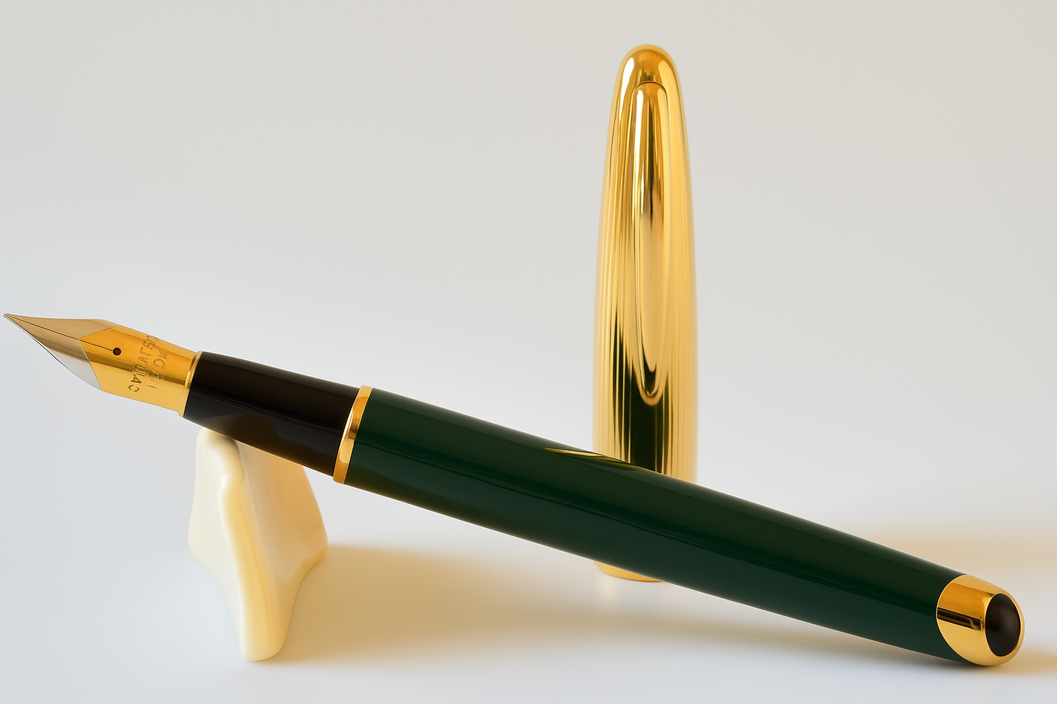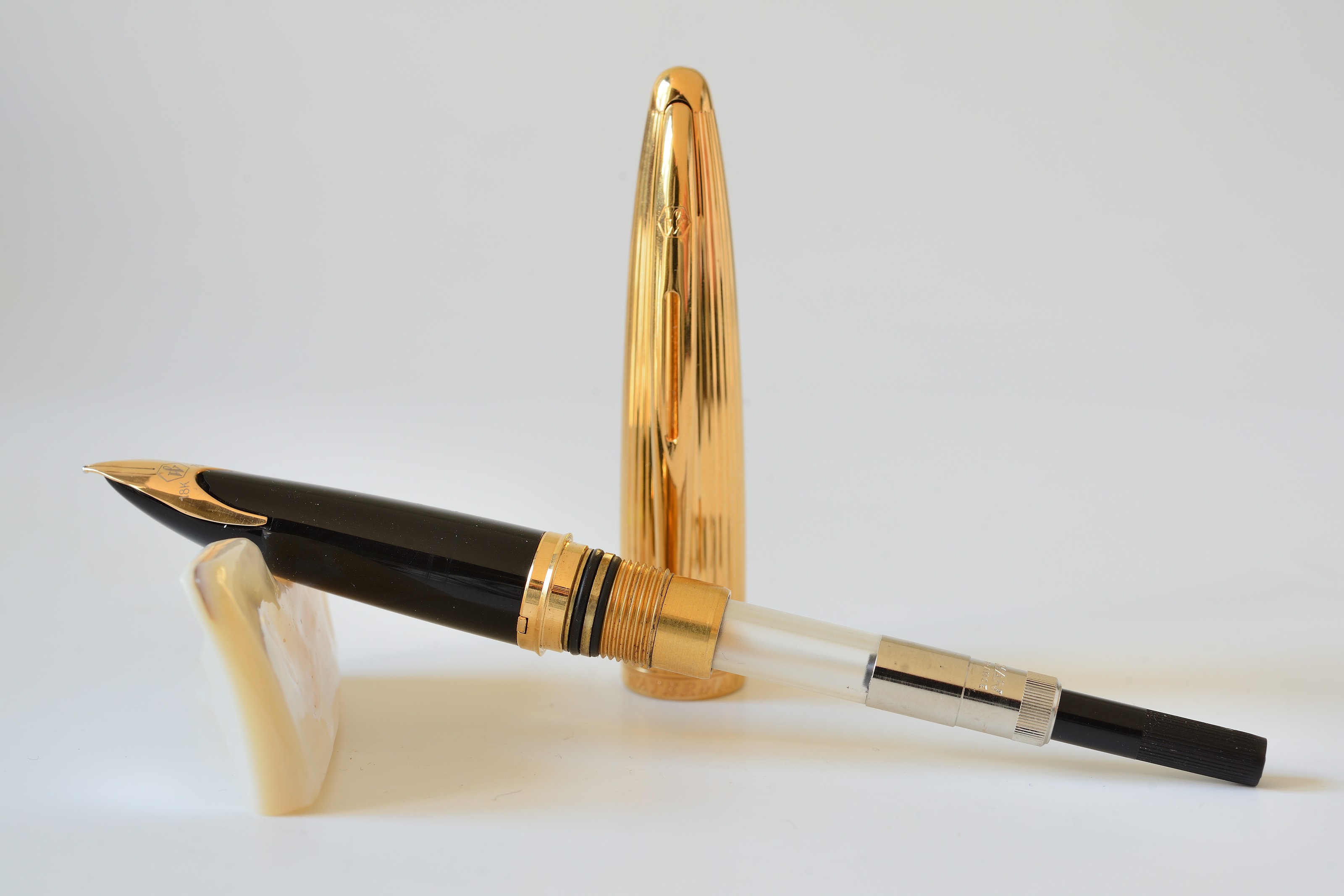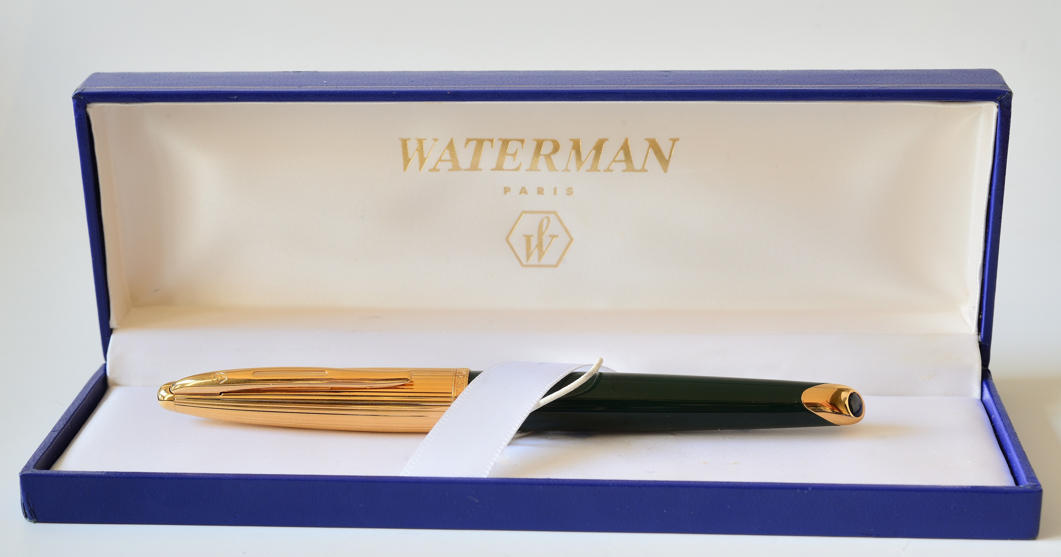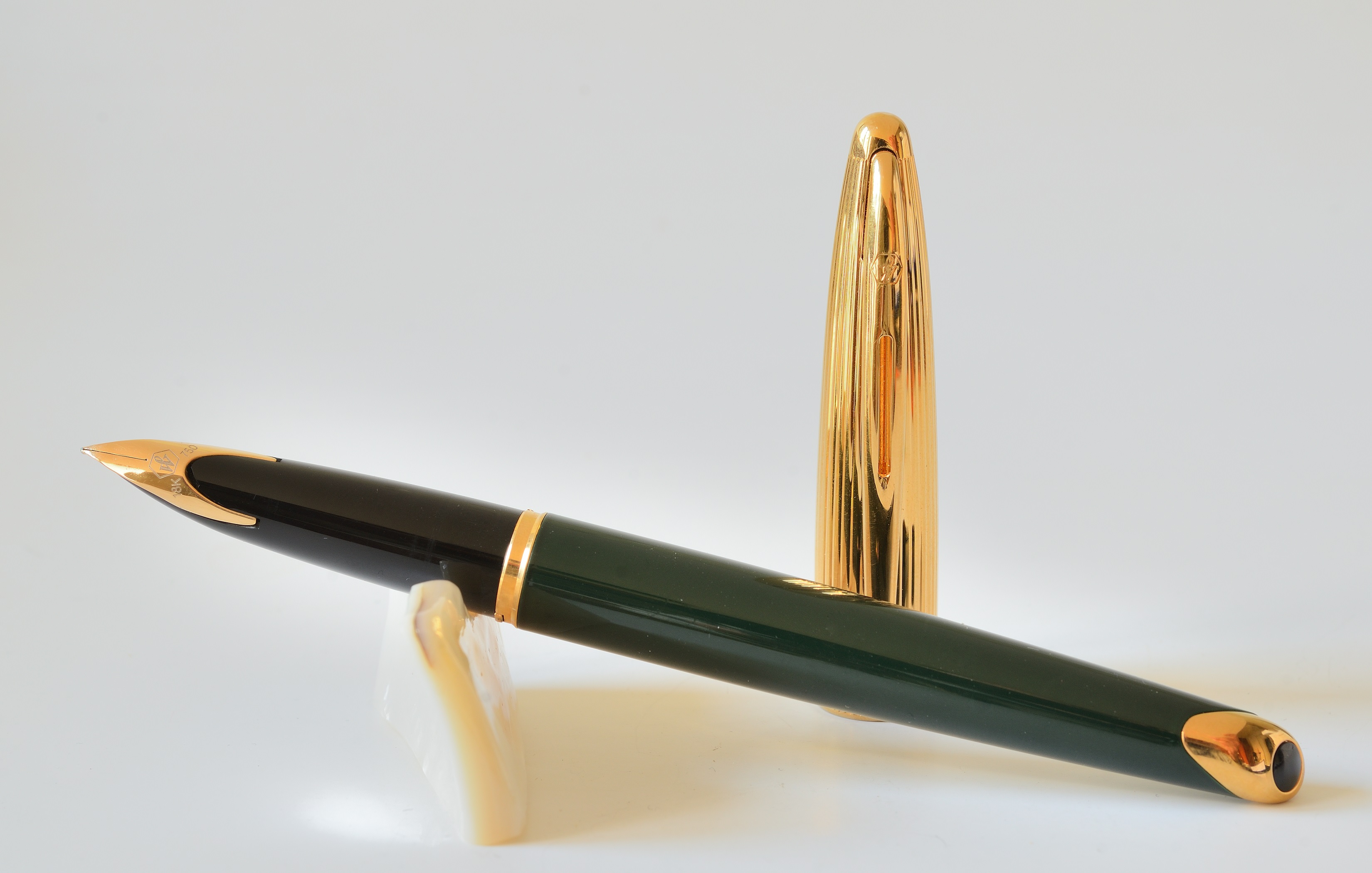 La seconda è una Waterman Carene credo GL, corpo metallico rivestito di lacca verde scuro (forest?) e cappuccio dorato, caricamento cartucce proprietarie/converter, caratteristico pennino in oro 18K, doppio o-ring alla giunzione tra fusto e sezione.