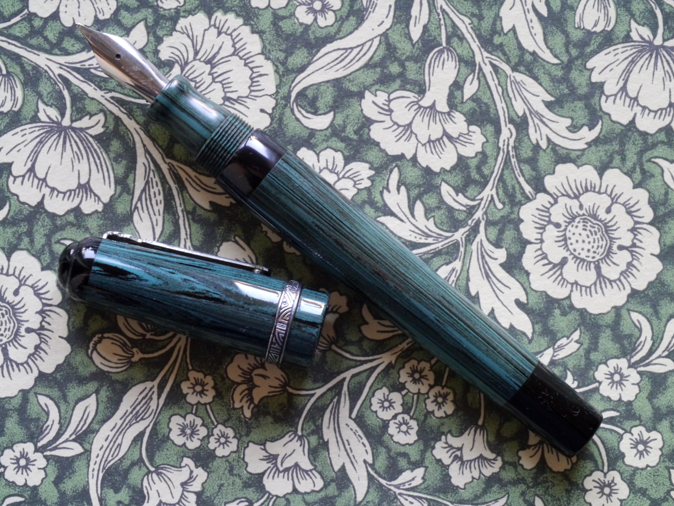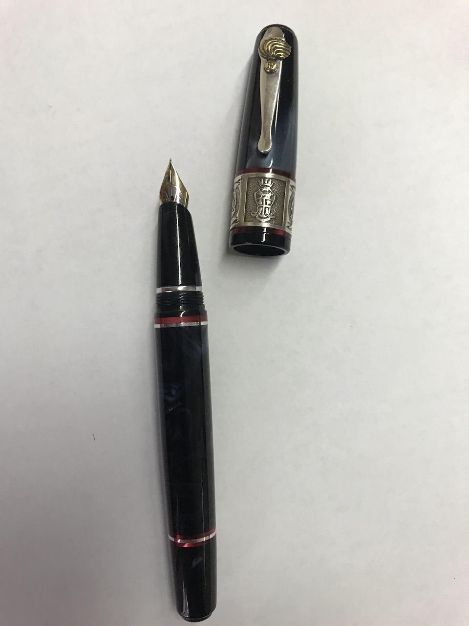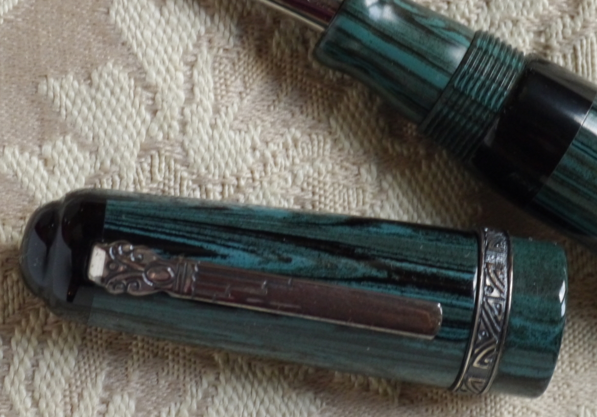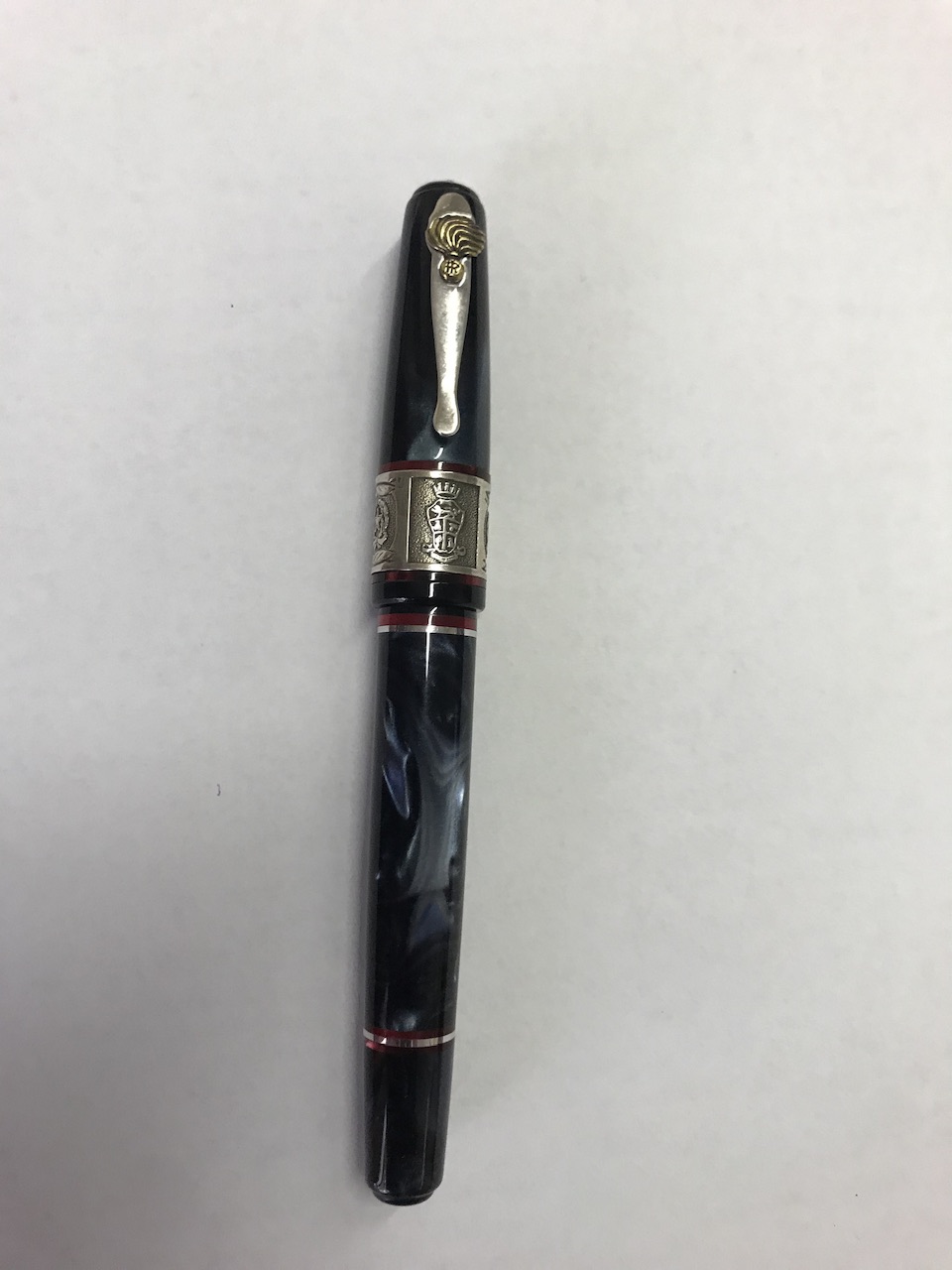 Bella penna, come sanno esserlo alcune Marlen quando non esagerano. La tua è impreziosita, dagli anelli in argento, un filo in eccesso, ma quello è lo stile Marlen e ci si abitua facilmente dopo un poco, apprezzandoli. Condivido che la clip a foggia di omino è il di più (credo sia argentata, mentre gli anelli sono in argento, una volta si faceva, oggi costerebbe troppo), ma è tipica anche lei.