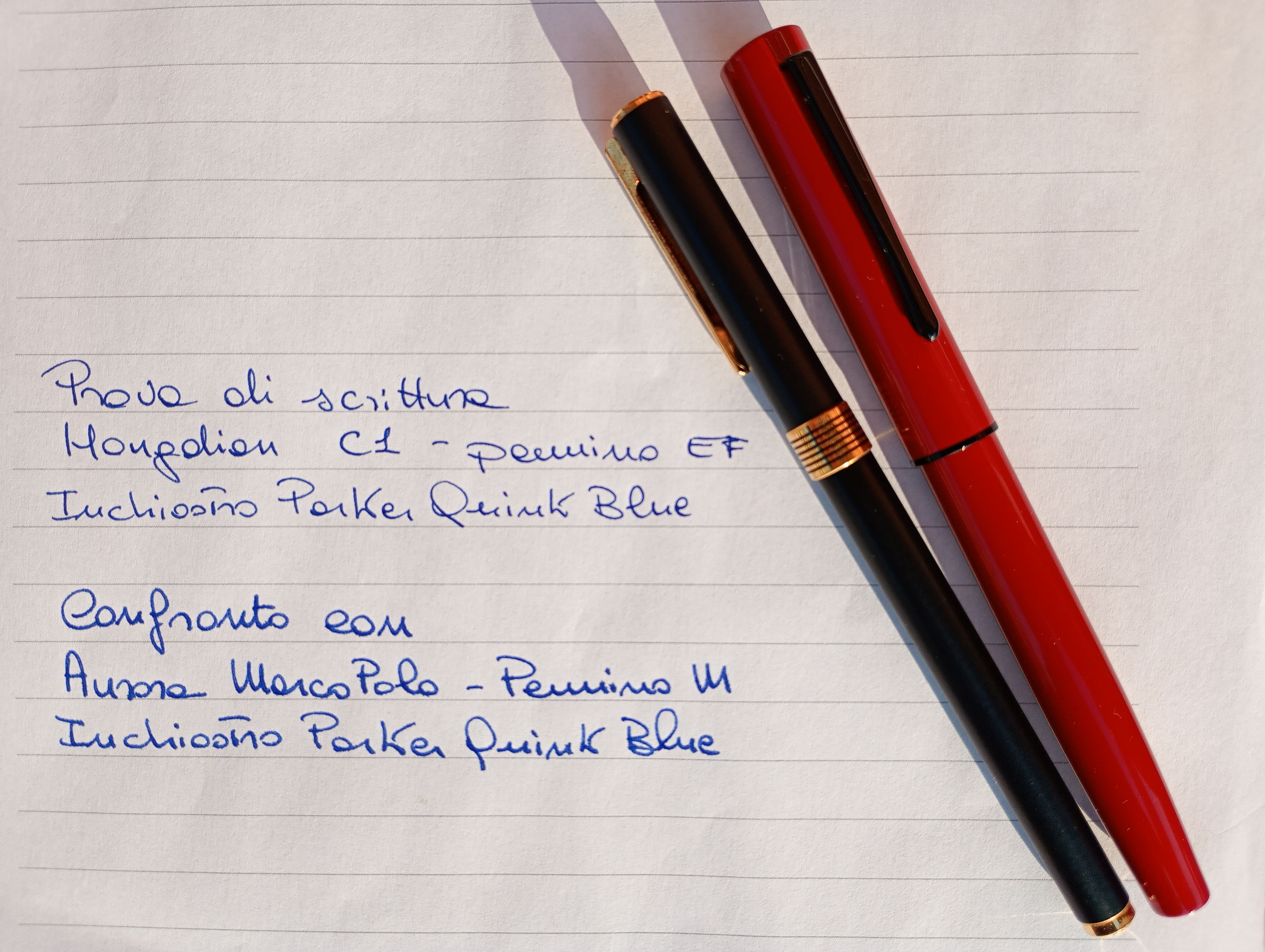 Per il mio esemplare ho scelto il pennino EF, nelle prove si vede il confronto con il medio dell'Aurora su carta da fotocopie, entrambe sono inchiostrate con il Parker Quink blue.