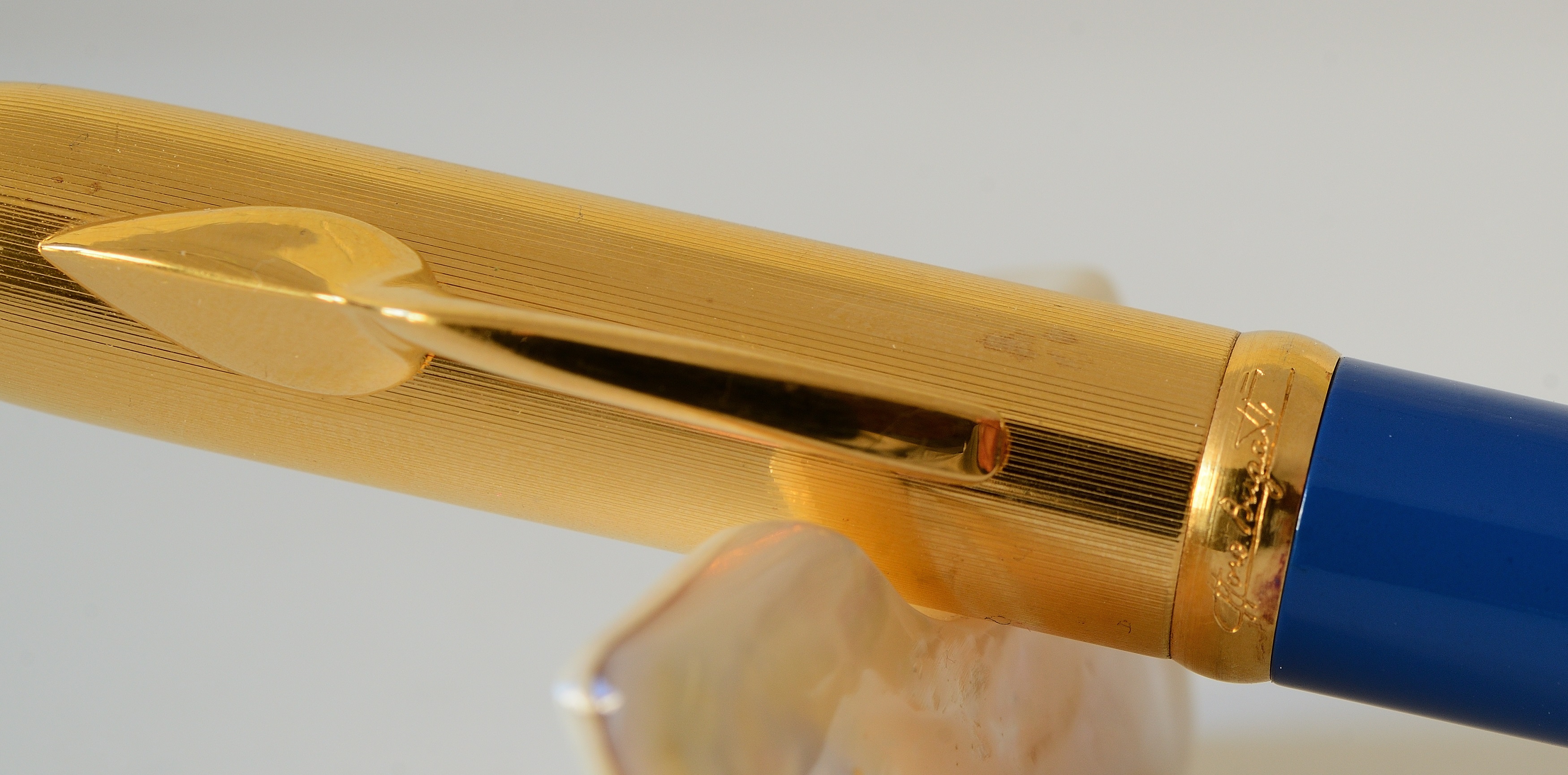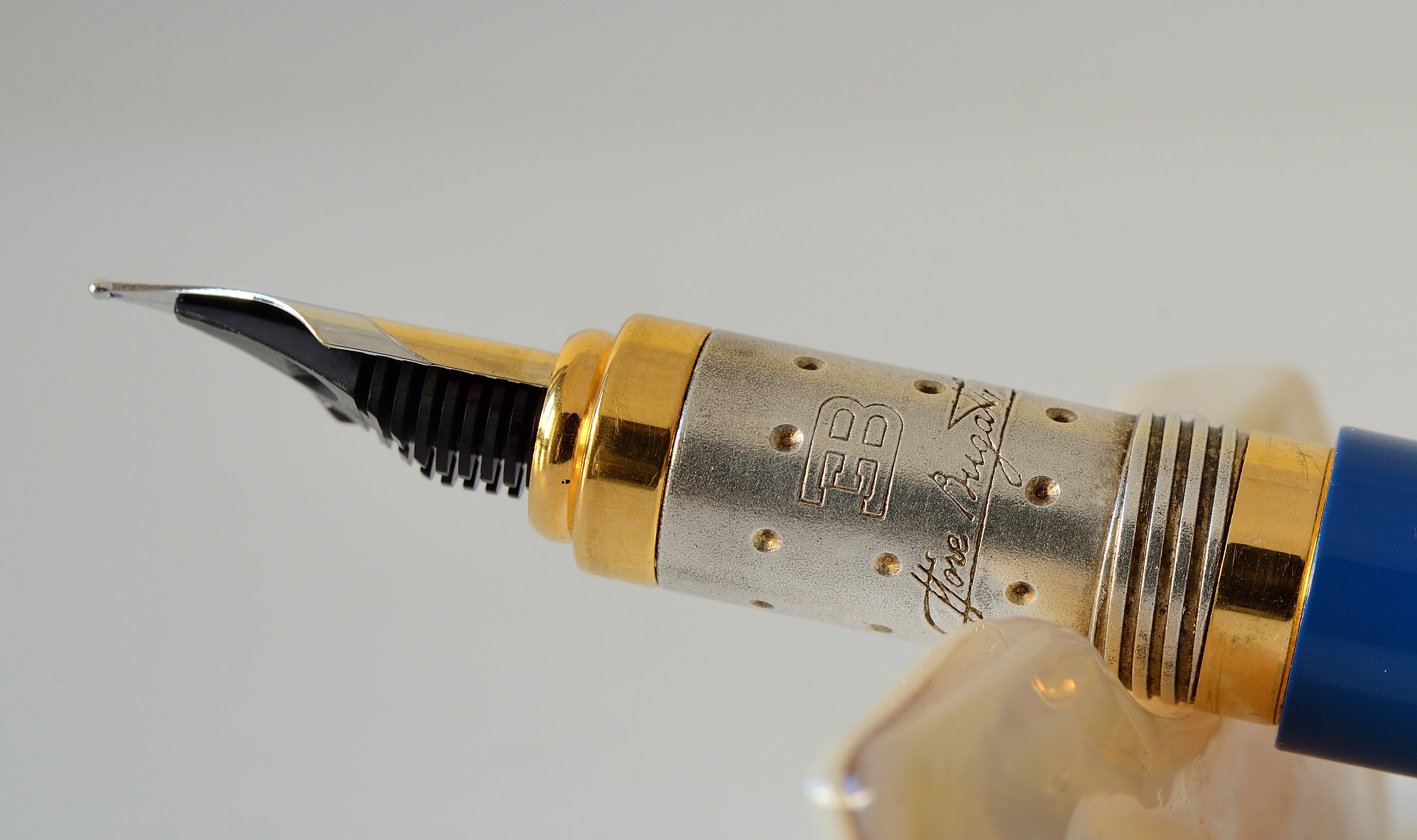 Questa volta dovrebbe trattarsi di una stilografica Ettore Bugatti Type 50. Dalle poche informazioni reperite in rete, dovrebbe essere stata prodotta, credo negli anni 90, dalla Montegrappa, in esclusiva per le boutique Bugatti (mai vista una). Ha fusto in ottone laccato blu, cappuccio dorato, la clip ha la forma dell’automobile Bugatti T 50 (da cui il nome), alcuni, invece, la fanno risalire alla Bugatti T 57 Atlantic. La giunzione fusto-sezione realizzata metallo su metallo, assicura ottima stabilità. Sezione argentata con fossette, a riprendere il motivo della tappezzeria classica Bugatti. Il pennino, tra F ed M, è bicolore, in oro18K, alimentatore credo in ebanite. Caricamento cartuccia/converter di tipo Pelikan. Come al solito NOS, mai inchiostrata, completa della sua scatolina prismatica in legno.