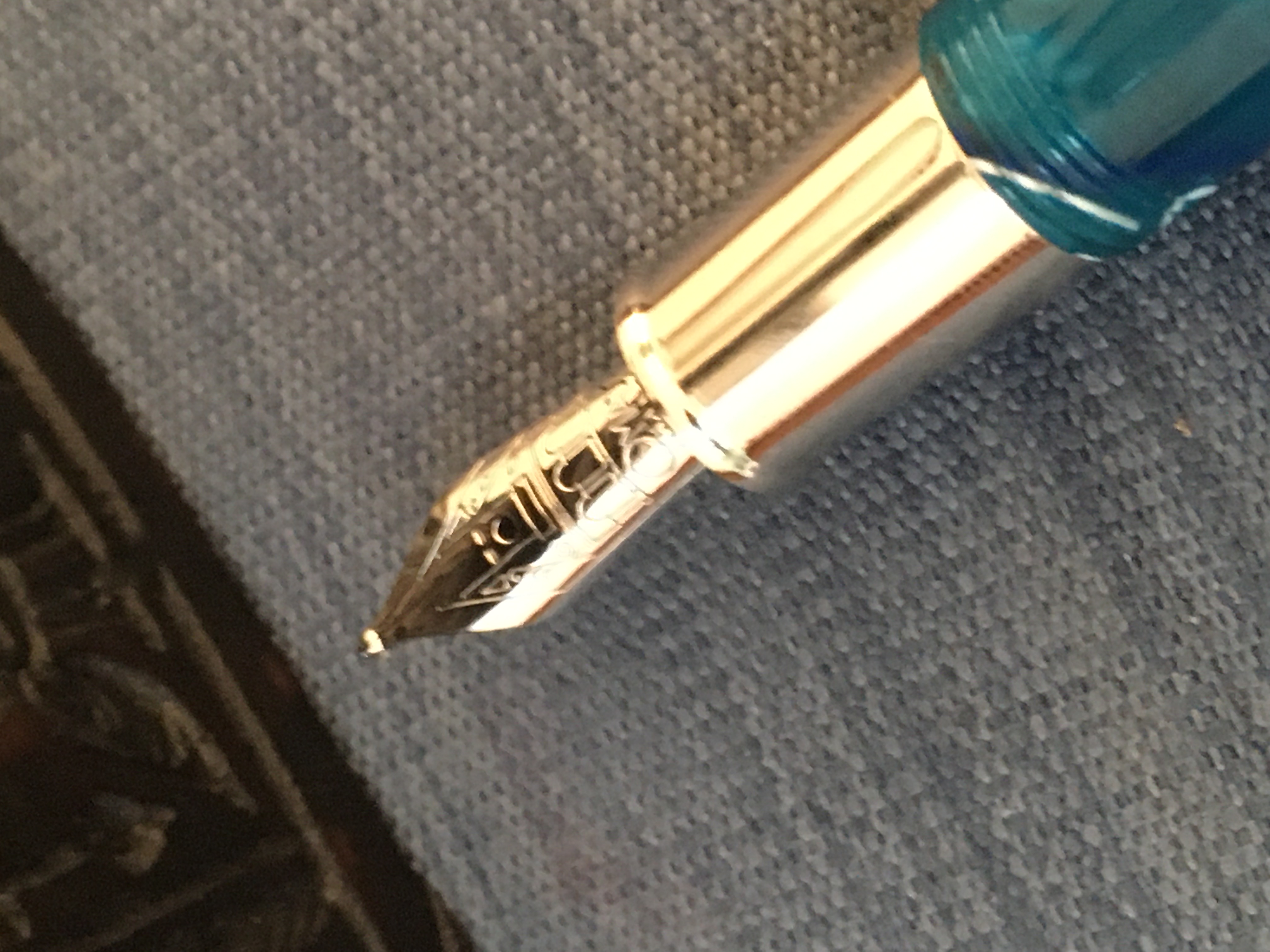 Questa penna di produzione ante 90 era ferma da più di 30 anni e stasera l'ho caricata con un Waterman Blu Mistero, prima però ho dovuto lubrificare un po' lo stantuffo perché era quasi grippato. Questo fatto mi convince sempre di più che le penne bisogna usarle e che se tenute ferme nelle scatole possono avere dei problemi. Il pennino è un bel 750 gradazione M molto morbido come si può vedere qui sotto