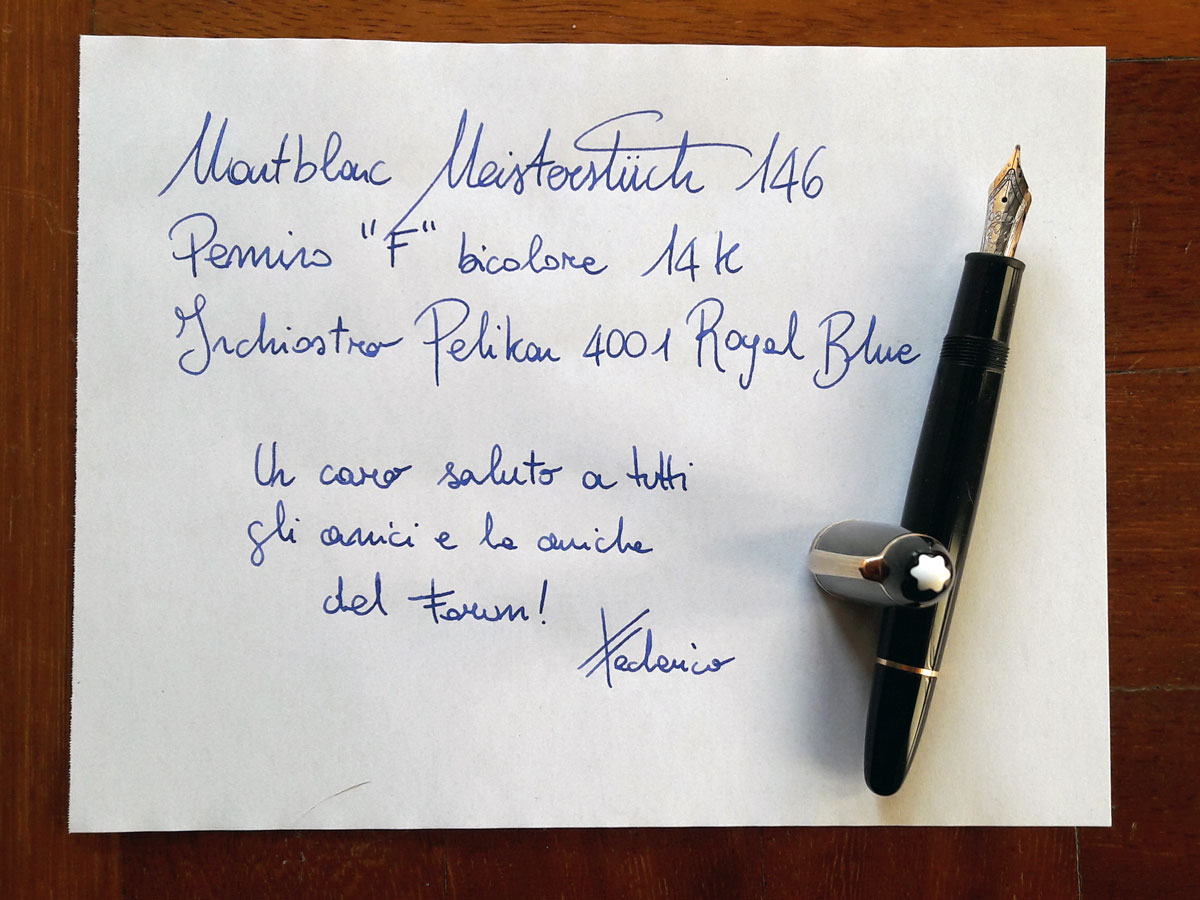 Per il momento ci sto scrivendo parecchio con vari inchiostri, principalmente Aurora Black e Pelikan 4001 Royal Blue. Nei vari argomenti analoghi ho letto che un paio di settimane di uso costante potrebbero risolvere il problema. Per il momento vi lascio una foto con dedica!