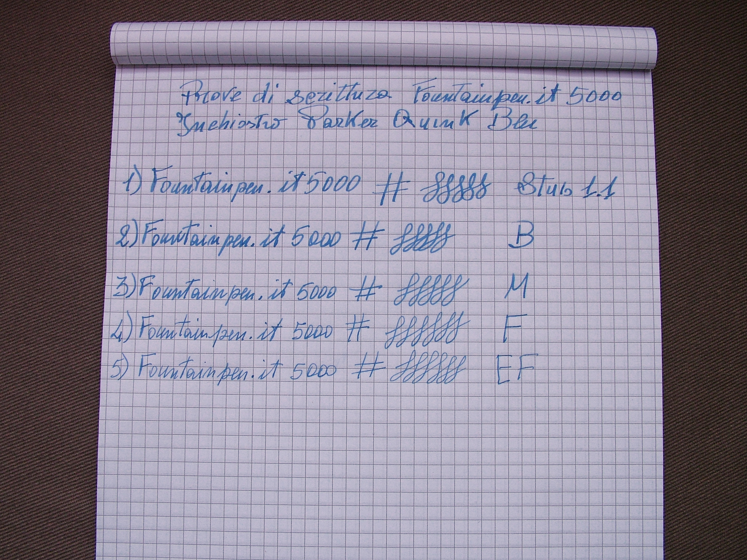 Come promesso ecco a voi le prove di scrittura delle varie gradazioni di pennino (Stub 1.1, B, M, F, EF) con inchiostro Parker Quink Blu (acquistato un mese fa).