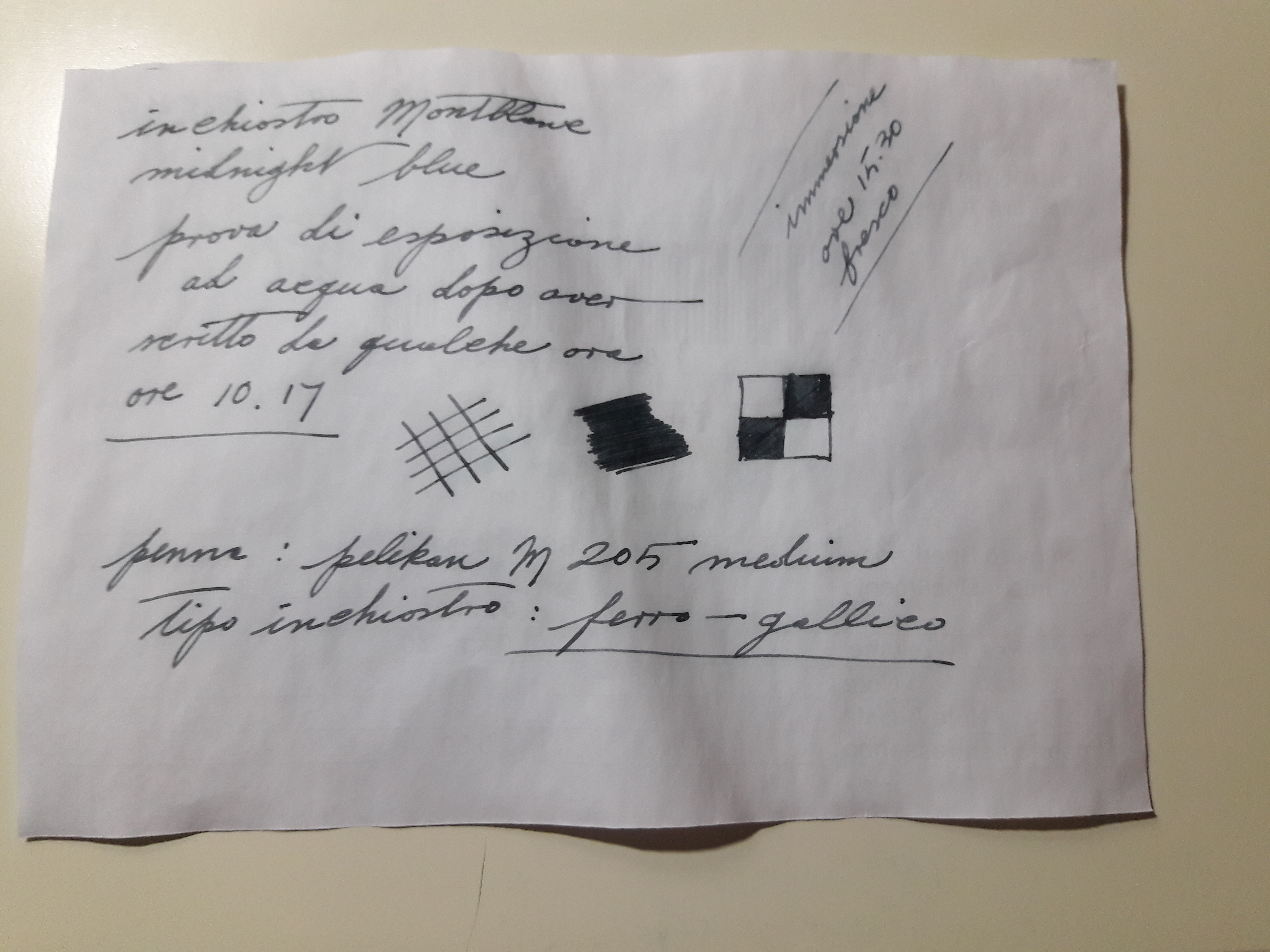 Altro semplice test con Montblanc Midnight Blue il foglio e rimasto immerso qualche minuto in acqua,ho notato solo inizialmente un piccolo rilascio di colore poi niente più.