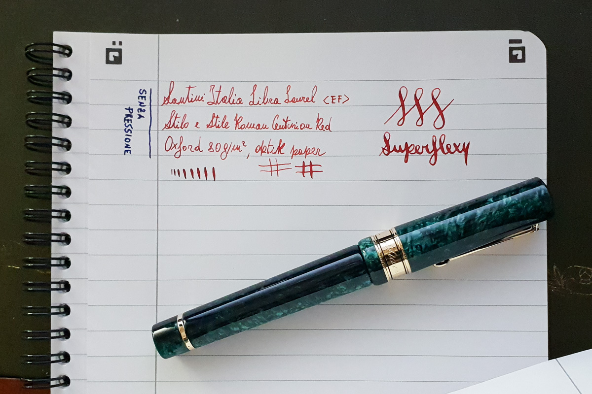 Per quanto riguarda, infine, la scrittura, la mia con pennino ef superflex è favolosa, senza incertezze, senza railroading, morbida, usabilissima con mano leggera come un vero extrafine -non giapponese, no, ma un tratto dignitosamente sottile.