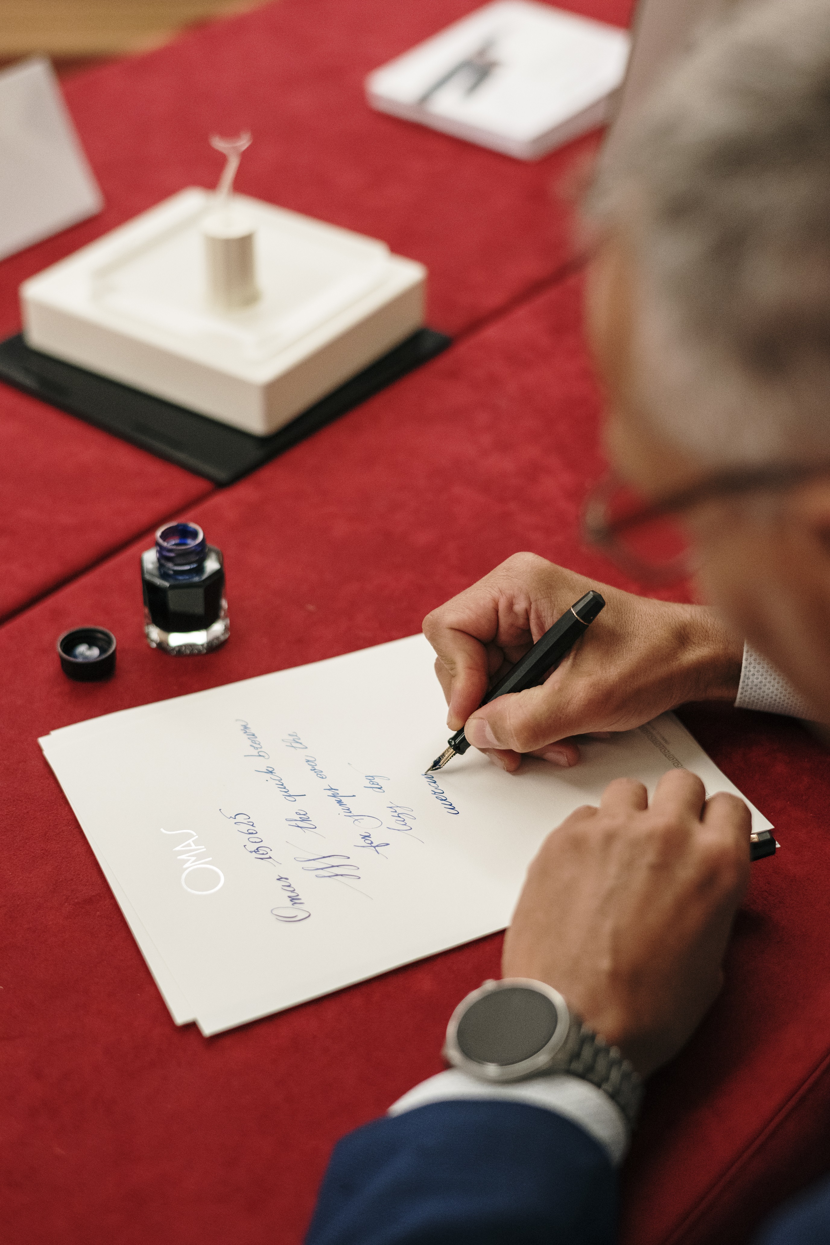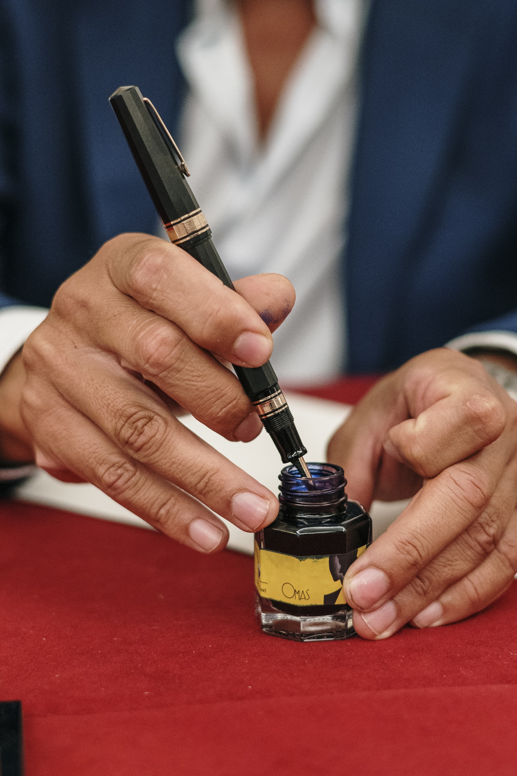 Non siamo stati autorizzati da OMAS a caricare la penna, ma siamo riusciti a provarla per intinzione. Il pennino di questo esemplare e' uno stub medio, direi uno 0.9mm ad occhio. Non e' facile classificarlo, viene da un lotto di pennino che apparteneva alla famiglia e all'epoca non era comune marchiare la gradazione sul pennino. Cosa dire, scrive proprio come una Omas Extra degli anni '30, e' morbido e risponde facilmente alle richieste di variazioni di tratto. La cosa piu' difficele e' stata rimetterla sotto la teca. Tornato a casa ho caricato una Lucens e mi sono quantomeno consolato!