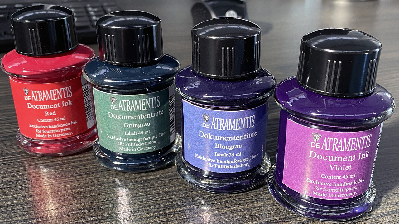 DeAtramentis Document ink rosso, verdegrigio, blugrigio e viola.