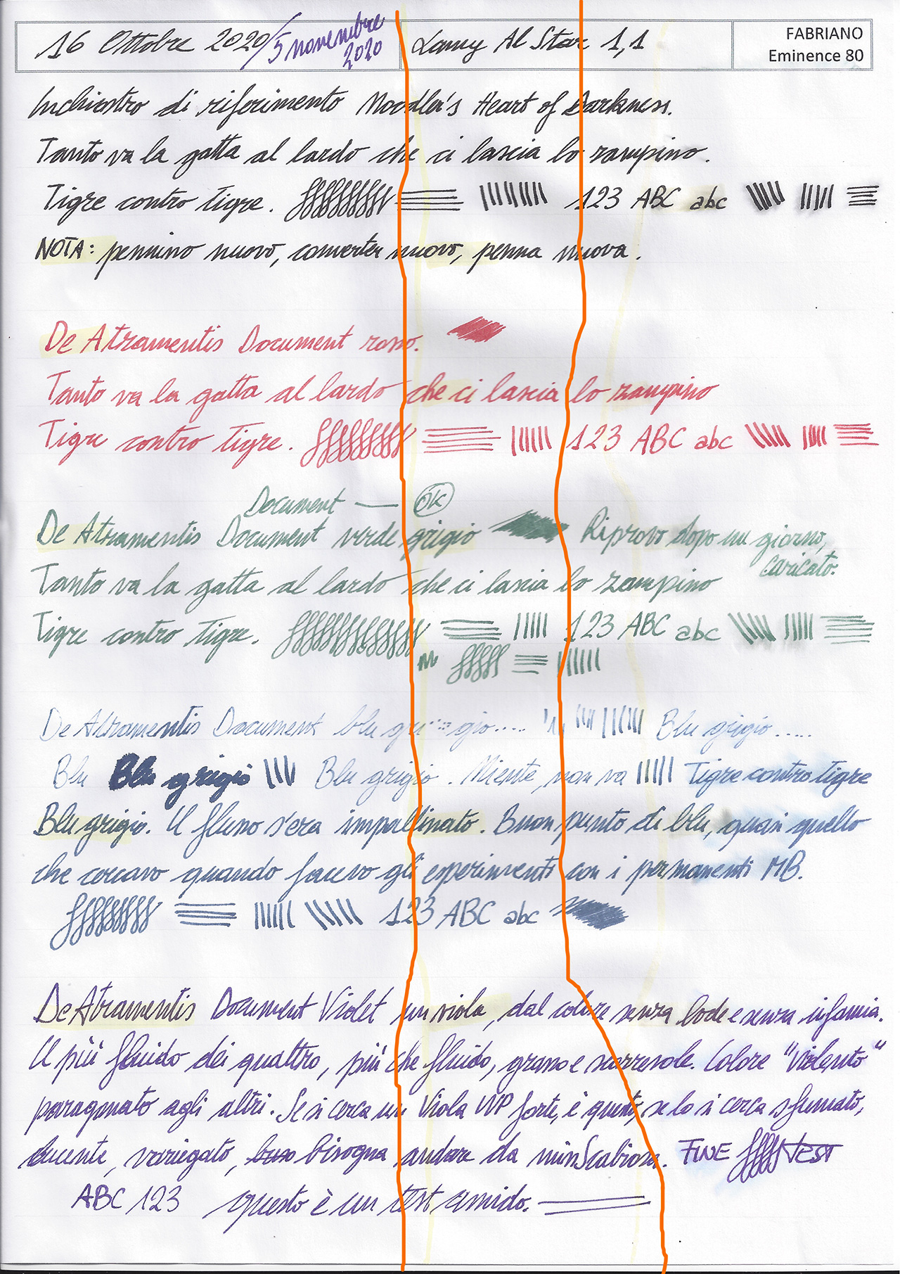 Il blu grigio è risultato essere il più fluido. A ruota il verde grigio poi il viola. Niente a che vedere con i Noodler BP o gli R&K sketch.