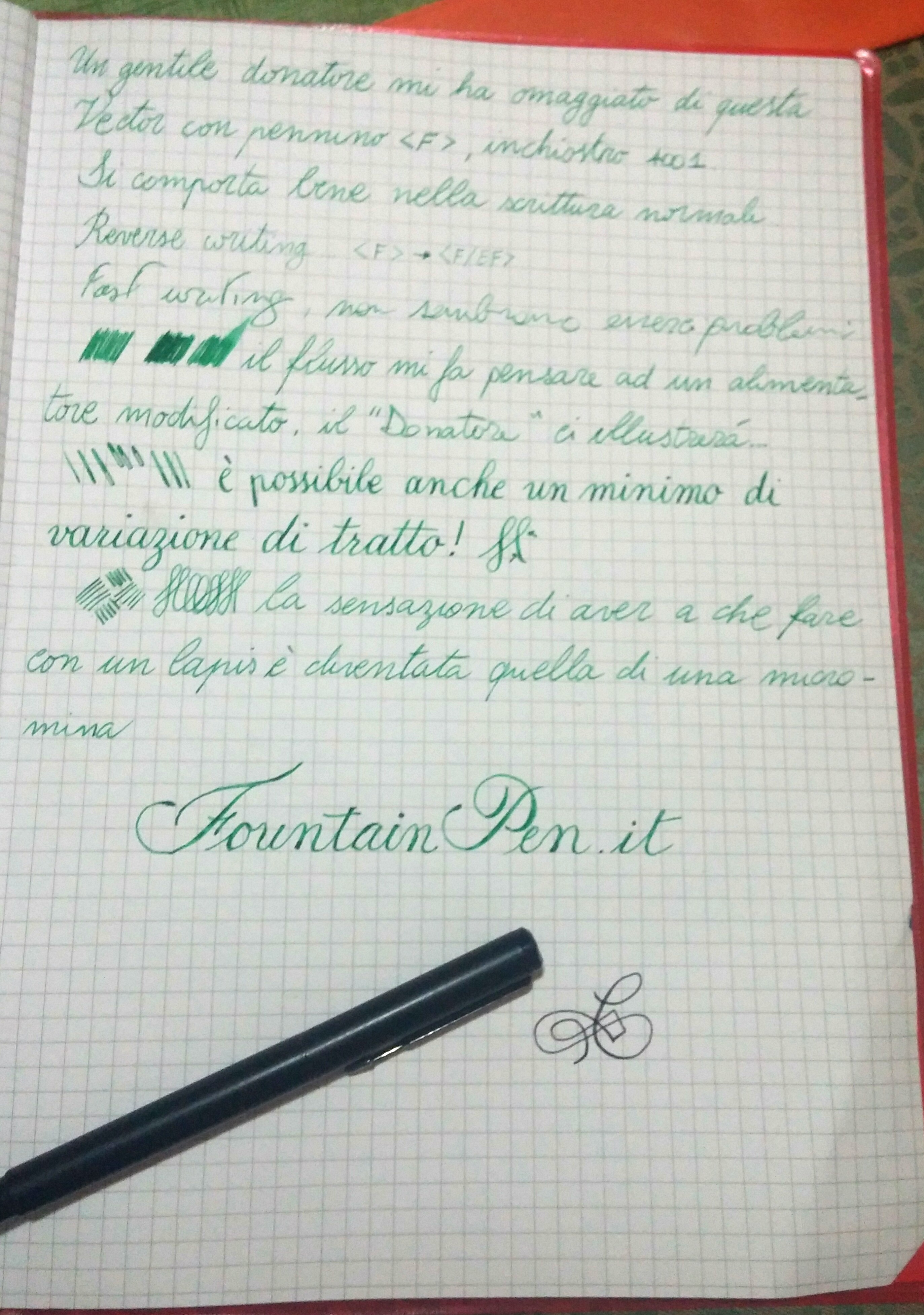Infatti la mia è dotata di un pennino F, ma la dimensione del tratto è più largo di quello della Vector ed ha un flusso più abbondante a parità di tipo di inchiostro.