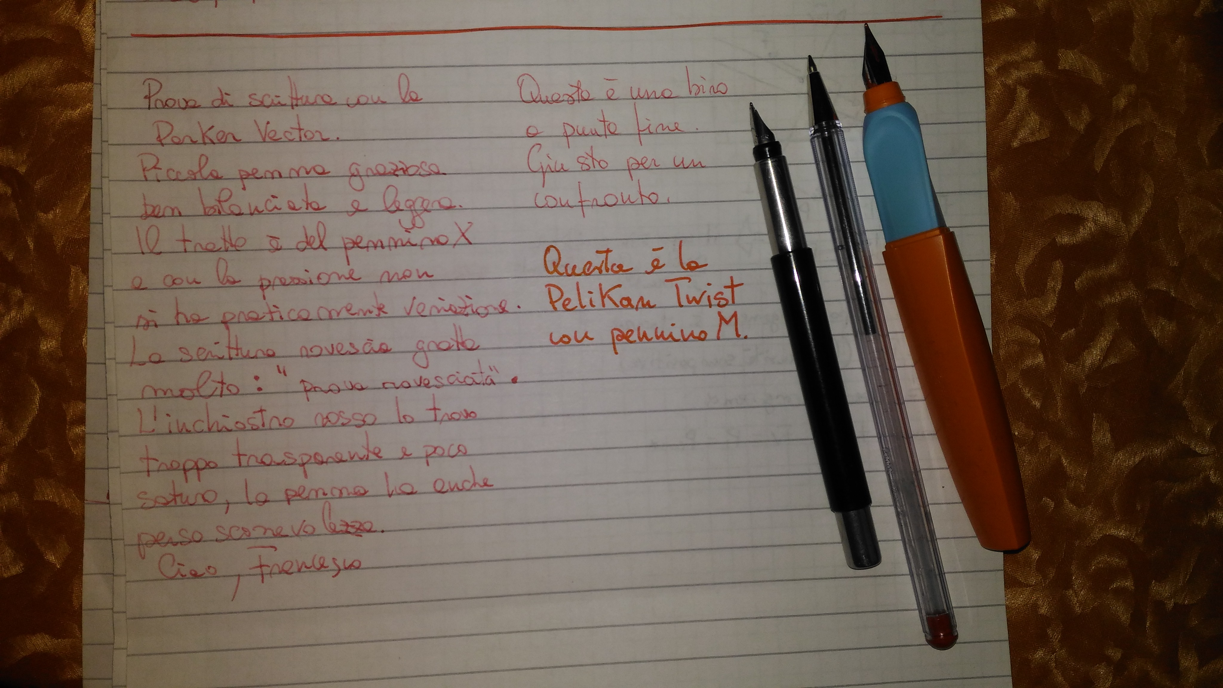 Faccio la domanda perché io mi trovo bene, ma passando per il negozio specializzato della mia città il negoziante me l'ha distrutta, ha parlato male della Parker e ha detto senza mezzi termini che la Vector è la peggior Parker mai prodotta. L'unico confronto che ho è con due Pelikan Twin. Hanno il pennino medio, che per me è troppo largo. Perciò tendo ad usare sempre la Vector. Tornando al venditore mi ha sponsorizzato la Lamy, in particolare il modello Safary volendo volare basso. Stimando anche gli inchiostri che a suo giudizio anche in questo caso molto migliori di quelli delle cartuccie Parker.