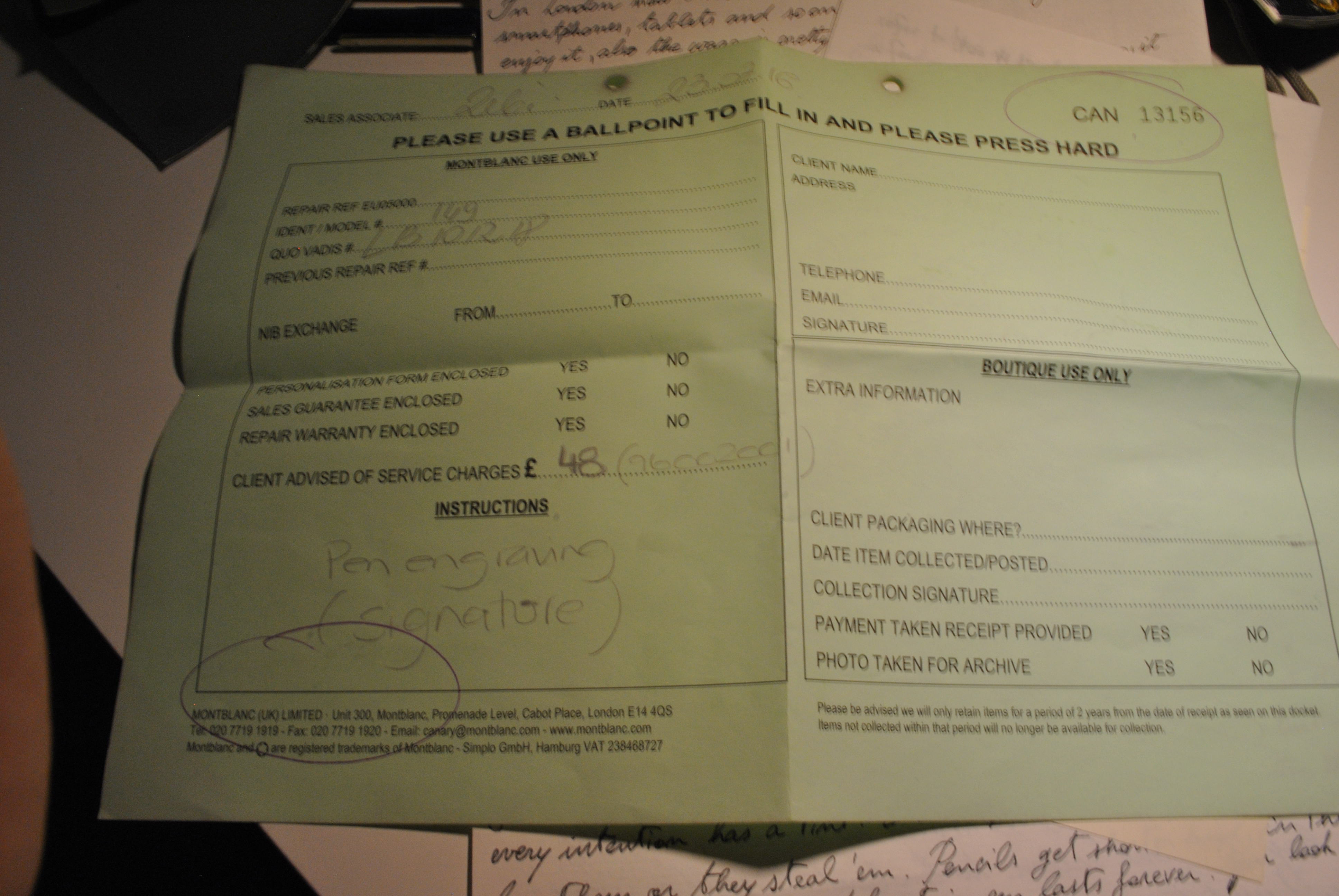 La penna è tornata nella stessa Boutique il 7 Giugno espressamente per un Checkup annuale prima della partenza per Londra, l'hanno tenuta quattro giorni e mi hanno fornito una bellissima ricevuta con la descrizione dettagliata dei vari processi di pulitura e manutenzione che gli hanno fatto prima di riconsegnarmela in condizioni molto più che perfette.