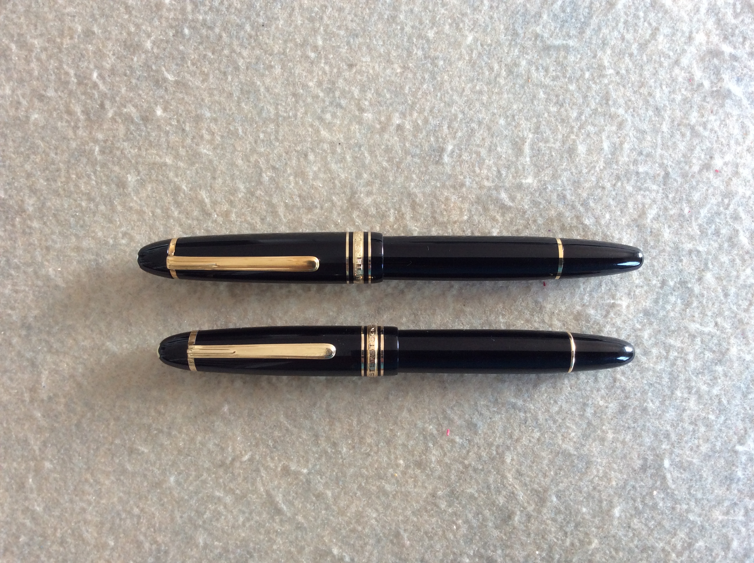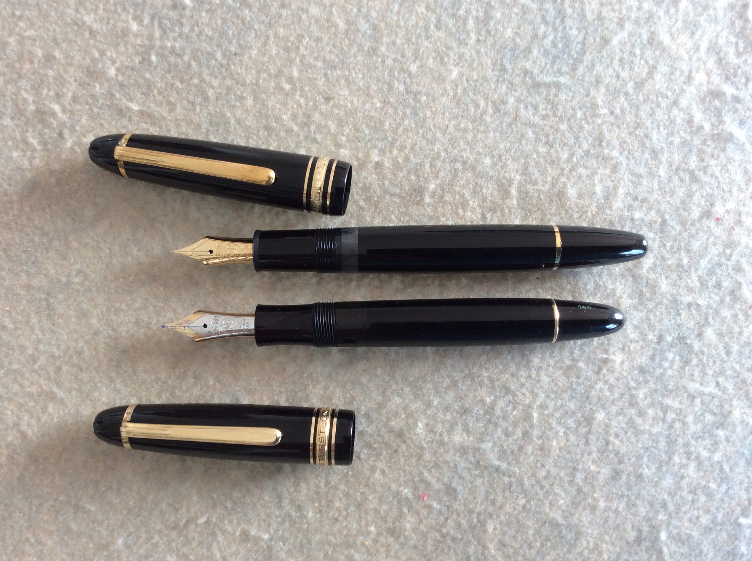 Purtroppo non ho foto di quelle in celluloide nera, ma il tipo di pennino e di caricamento (telescopico) è lo stesso. Sono in genere (il meccanismo è tutto in metallo) più pesanti delle attuali, ma l'apparenza è identica, e le dimensioni comparabili (non le ho mai confrontate direttamente però).
