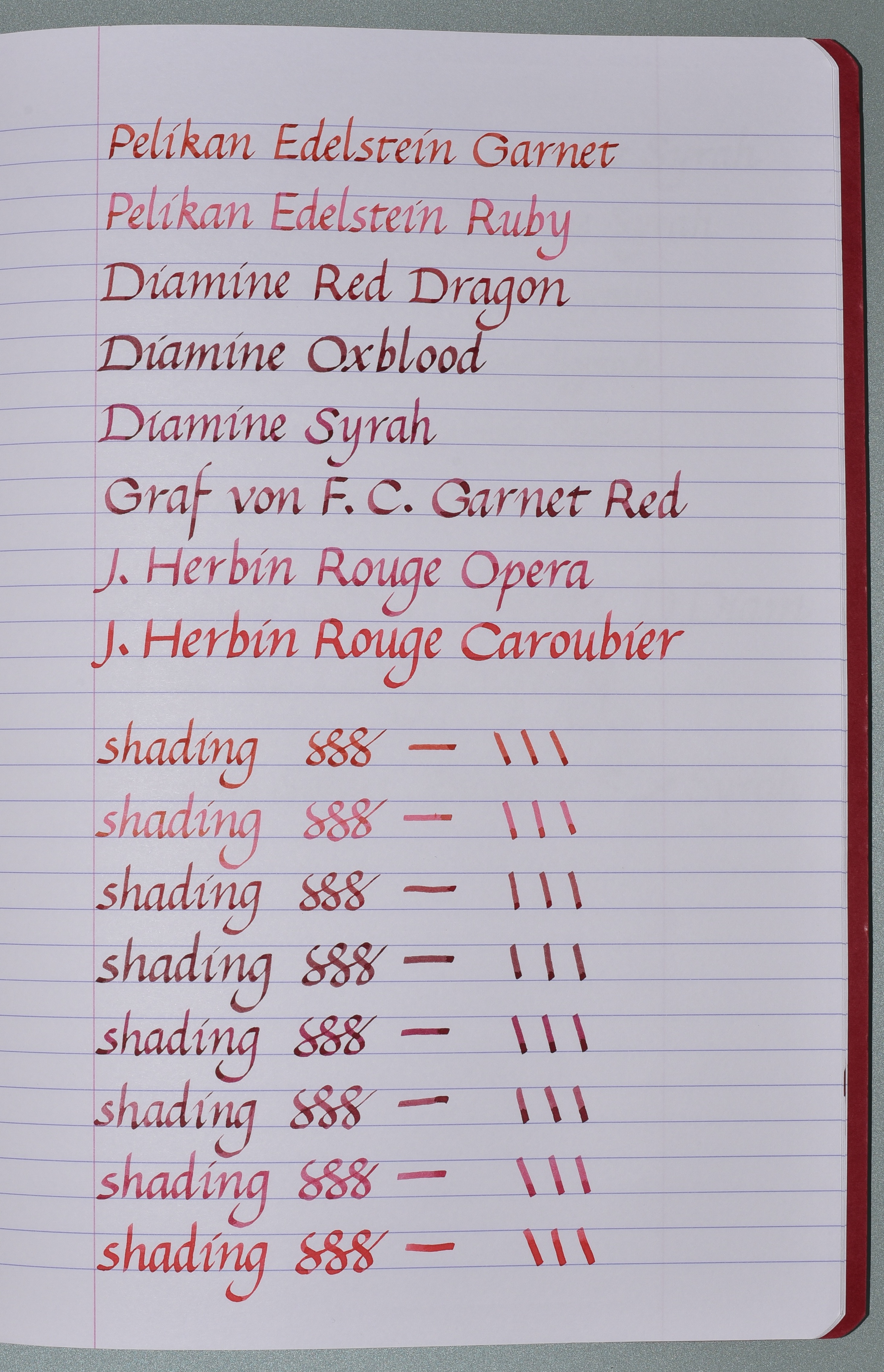 Pubblico lo shading dei miei inchiostri rossi, rosa, viola e blu.