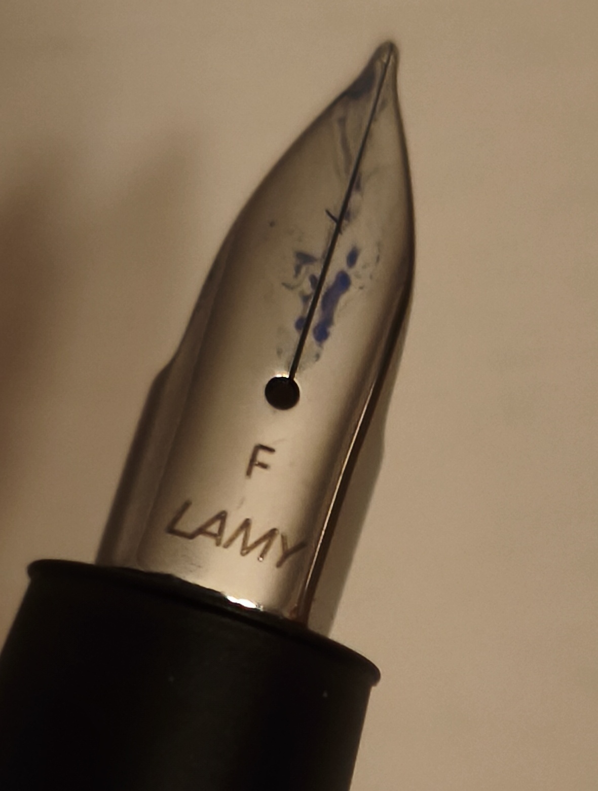 Pennino F in acciaio rodiato molto filante sia nel design che nella scorrevolezza e seppur a fatica scrive anche in reverso. Tende a sporcarsi abbastanza da come si vede in foto però è davvero una stilo da usare senza patemi anche se un filo pesante.
