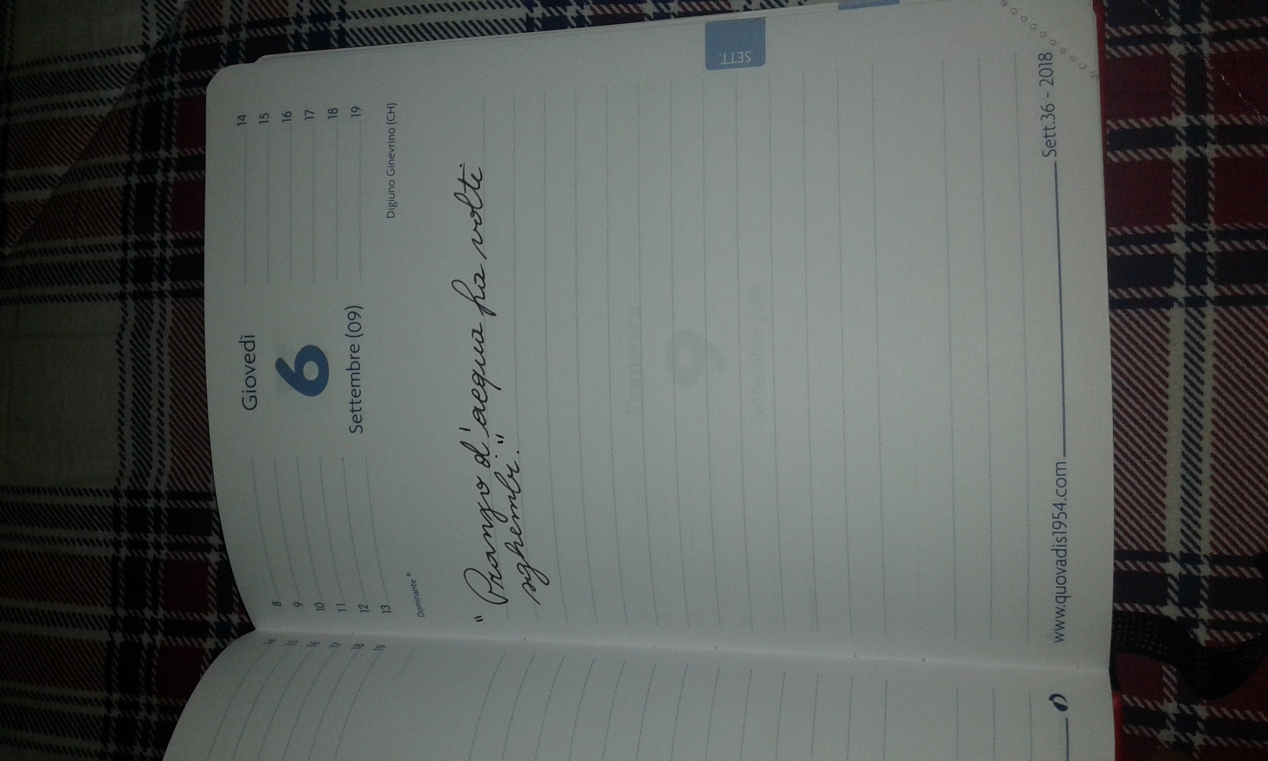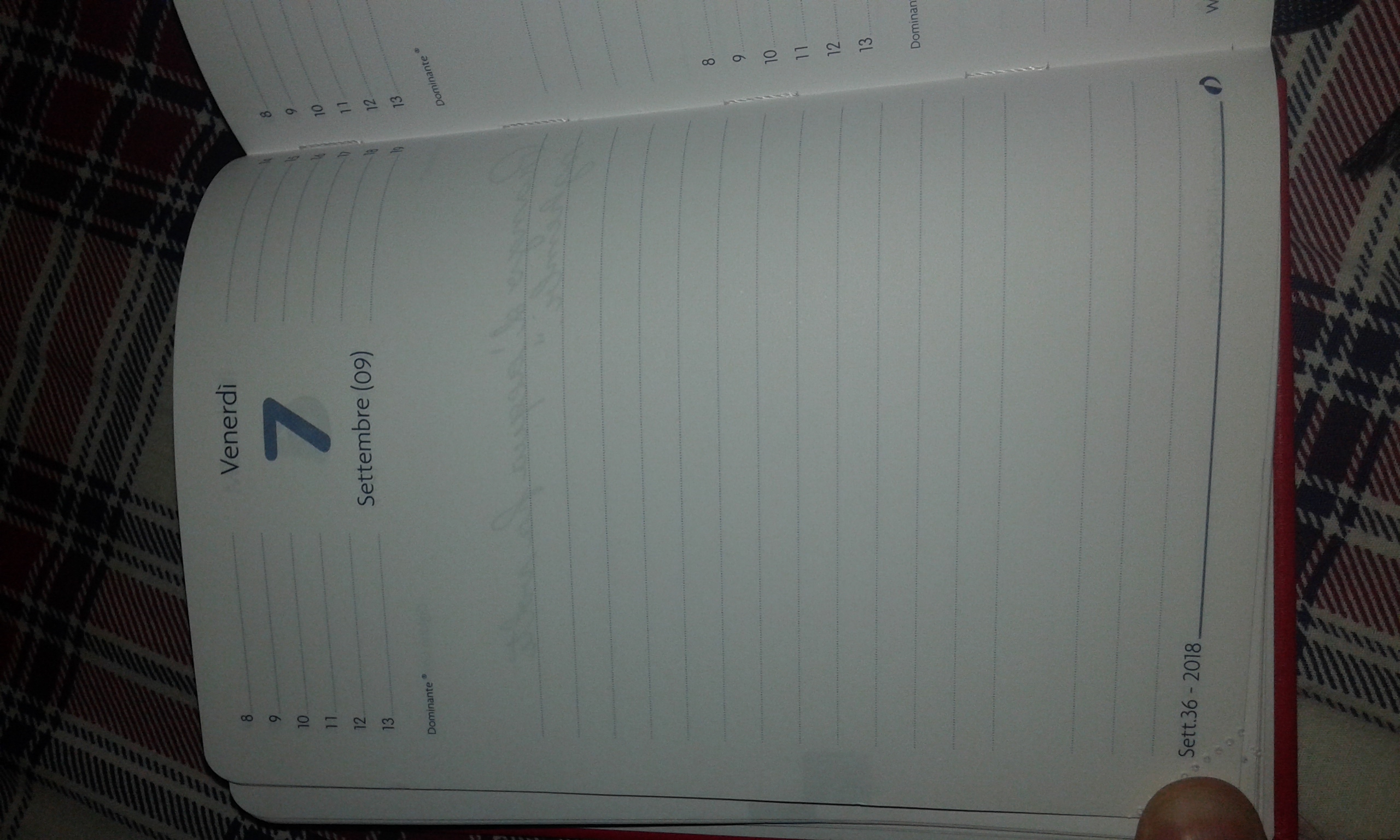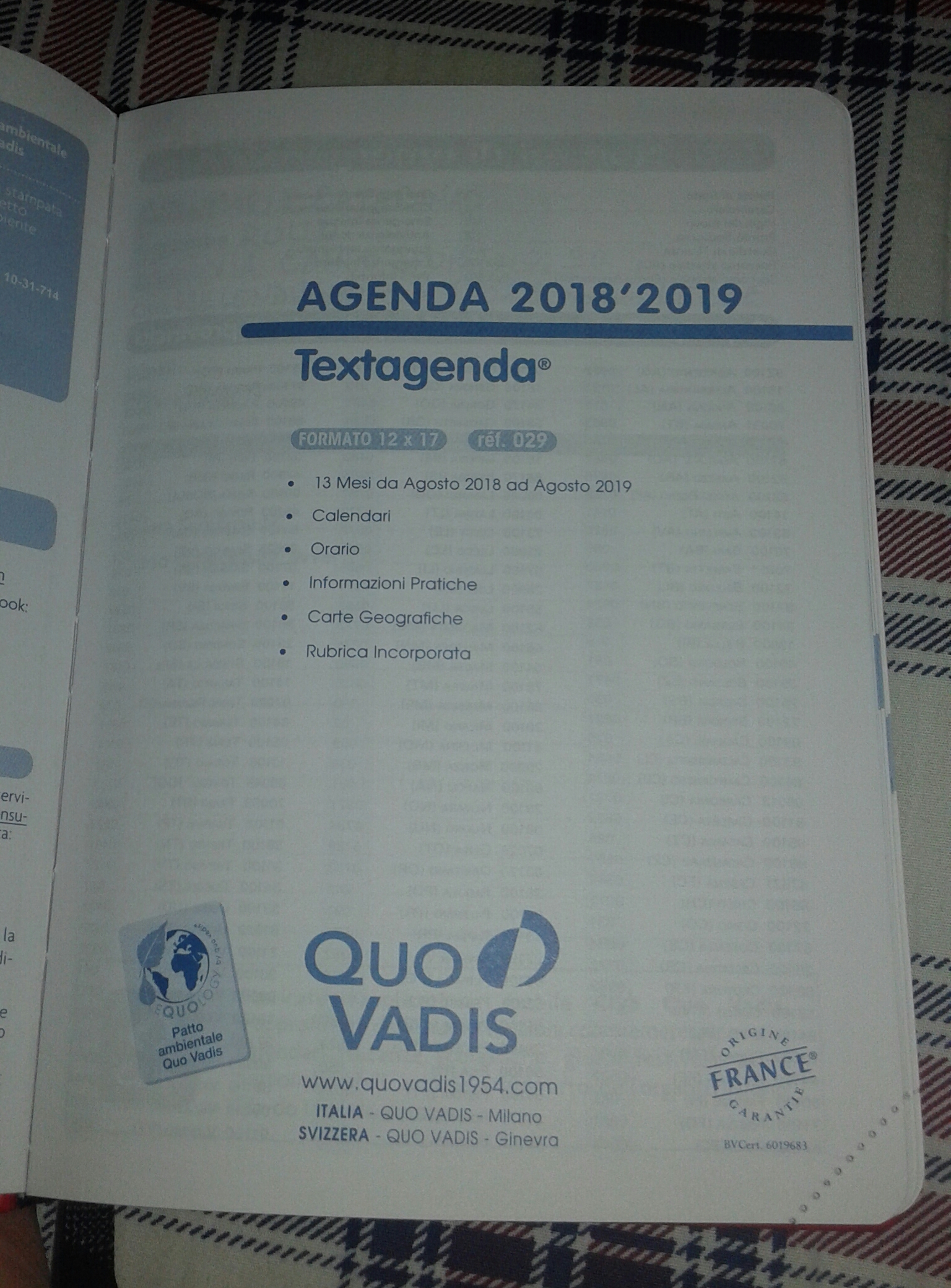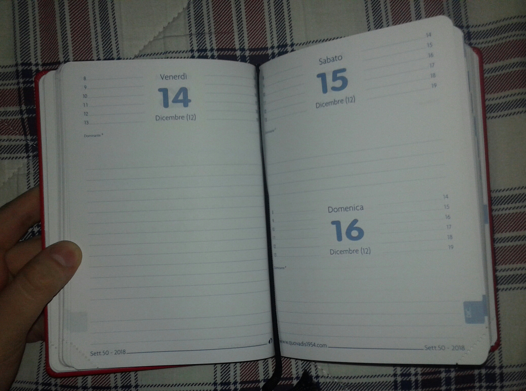 Devo dire la verità, per scegliere l'agenda di quest'anno ci ho messo un pò! Volevo provare qualcosa di nuovo e alla fine ho acquistato una Quo Vadis Textagenda. È poco più piccola di un formato A5, occupa poco spazio ed ha un elastico per non disperdere eventuali fogli inseriti tra le sue pagine.... e che carta ( 80 gr )! Ottima per le stilo! L'ho accoppiata con una Platinum Plaisir rossa, pennino Fine (al momento caricata con una cartuccia proprietaria di inchiostro nero). Le pagine bianche reggono senza fatica l'inchiostro e lasciano pulita la seconda facciata. Ho preso quella da tredici mesi ma, se non ricordo male, pare sia disponibile anche da sedici e diciotto e, ovviamente, se lo si preferisce, in un formato più piccolo. Ultima cosa, per me importante -anzi, fondamentale!- ha un giorno per ogni pagina, solo i festivi sono disposti su due.