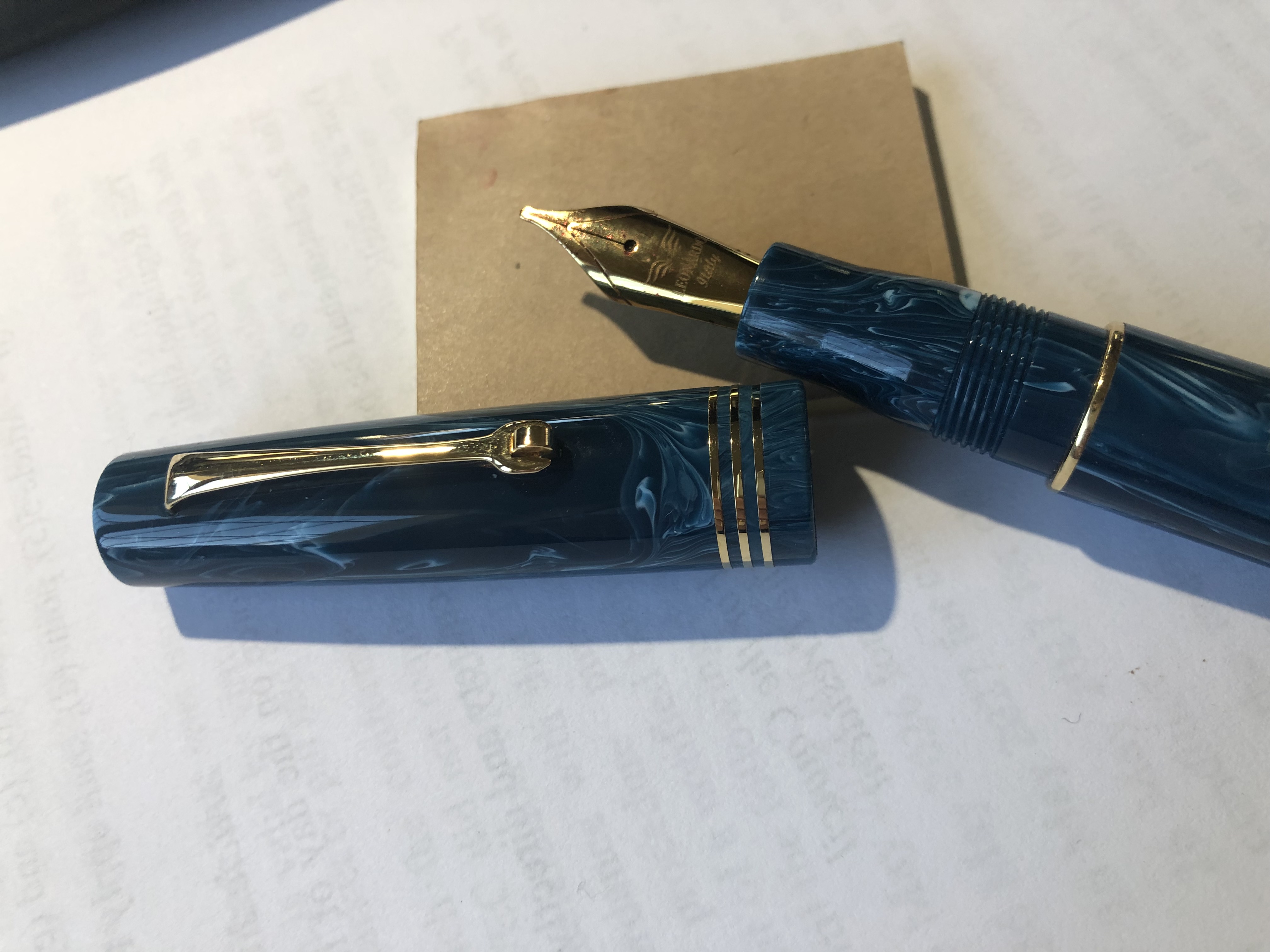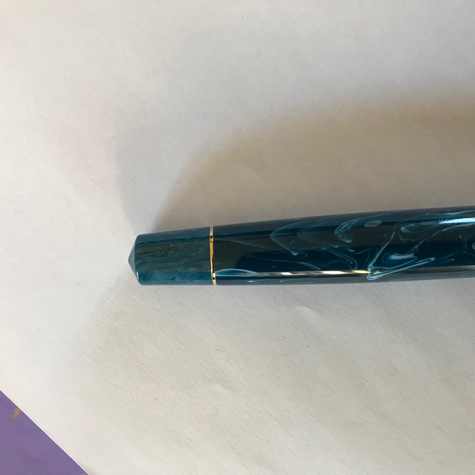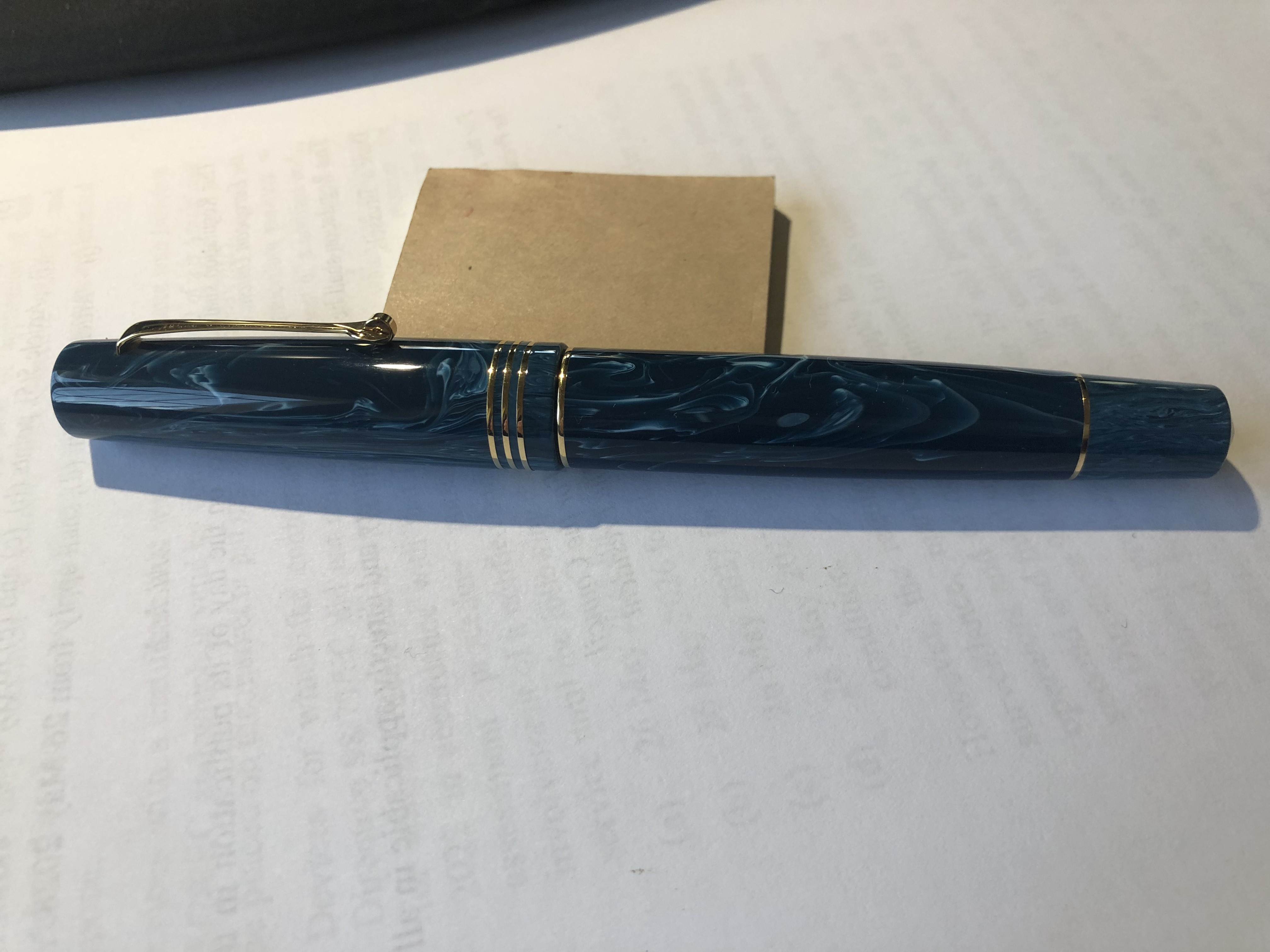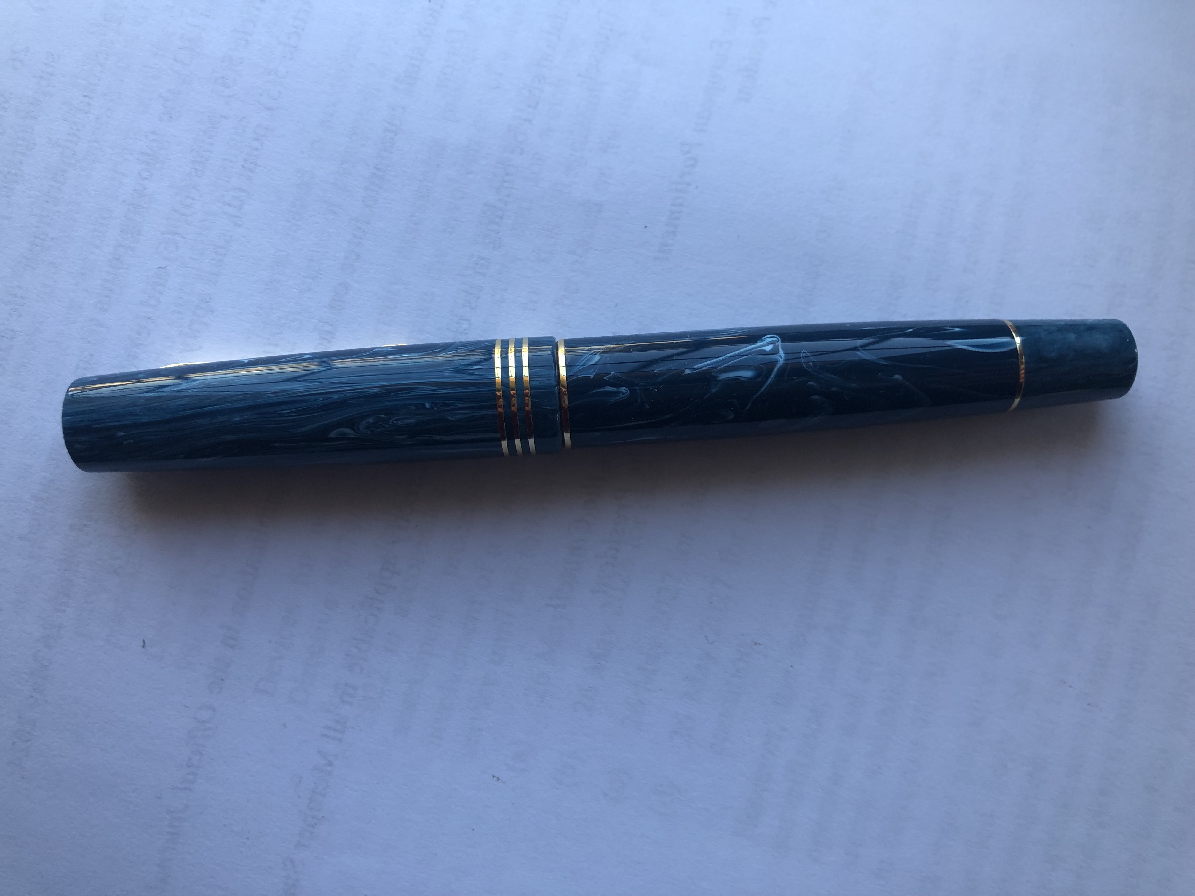 Cosa aggiungere? La resina e' molto bella. L'unico micro appunto e' che nella mia vi e' una netta differenza di colore e "tessitura" tra il corpo centrale che e' di un bel blu profondo venato azzurro chiaro ed il fondello che evidentemente e' di una fusione diversa. Di tonalita' piu' chiara e con venature molto meno marcate e contrastate. Insomma un piccolo "neo" che tutto sommato non e' cosi' grave considerando che e' una bella penna dal prezzo ancora piuttosto contenuto.