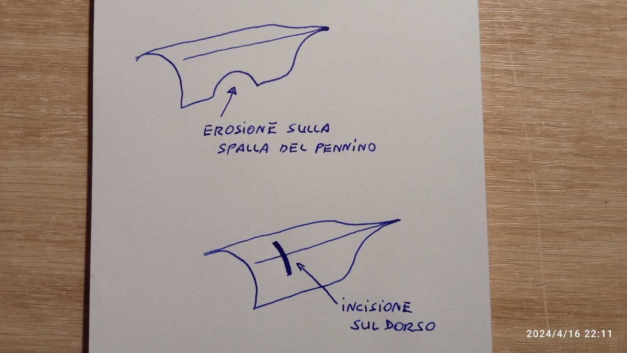 Innanzitutto complimenti per l'operazione di erosione col Dremel. E poi una curiosità. Ti chiedo: perché la spalla e non il dorso? Secondo te con una fresa sottile si può incidere il dorso perpendicolarmente al taglio del pennino? Secondo me sottrarre tensione al dorso invece che alla spalla produce a parità di pressione maggiore apertura dei rebbi. Ci hai mai provato?