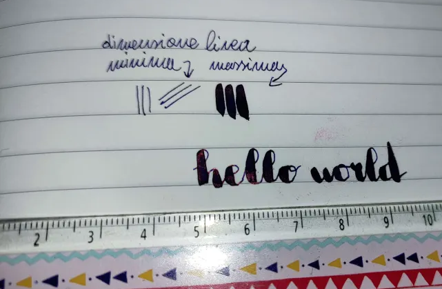 Ti mostro come ho proceduto con il test di rigidità nelle due illustrazioni di seguito. Molto semplicemente si utilizza della carta millimetrata. Il pennino FPR #5.5 raggiunge un indice davvero ottimo. È sufficiente una pressione di 210-230g per raggiungere l'apertura di 1 mm. Nota i primi due segni sulla sinistra che rappresentano il tratto del pennino a pressione nulla o quasi.