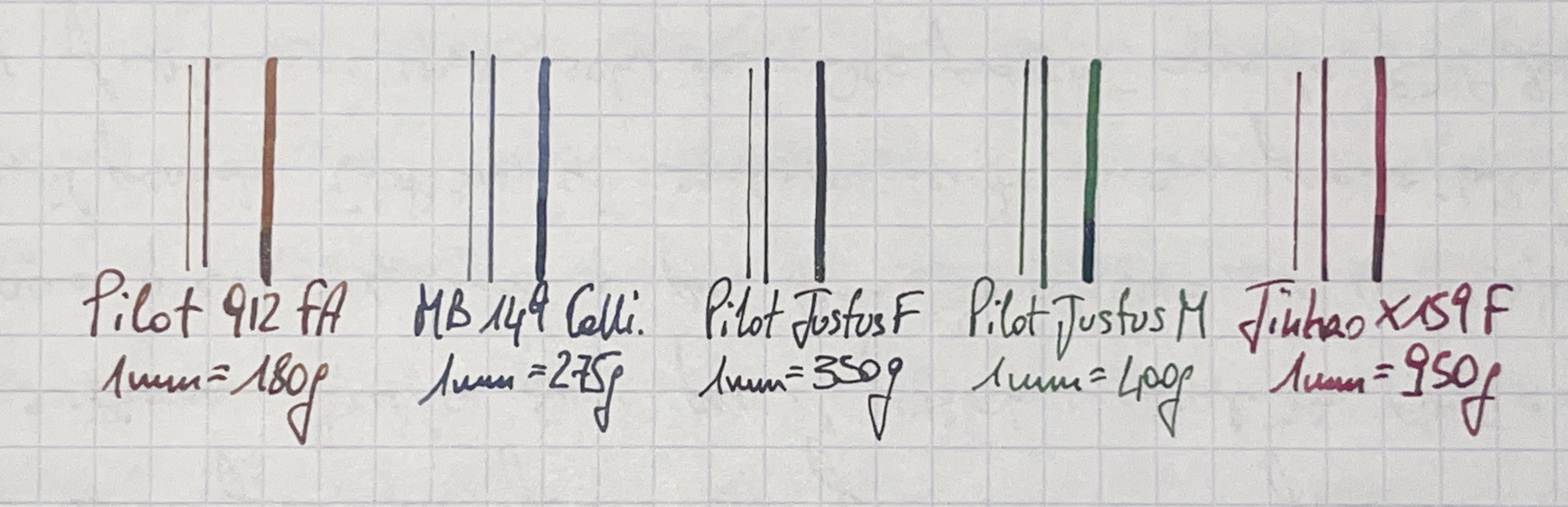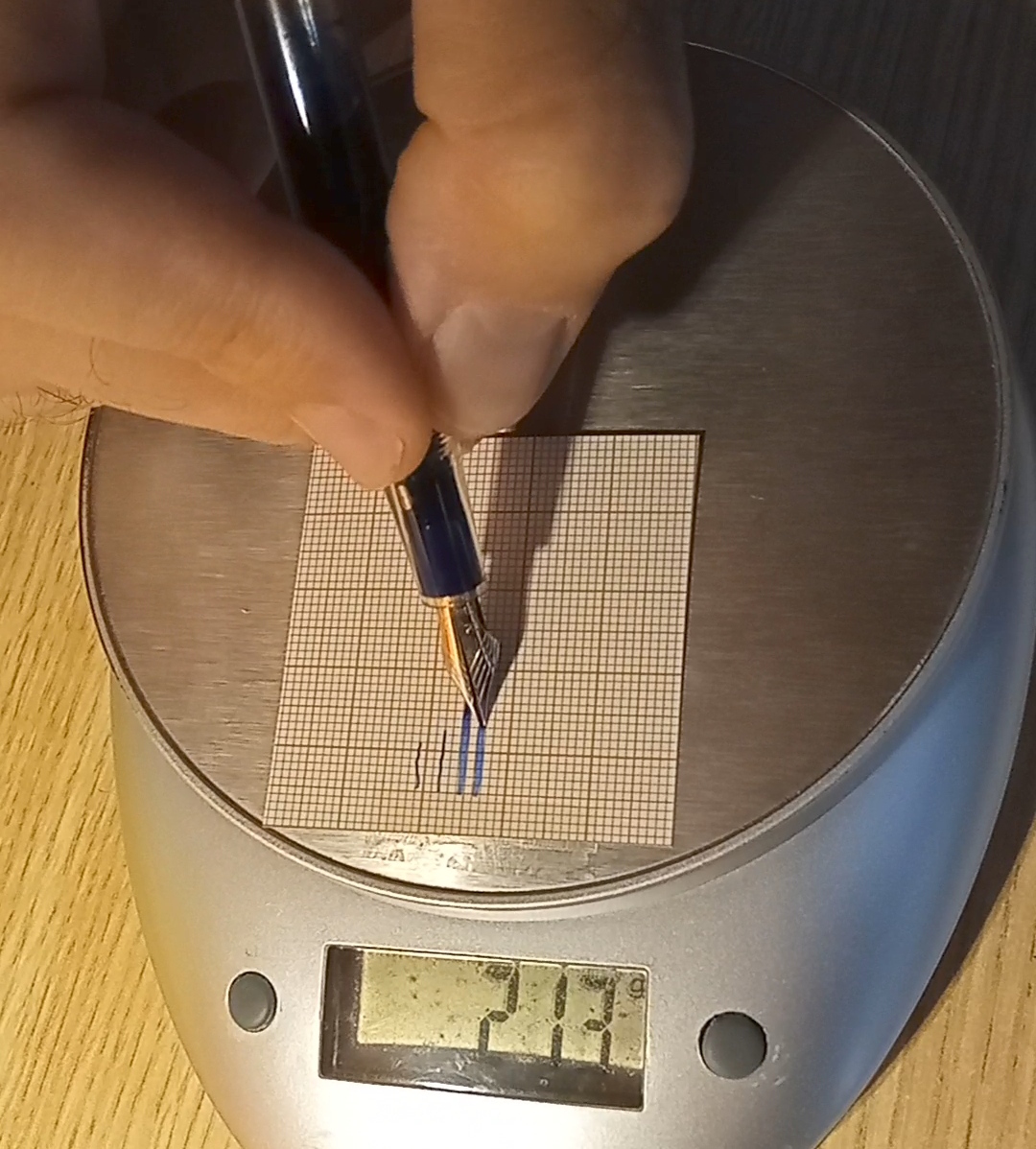 Da parte mia, anche per la flessibilità dei pennini non viene definita da nessuno standard, ritengo che dover premere 250g per arrivare ad 1mm sia una enormità, ed anche che chi applica più di 400g ad un pennino dovrebbe essere arrestato per il reato di tortura stilografica, ma sono appunto, opinioni.