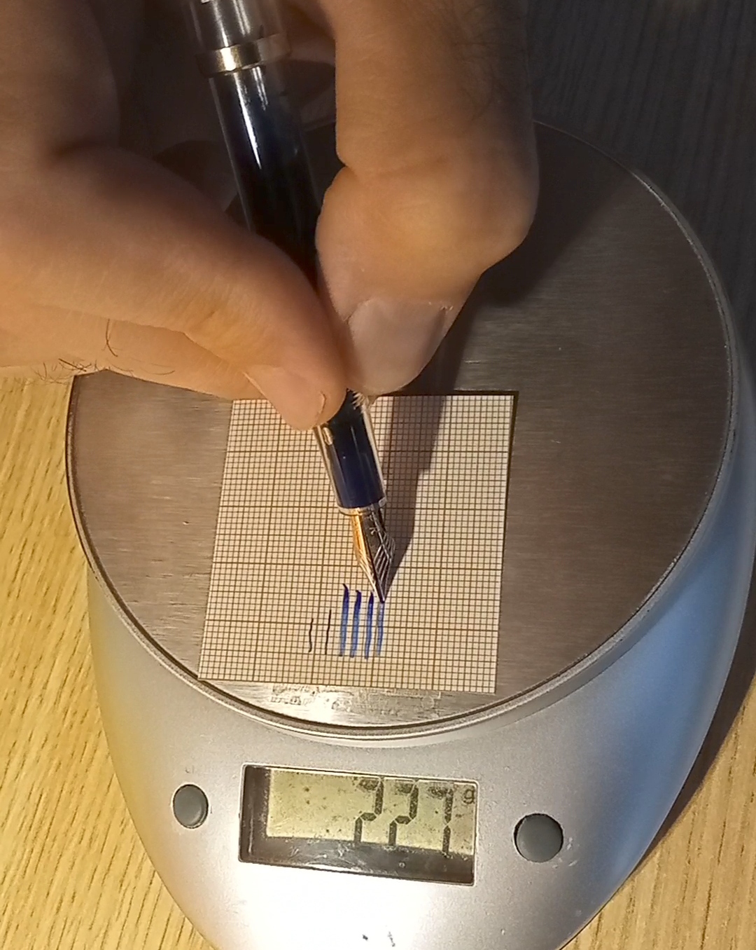 Un chilogrammo di pressione per esser classificato rigido? Ma questi la penna la usano come taglierino o devono ricalcare a carta carbone su 4 copie? Suggerisco a chiunque voglia dare una stima attendibile della flessibilità di un pennino di leggere questo articolo di David Nishimura: