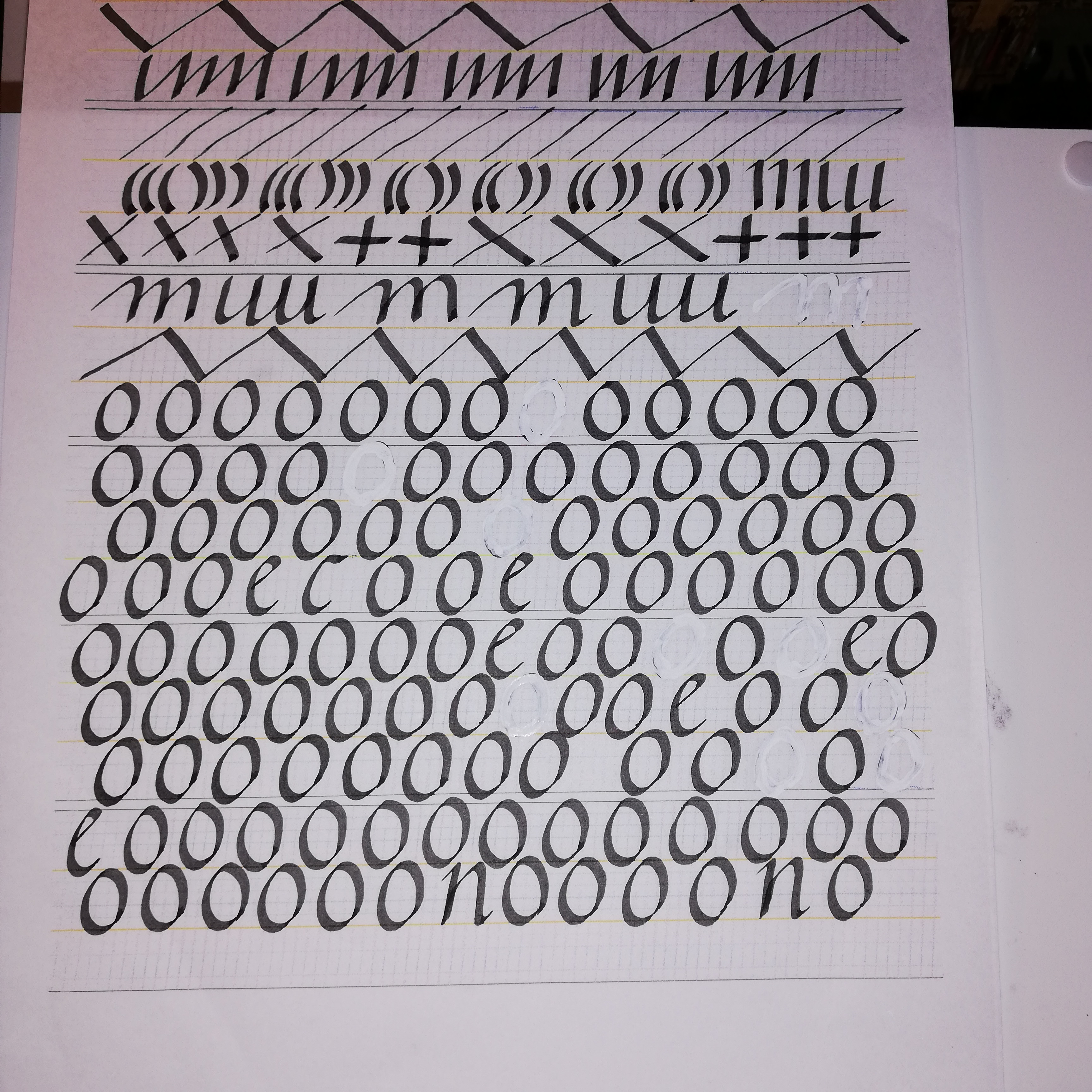 Detto questo, io noto nei due esercizi un po’ di fretta. Ci sono delle “o” fatte davvero bene (guarda la quartultima del secondo foglio) ma poi ho l’impressione che la mano ti sfugga, che non ti soffermi abbastanza sulla singola lettera, a guardarla, studiarla.