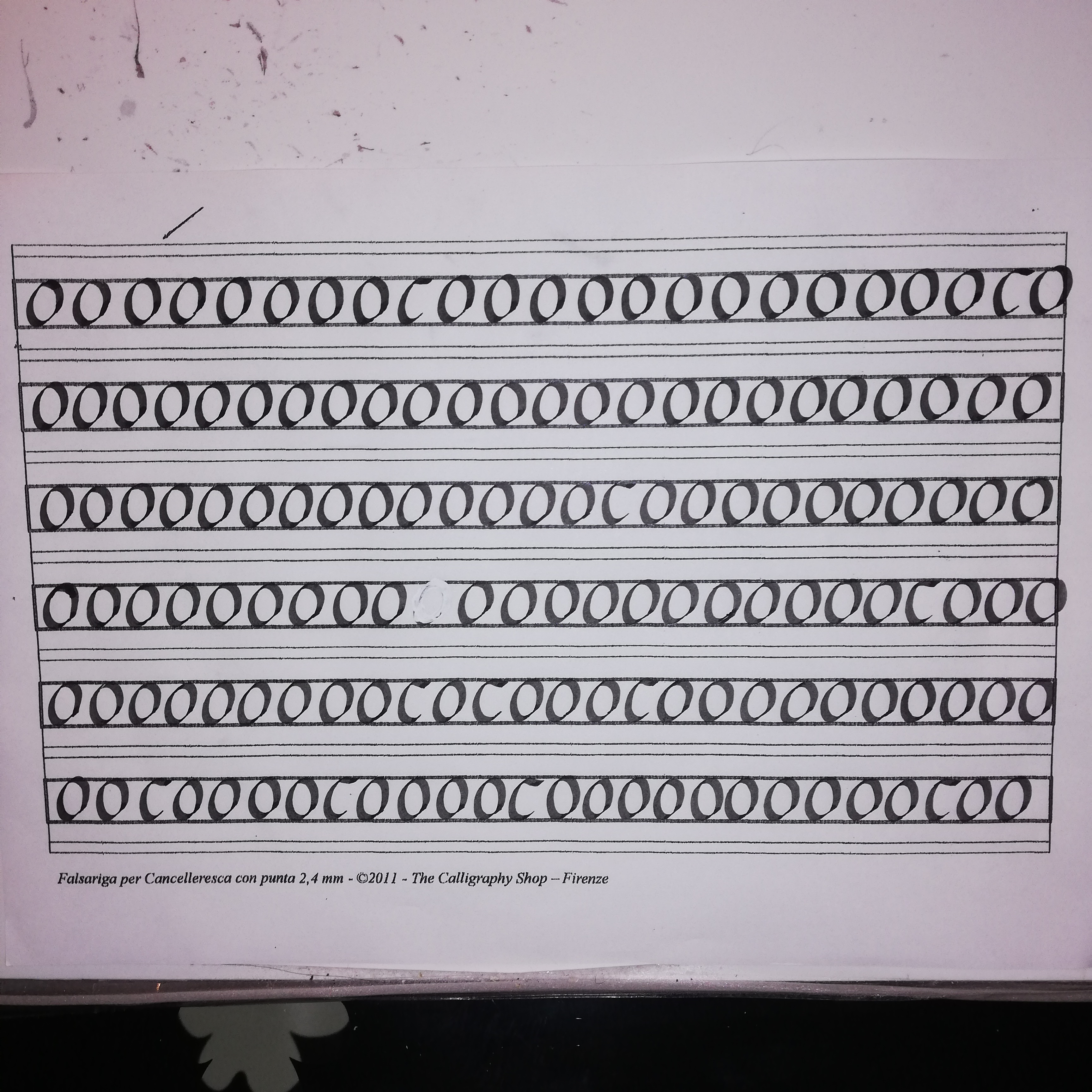 Stai migliorando. La lettera o non è fra le più facili da affrontare! Ti aiuterebbe senz'altro una falsariga in cui siano tracciate anche una serie non troppo fitta di linee inclinate, per migliorare e mantenere costante l'inclinazione.
