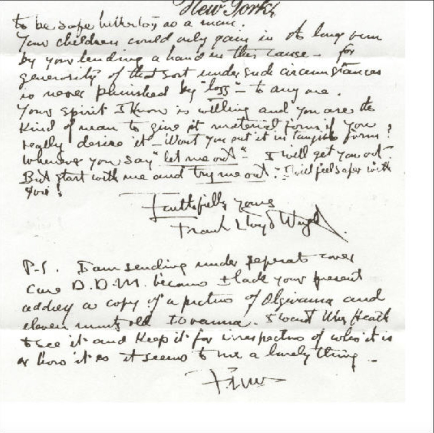 Non ha buona risoluzione e non prova nulla, ma é la grafia di Frank Lloyd-Wright.
