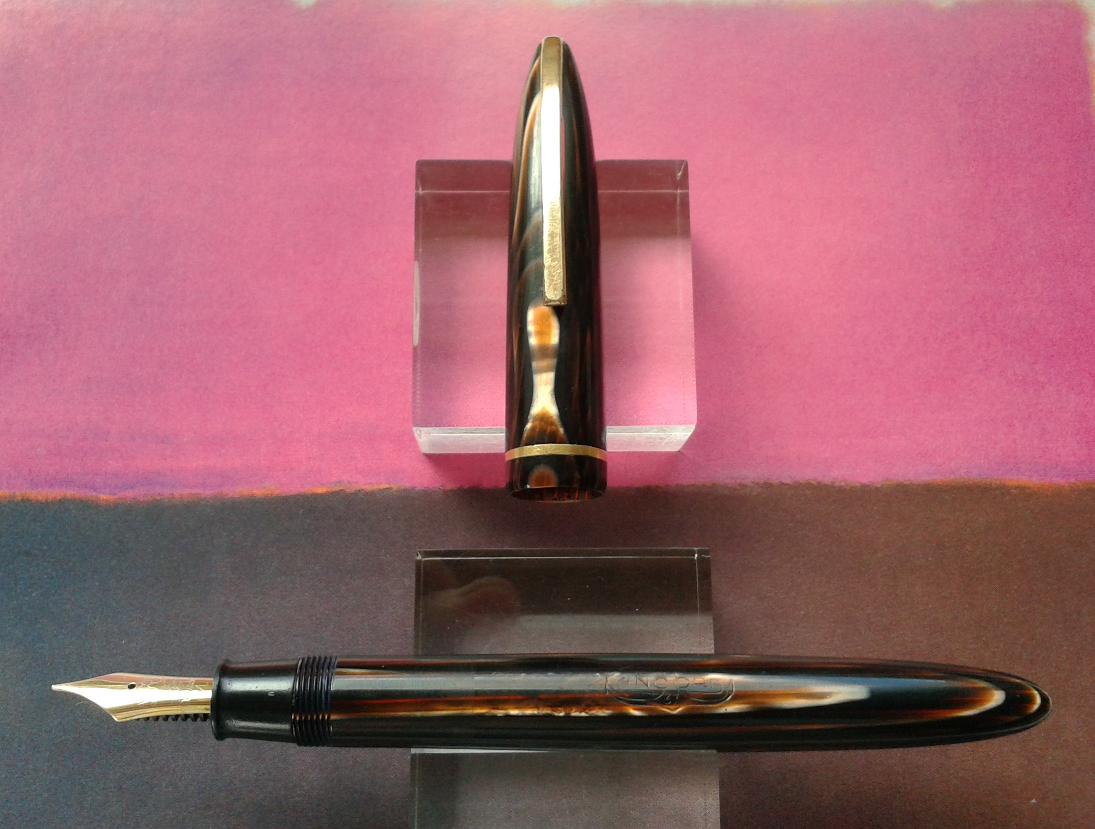 La penna è in celluloide Arco Marrone, non so se qualcuno ha avuto modo di accorgersene, ma è un materiale che mi piace un sacco, quando lo vedo mi si illumina l’animo.