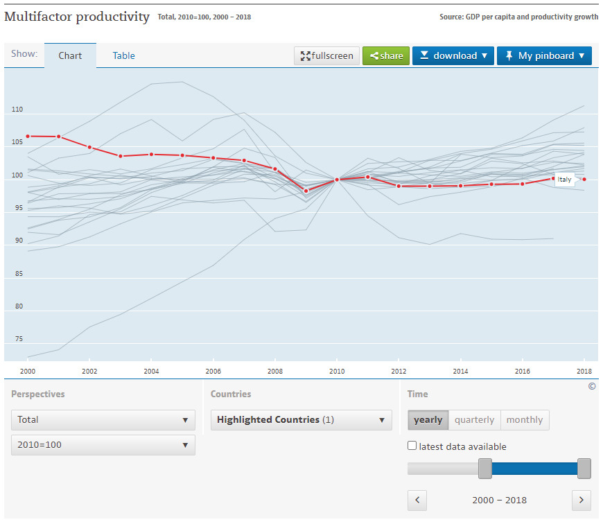 la produttività multifattoriale italiana (confrontata con quella di tutti i paesi OECD) dal 2000 al 2018 è diminuita, mentre quella di tutti gli altri cresceva. Fonte OECD.