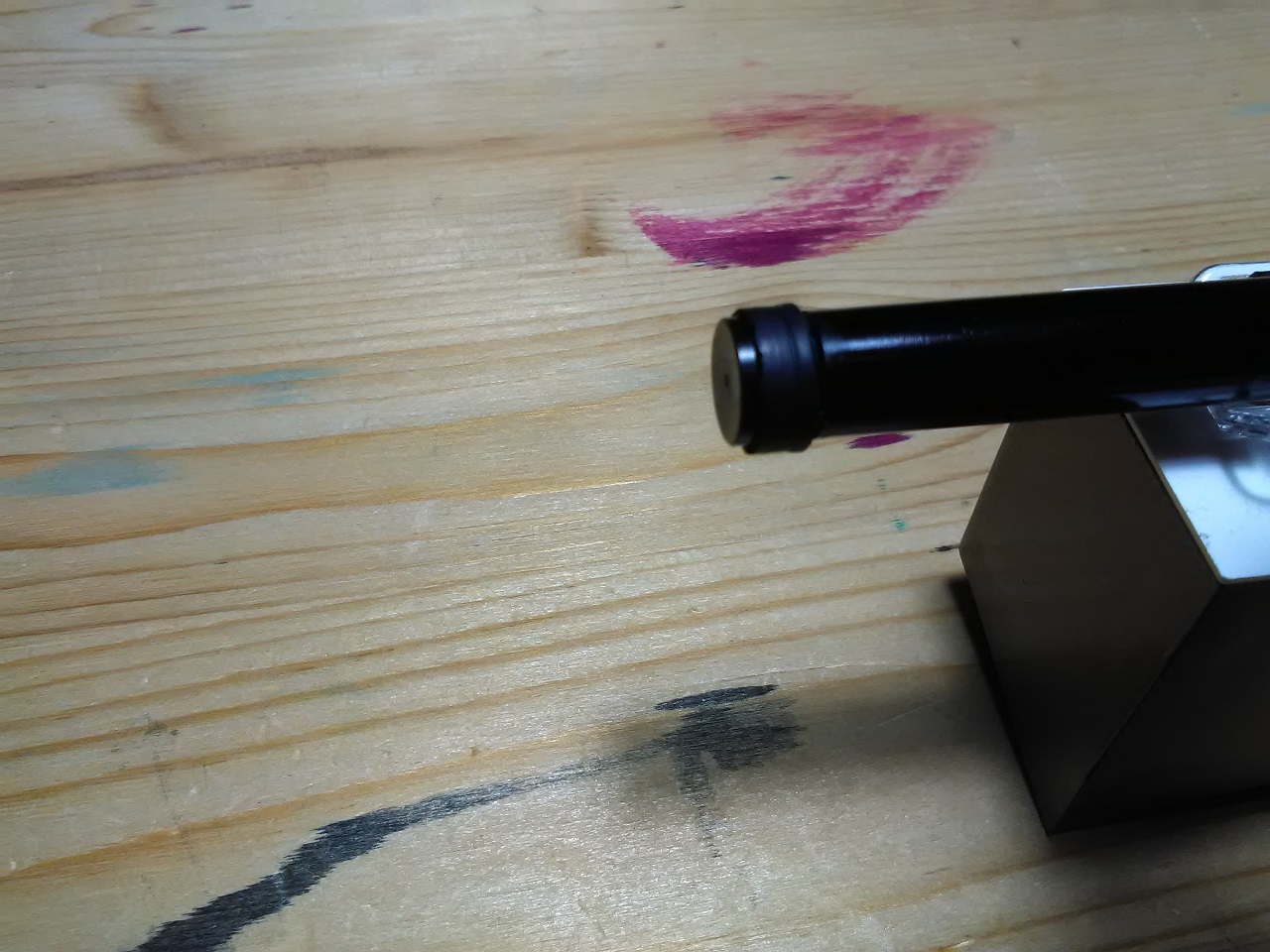 Ultimo tocco: il pistone non dovrebbe girare all’interno del fusto, ma ho pensato comunque di sporcare la punta della vite con un puntino di colla per evitare che si sviti.