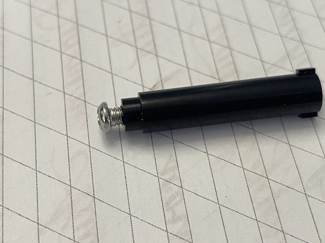 2º gommino: ho visto che lo stantuffo della siringa entra perfettamente nel fusto della penna e ho deciso di sfruttare la filettatura in cima al pistone. Tagliato il corpo stantuffo e fresato le 4 ali in modo che entrassero nella filettatura, intenzionato a metterci della colla a caldo. Illuminazione: e se provassi con una vite M4? La vite M4x14 entra perfettamente, ma facendo calzare la gomma della siringa, questa va a sormontare il pistone risultando ancora troppo grossa. Con una M4x16 (2mm più lunga) la gomma si infila sulla capocchia della vite come se fosse quella dello stantuffo. Perfetta!