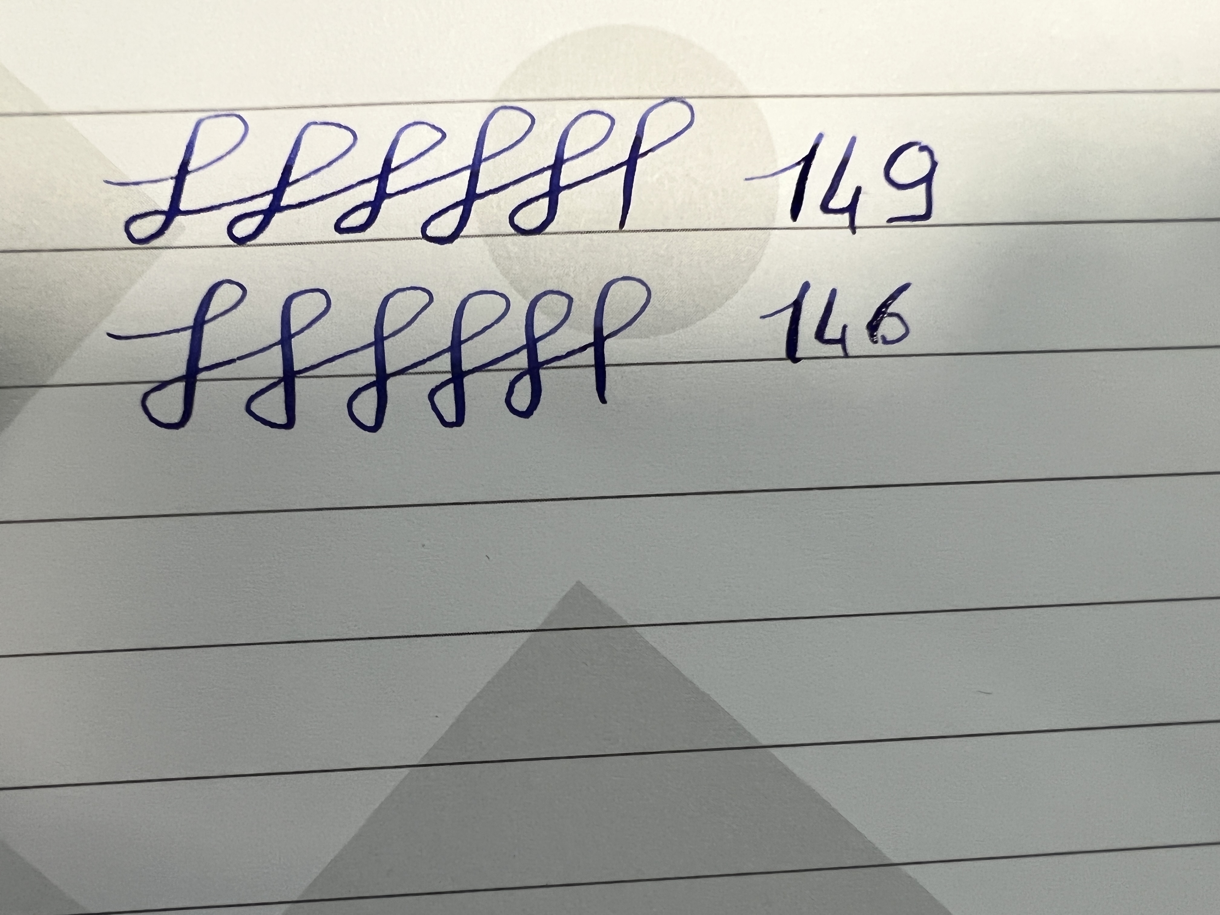 La 146 è perfetta per la scrittura di tutti i giorni. Secondo me può sostituire una classica 146 con pennino F, con l’opportunità di avere una variazione di tratto piacevole ma poco impegnativa. Tratto di partenza sicuramente extra fine. Più fine della 149 senza dubbio.