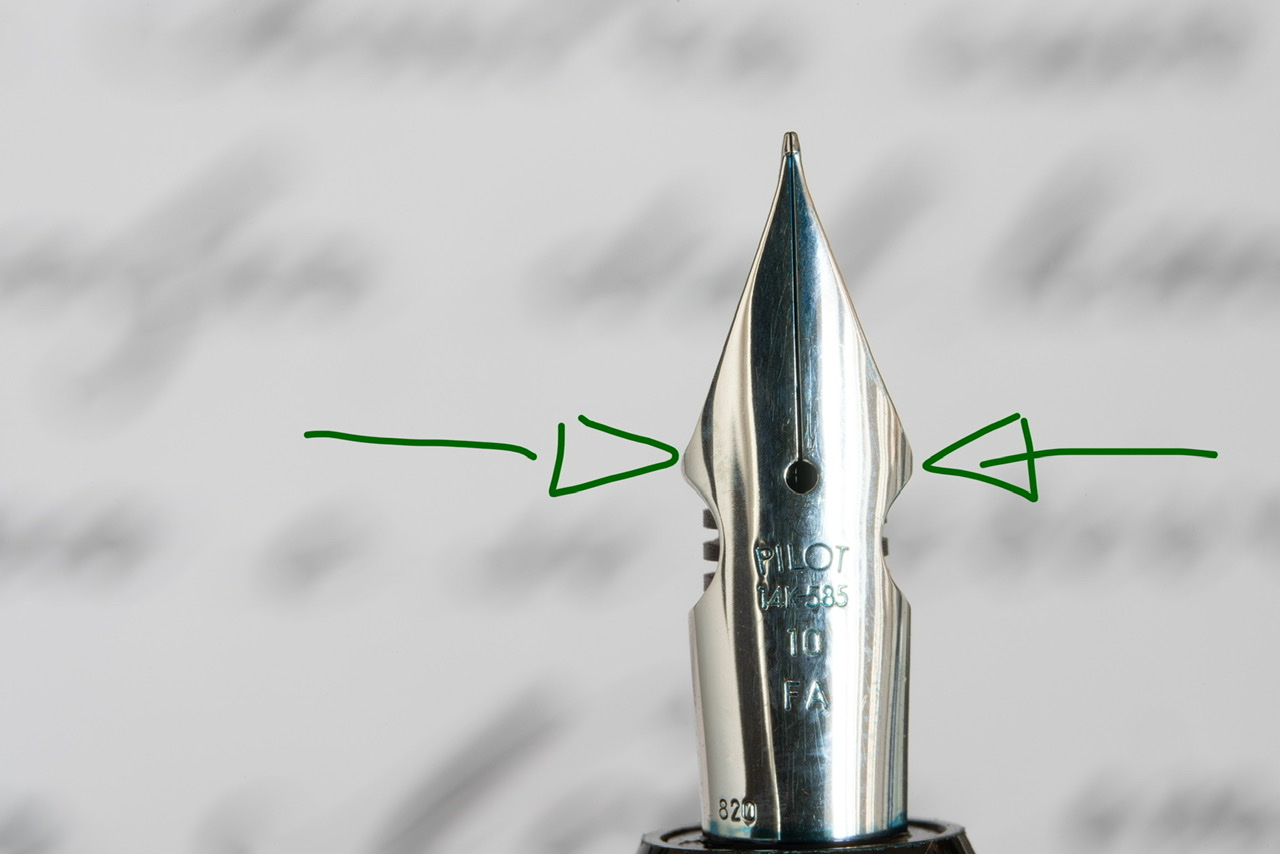 sulla mia Pilot 912 con pennino FA il tratto iniziale diventava sempre più grande e osservando tra i rebbi un pennino FA nuovo e il mio c'era un bella differenza. Inoltre anche la distanza dallalimentatore non era la stessa, si toccava appena, ma quando iniziavo a premere su carta si distanziava molto. Diciamo che il punto di non scrittura arriva appena si solleva anche solo per un pelo in prossimità del foro di sfiato, cosa che se stai facendo pressione può arrivare. Io ho fatto la rettifica con le mani a pennino sfilato dall'alimentatore, cosa che diventa ancora più pericolosa se non la sai fare.