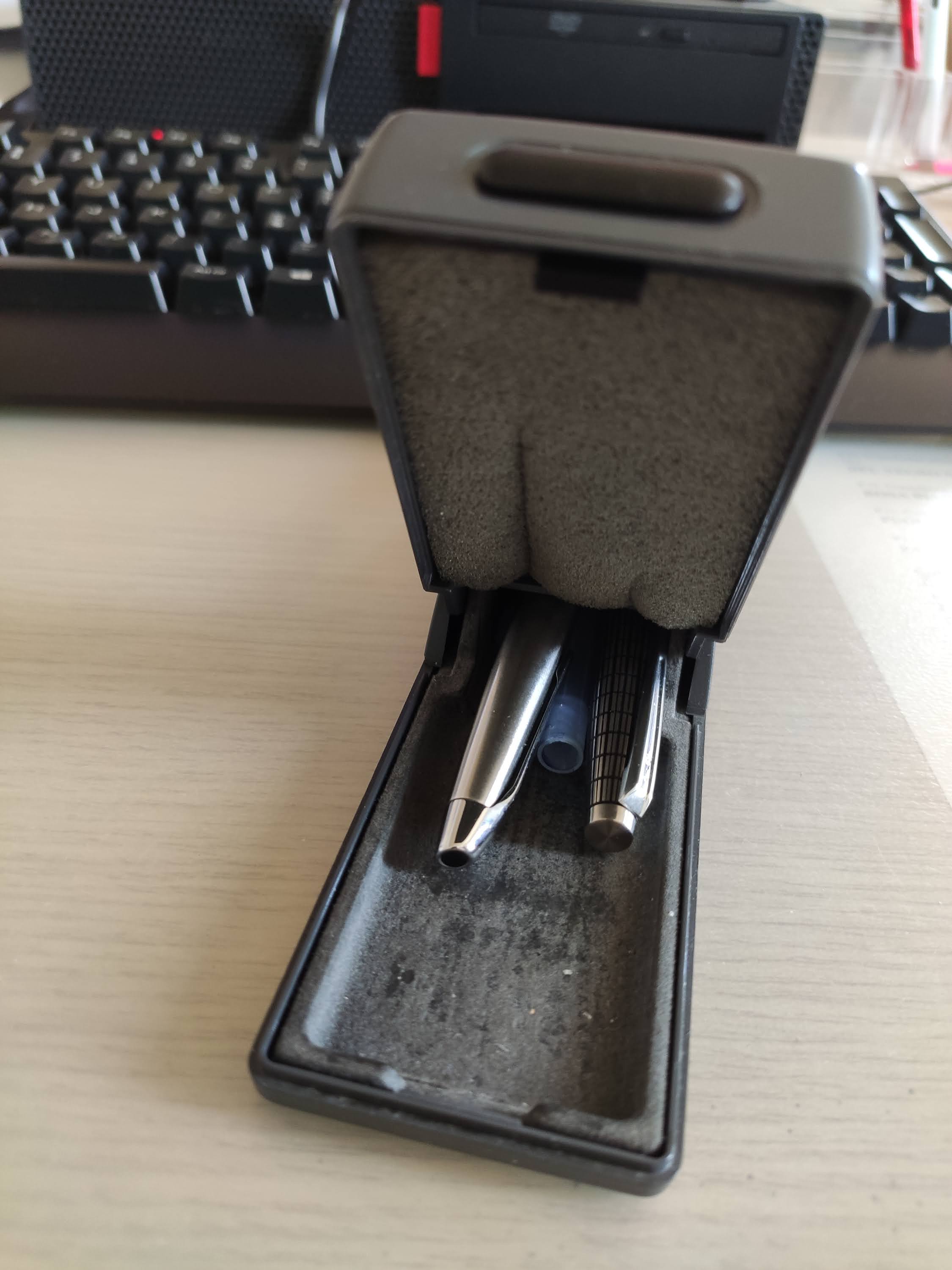 Io ne uso due per andare in giro. Un Samsonite rigido imbottito in gommapiuma, ci stanno due penne comodamente e non si muovono perché l'imbottitura le tiene ferme. Può stare nella tasca interna di una giacca.