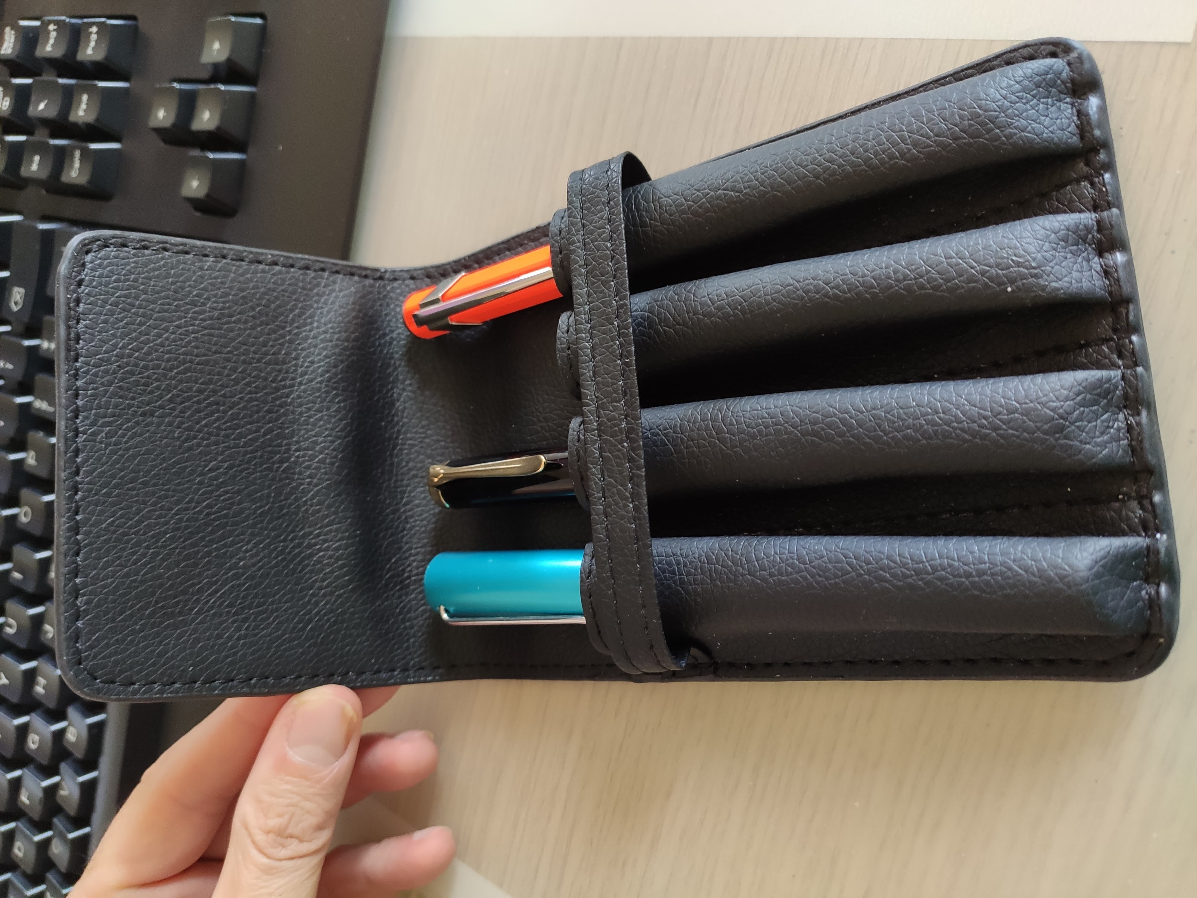 E poi uso anche un portapenne in ecopelle a 4 posti, comprato su noto sito di ecommerce cinese (7 € compresa spedizione), che tengo nella borsa da ufficio con alcune penne da battaglia. Comodo perché le penne sono separate, non c'è rischio che sbattano l'una sull'altra. E' grande ma mi va bene perché ne porto via 4 e non c'è rischio di restare a secco.