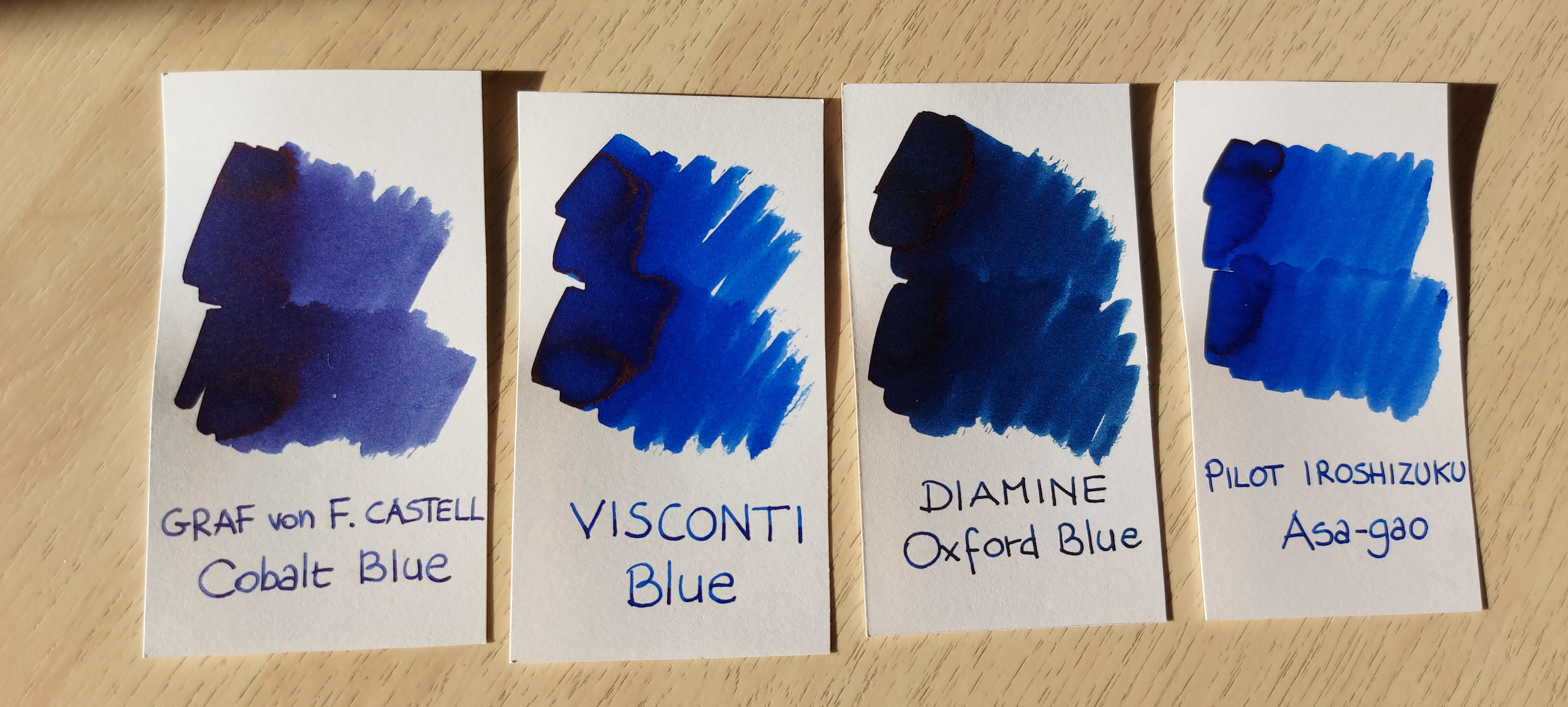 Io adoro il Visconti blu. Un blu acceso dal comportamento perfetto sulla Sailor Sapporo F. Lo uso da 3 anni senza problemi. La boccetta vecchia (60 ml) è conveniente (una boccetta che, per la forma, o si ama o si odia