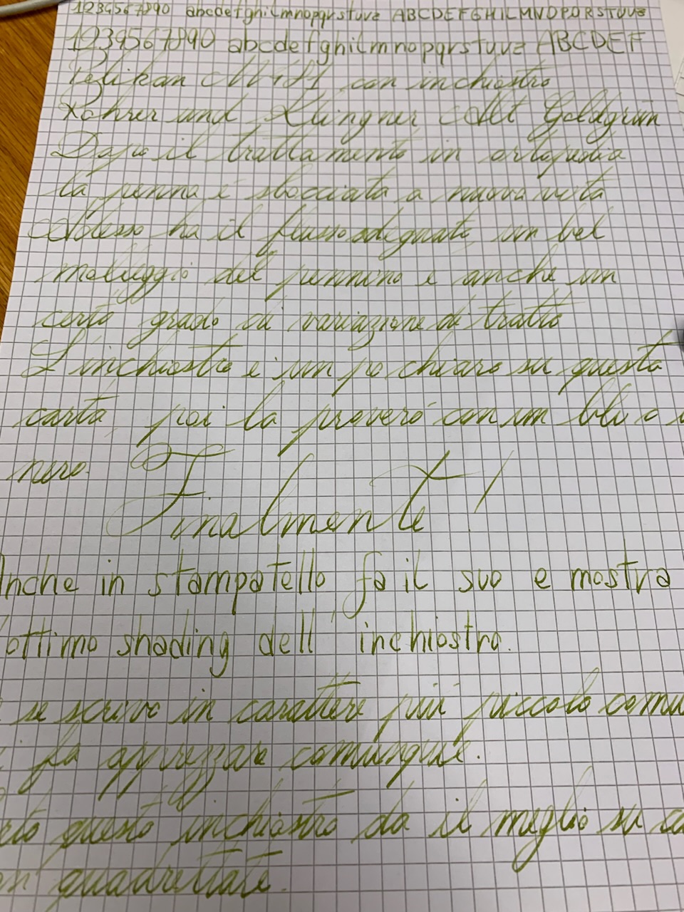 Pennino morbido, scorre bene, ha una buona elasticità e molleggio, nella scrittura in stampatello presenta un flusso medio, ottimo shading dell'inchiostro, nessun problema