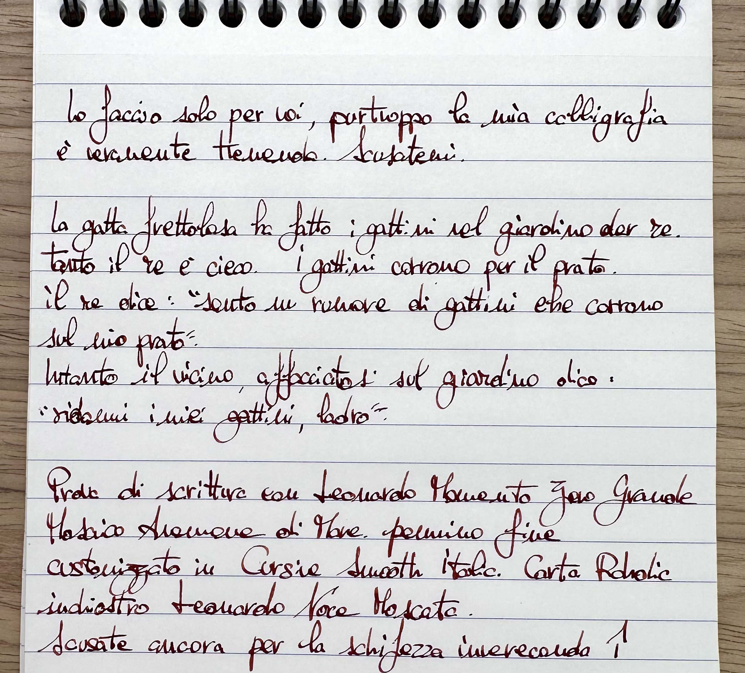 Come già detto altrove, la tua grafia non è per niente male. Piuttosto mi pare che in alcuni punti (credo quelli di tratto più veloce) salti il tratto… è dovuto a flusso scarso o a un cambio di inclinazione fuori sweet spor?
